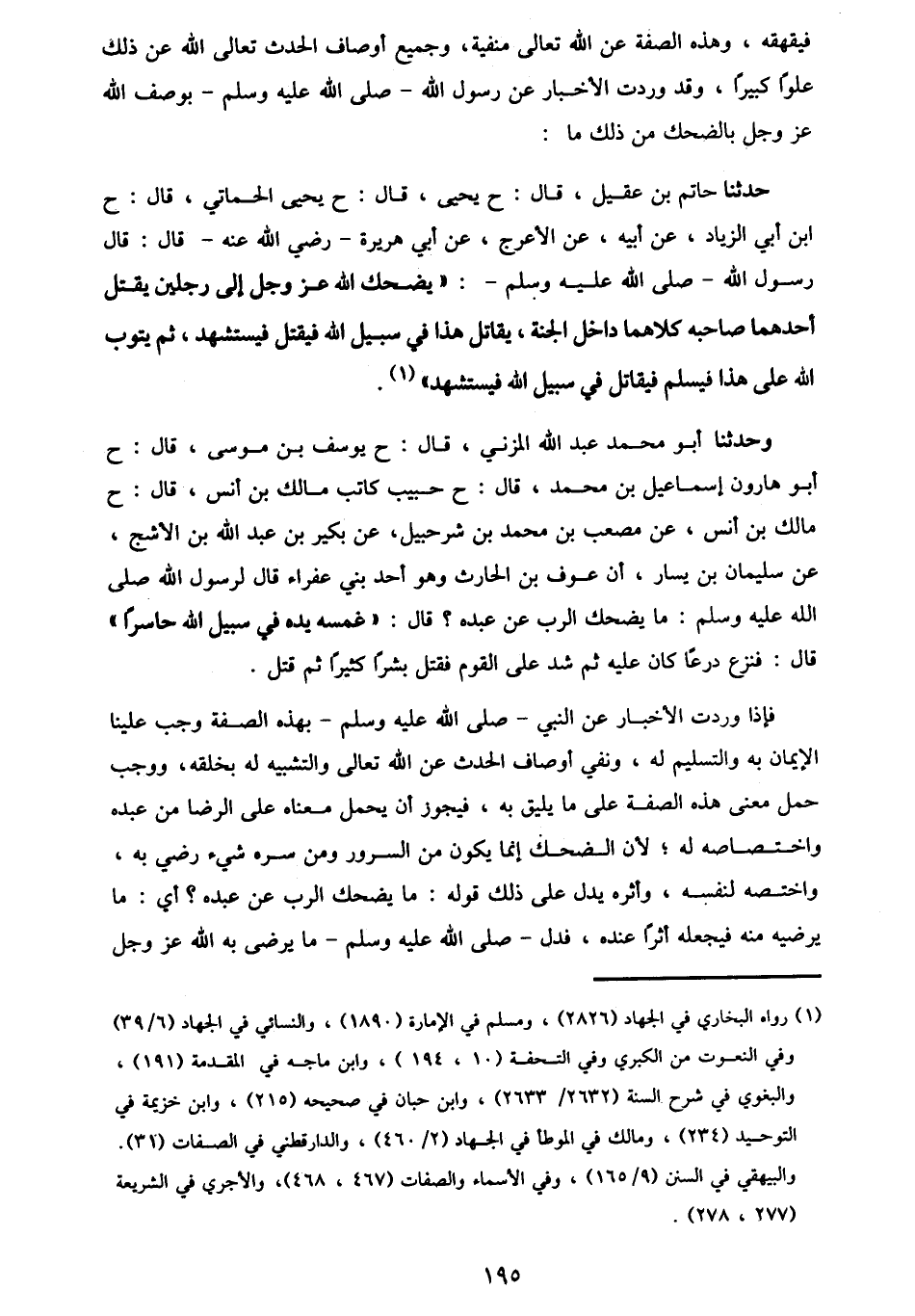 وَحَدَّثَنَا أَبُو مُحَمَّدٍ عَبْدُ اللَّهِ الْمُزَنِيُّ، قَالَ: ح يُوسُفُ بْنُ مُوسَى قَالَ: ح أَبُو هَارُونَ إِسْمَاعِيلُ بْنُ مُحَمَّدٍ قَالَ: ح حَبِيبٌ كَاتِبُ مَالِكِ بْنِ أَنَسٍ قَالَ: ح مَالِكُ بْنُ أَنَسٍ، عَنْ مُصْعَبِ بْنِ مُحَمَّدِ بْنِ شُرَحْبِيلَ، عَنْ بُكَيْرِ بْنِ عَبْدِ اللَّهِ بْنِ الْأَشَجِّ، عَنْ سُلَيْمَانَ بْنِ يَسَارٍ، أَنَّ عَوْفَ بْنَ الْحَارِثِ، وَهُوَ أَحَدُ بَنِي عَفْرَاءَ، قَالَ لِرَسُولِ اللَّهِ صَلَّى اللهُ عَلَيْهِ وَسَلَّمَ: §مَا يُضْحِكُ الرَّبَّ عَنْ عَبْدِهِ؟ قَالَ: «غَمْسَةُ يَدِهِ فِي سَبِيلِ اللَّهِ حَاسِرًا» قَالَ: فَنَزَعَ دِرْعًا كَانَ عَلَيْهِ، ثُمَّ شَدَّ عَلَى الْقَوْمِ، فَقَتَلَ بَشَرًا كَثِيرًا، ثُمَّ قُتِلَ" فَإِذَا وَرَدَتِ الْأَخْبَارُ عَنِ النَّبِيِّ صَلَّى اللهُ عَلَيْهِ وَسَلَّمَ بِهَذِهِ الصِّفَةِ، وَجَبَ عَلَيْنَا الْإِيمَانُ بِهِ، وَالتَّسْلِيمُ لَهُ، وَنَفْيُ أَوْصَافِ الْحَدَثِ عَنِ اللَّهِ تَعَالَى، وَالتَّشْبِيهِ لَهُ بِخَلْقِهِ، وَوَجَبَ حَمْلُ مَعْنَى هَذِهِ الصِّفَةِ عَلَى مَا يَلِيقُ بِهِ، فَيَجُوزُ أَنْ يُحْمَلَ مَعْنَاهُ عَلَى الرِّضَا عَنْ عَبْدِهِ، وَاخْتِصَاصِهِ لَهُ؛ لِأَنَّ الضَّحِكَ إِنَّمَا يَكُونُ مِنَ السُّرُورِ، وَمَنْ سَرَّهُ شَيْءٌ رَضِيَ بِهِ، وَاخْتَصَّهُ لِنَفْسِهِ، وَأَثَرُهُ يَدُلُّ عَلَى ذَلِكَ قَوْلُهُ: مَا يُضْحِكُ الرَّبَّ عَنْ عَبْدِهِ؟ أَيْ: مَا يُرْضِيهِ مِنْهُ، فَيَجْعَلُهُ أَثَرًا عِنْدَهُ، فَدَلَّ صَلَّى اللهُ عَلَيْهِ وَسَلَّمَ مَا يَرْضَى بِهِ اللَّهُ عَزَّ وَجَلَّ