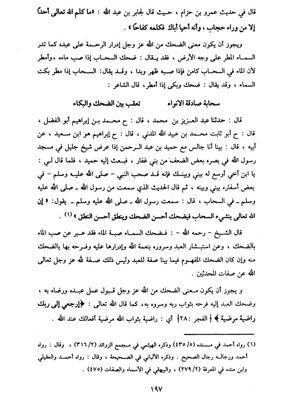 قَالَ: حَدَّثَنَا عَبْدُ الْعَزِيزِ بْنُ مُحَمَّدٍ، قَالَ: ح مُحَمَّدُ بْنُ إِبْرَاهِيمَ أَبُو الْفَضْلِ قَالَ: ح أَبُو ثَابِتٍ مُحَمَّدُ بْنُ عُبَيْدِ اللَّهِ الْمَدَنِيُّ قَالَ: ح إِبْرَاهِيمُ هُوَ ابْنُ سَعِيدٍ، عَنْ أَبِيهِ قَالَ: بَيْنَا أَنَا جَالِسٌ مَعَ حُمَيْدِ بْنِ عَبْدِ الرَّحْمَنِ إِذْ عَرَضَ شَيْخٌ جَلِيلٌ فِي مَسْجِدِ رَسُولِ اللَّهِ، فِي بَصَرِهِ بَعْضُ الضَّعْفِ، مِنْ بَنِي غِفَارٍ، فَبَعَثَ إِلَيْهِ حُمَيْدٌ، فَلَمَّا قَالَ لِي: يَا ابْنَ أَخِي، أَوْسَعَ لَهُ بَيْنِي وَبَيْنَكَ، فَإِنَّهُ قَدْ صَحِبَ النَّبِيَّ صَلَّى اللهُ عَلَيْهِ وَسَلَّمَ فِي بَعْضِ أَسْفَارِهِ بَيْنِي وَبَيْنَهُ، ثُمَّ قَالَ الْحَدِيثَ الَّذِي سَمِعْتُ مِنْ رَسُولِ اللَّهِ صَلَّى اللهُ عَلَيْهِ وَسَلَّمَ فِي السَّحَابِ قَالَ: سَمِعْتُ رَسُولَ اللَّهِ صَلَّى اللهُ عَلَيْهِ وَسَلَّمَ، يَقُولُ: «إِنَّ §اللَّهَ تَعَالَى يُنْشِئُ السَّحَابَ، فَيَضْحَكُ أَحْسَنَ الضَّحِكِ، وَيَنْطِقُ أَحْسَنَ النُّطْقِ» قَالَ الشَّيْخُ رَحِمَهُ اللَّهُ: فَضَحِكُ السَّمَاءِ صَبَّةُ الْمَاءِ، فَقَدْ عَبَّرَ عَنْ صَبِّ الْمَاءِ بِالضَّحِكِ، وَعَنِ اسْتِبْشَارِ الْعَبْدِ وَسُرُورِهِ بِنِعْمَةِ اللَّهِ، وَإِدْرَارِهَا عَلَيْهِ، وَفَرَحِهِ بِهَا بِالضَّحِكِ مِنْهُ، وَإِنْ كَانَ الضَّحِكُ الْمَفْهُومُ فِيمَا بَيَّنَّا صِفَةً لِلْعَبْدِ، وَلَيْسَ ذَلِكَ صِفَةً لِلَّهِ عَزَّ وَجَلَّ تَعَالَى اللَّهُ عَنْ صِفَاتِ الْمُحَدَثِينَ وَيَجُوزُ أَنْ يَكُونَ مَعْنَى الضَّحِكِ مِنَ اللَّهِ عَزَّ وَجَلَّ قَبُولَ عَمَلِ عَبْدِهِ، وَرِضَاهُ بِهِ، وَضَحِكُ الْعَبْدِ إِلَيْهِ فَرْحَهُ بِثَوَابِ رَبِّهِ، وَسُرُورَهُ بِهِ، كَمَا قَالَ اللَّهُ تَعَالَى: {ارْجِعِي إِلَى رَبِّكِ رَاضِيَةً مَرْضِيَّةً} [الفجر: 28] ، أَيْ: رَاضِيَةً بِثَوَابِ اللَّهِ، مَرْضِيَّةً أَفْعَالُكِ عِنْدَ اللَّهِ -[198]-. وَيَجُوزُ أَنْ يَكُونَ مَعْنَى الضَّحِكِ الْحُسْنَ، وَالْبَهَاءَ، وَالنَّضْرَةَ، كَمَا يُقَالُ: ضَحِكَتِ الشَّمْسُ إِذَا شَرُقَ ضَوْءُهَا، وَضَحِكَ النَّهَارُ إِذَا أَضَاءَ، وَضَحِكَتِ الْأَرْضُ إِذَا اهْتَزَّتْ بِالنَّوْرِ وَالنَّبَاتِ. قَالَ الْأَعْشَى: