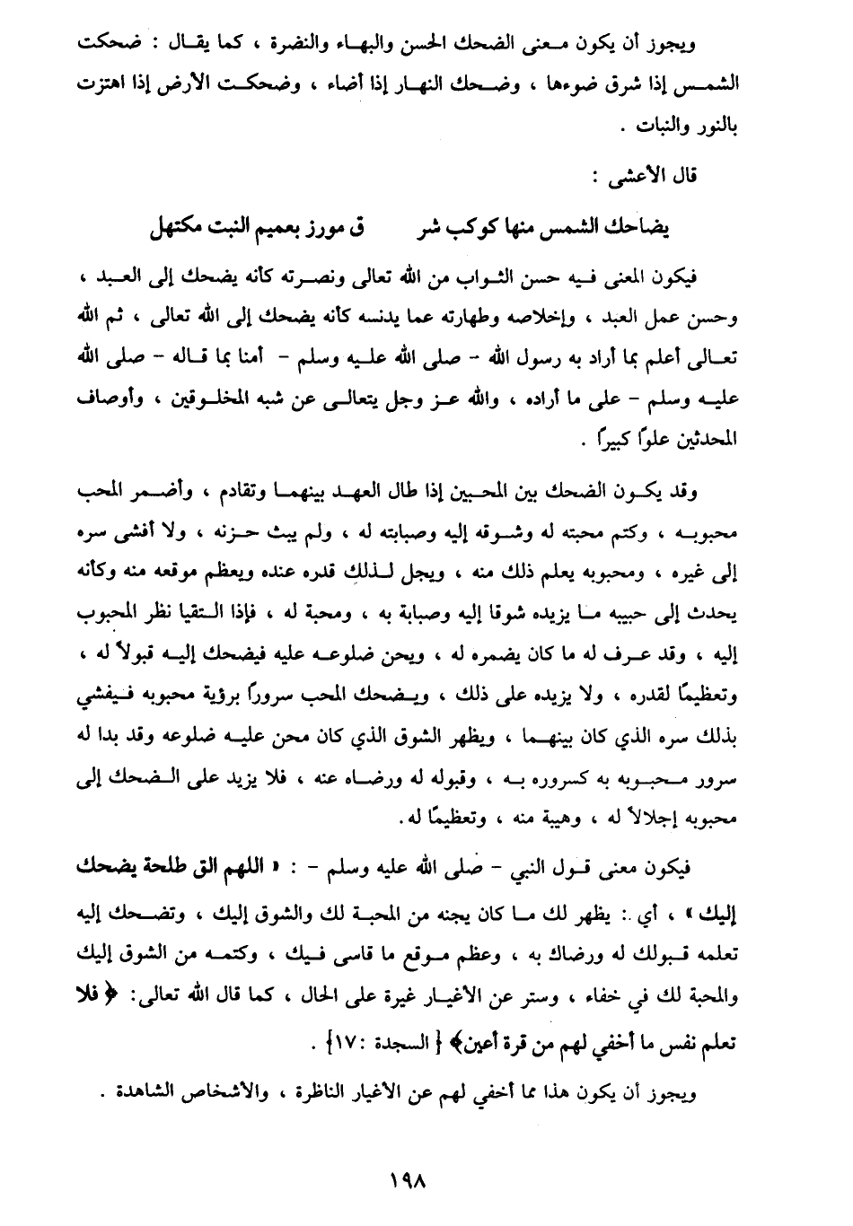 @ 198@ويجوز أن يكون معنى الضحك الحسن والبهاء والنضرة ، كما يقال : ضحكت الشمس إذا شرق ضوءها ، وضحك النهار إذا اضاء ، وضحكت الأرض إذا اهتزت بالنور والنبات.