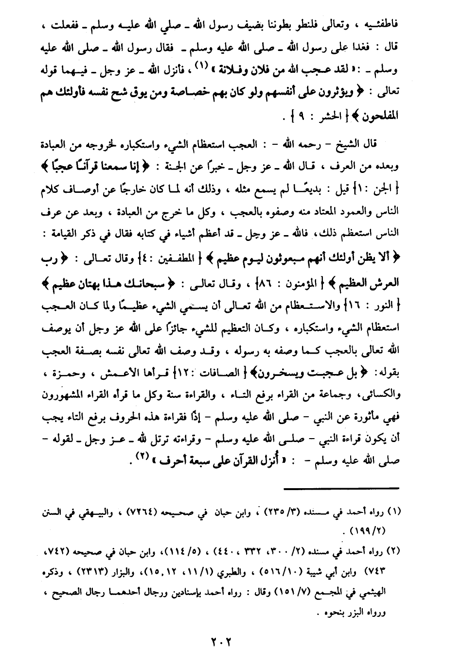 |قال الشيخ رحمه الله : العجب استعظام الشيء واستكباره لخروجه من العبادة وبعده من العرف ، قال الله عز وجل خبرا عن الجنة : {إنا سمعنا قرآنا عجبا} [الجن : 1] قيل : بديعا لم يسمع مثله ، وذلك انه لما كان خارجا عن أوصاف كلام الناس والعمود المعتاد منه وصفوة بالعجب ، وكل ما خرج من العبادة ، وبعد عن عرف الناس استعظم ذلك ، فالله عز وجل قد اعظم أشياء في كتابه فقال في ذكر القيامة : {ألا يظن أولئك انهم مبعوثون ليوم عظيم} [المطففين : 4] وقال تعالى : {رب العرش العظيم} [المؤمنون : 86] ، وقال تعالى : {سبحانك هذا بهتان عظيم} [النور : 16] والاستعظام من الله تعالى أن يسمي الشيء عظيما ولما كان العجب استعظام الشيء واستكباره ، وكان التعظيم للشيء جائزا على الله عز وجل أن يوصف الله تعالى بالعجب كما وصفه به رسوله ، وقد وصف الله تعالى نفسه بصفة العجب بقوله : {بل عجبت ويسخرون} [الصافات : 12] قرأها الأعمش ، وحمزة ، والكسائي ، وجماعة من القراء برفع التاء ، والقراءة سنة وكل ما قرأه القراء المشهورون فهي مأثورة عن النبي صلى الله عليه وسلم إذا فقراءة هذه الحروف برفع التاء يجب أن يكون قراءة النبي صلى الله عليه وسلم وقراءته ترتل لله عز وجل لقوله صلى الله عليه وسلم : انزل القرآن على سبعة أحرف.
