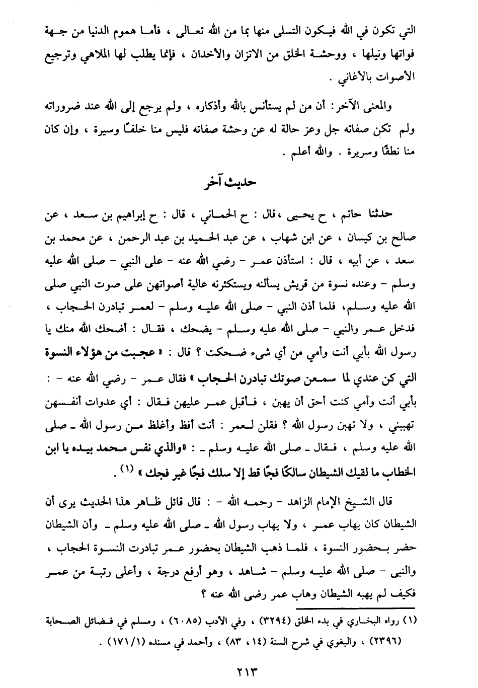 حَدَّثَنَا حَاتِمٌ، ح يَحْيَى قَالَ: ح الْحِمَّانِيُّ قَالَ: ح إِبْرَاهِيمُ بْنُ سَعْدٍ، عَنْ صَالِحِ بْنِ كَيْسَانَ، عَنِ ابْنِ شِهَابٍ، عَنْ عَبْدِ الْحَمِيدِ بْنِ عَبْدِ الرَّحْمَنِ، عَنْ مُحَمَّدِ بْنِ سَعْدٍ، عَنْ أَبِيهِ قَالَ: اسْتَأْذَنَ عُمَرُ رَضِيَ اللَّهُ عَنْهُ عَلَى النَّبِيِّ صَلَّى اللهُ عَلَيْهِ وَسَلَّمَ وَعِنْدَهُ نِسْوَةٌ مِنْ قُرَيْشٍ يَسْأَلْنَهُ يَسْتَكْثِرْنَهُ عَالِيَةٌ أَصْوَاتُهُنَّ عَلَى صَوْتِ النَّبِيِّ صَلَّى اللهُ عَلَيْهِ وَسَلَّمَ، فَلَمَّا أَذِنَ النَّبِيُّ صَلَّى اللهُ عَلَيْهِ وَسَلَّمَ لِعُمَرَ تَبَادَرْنَ الْحِجَابَ، فَدَخَلَ عُمَرُ وَالنَّبِيُّ صَلَّى اللهُ عَلَيْهِ وَسَلَّمَ يَضْحَكُ، فَقَالَ: أَضْحَكَ اللَّهُ سِنَّكَ يَا رَسُولَ اللَّهِ بِأَبِي أَنْتَ وَأُمِّي مِنْ أَيِّ شَيْءٍ ضَحِكْتَ؟ قَالَ: §«عَجِبْتُ مِنْ هَؤُلَاءِ النِّسْوَةِ اللَّاتِي كُنَّ عِنْدِي لَمَّا سَمِعْنَ صَوْتَكَ تَبَادَرْنَ الْحِجَابَ» ، فَقَالَ عُمَرُ رَضِيَ اللَّهُ عَنْهُ: بِأَبِي أَنْتَ وَأُمِّي كُنْتَ أَحَقَّ أَنْ يَهَبْنَ، فَأَقْبَلَ عُمَرُ عَلَيْهِنَّ فَقَالَ: أَيْ عَدُوَّاتِ أَنْفُسِهِنَّ تَهَبْنَنِي وَلَا تَهَبْنَ رَسُولَ اللَّهِ؟ فَقُلْنَ لِعُمَرَ: أَنْتَ أَفَظُّ وَأَغْلَظُ مِنْ رَسُولِ اللَّهِ صَلَّى اللهُ عَلَيْهِ وَسَلَّمَ، فَقَالَ صَلَّى اللهُ عَلَيْهِ وَسَلَّمَ: «وَالَّذِي نَفْسُ مُحَمَّدٍ بِيَدِهِ يَا ابْنَ الْخَطَّابِ مَا لَقِيَكَ الشَّيْطَانُ سَالِكًا فَجًّا قَطُّ إِلَّا سَلَكَ فَجًّا غَيْرَ فَجِّكَ» قَالَ الشَّيْخُ الْإِمَامُ الزَّاهِدُ رَحِمَهُ اللَّهُ: قَالَ قَائِلٌ: ظَاهِرُ هَذَا الْحَدِيثِ يَرَى أَنَّ الشَّيْطَانَ كَانَ يَهَابُ عُمَرَ، وَلَا يَهَابُ رَسُولَ اللَّهِ صَلَّى اللهُ عَلَيْهِ وَسَلَّمَ، وَأَنَّ الشَّيْطَانَ حَضَرَ بِحُضُورِ النِّسْوَةِ، فَلَمَّا ذَهَبَ الشَّيْطَانُ بِحُضُورِ عُمَرَ تَبَادَرَتِ النِّسْوَةُ الْحِجَابَ، وَالنَّبِيُّ صَلَّى اللهُ عَلَيْهِ وَسَلَّمَ شَاهِدٌ، وَهُوَ أَرْفَعُ دَرَجَةً، وَأَعْلَى رُتْبَةً مِنْ عُمَرَ، فَكَيْفَ لَمْ يَهَبْهُ الشَّيْطَانُ، وَهَابَ عُمَرَ رَضِيَ اللَّهُ عَنْهُ؟ -[214]- فَالْجَوَابُ: أَنَّهُ لَيْسَ فِي الْحَدِيثِ مَا يَدُلُّ عَلَى حُضُورِ الشَّيْطَانِ حَضْرَةَ النَّبِيِّ صَلَّى اللهُ عَلَيْهِ وَسَلَّمَ، وَإِنَّمَا أَخْبَرَ النَّبِيُّ صَلَّى اللهُ عَلَيْهِ وَسَلَّمَ عُمَرَ رَضِيَ اللَّهُ عَنْهُ بِعُذْرِهِنَّ فِي هَيْبَتِهِنَّ إِيَّاهُ، فَقَالَ: وَكَيْفَ لَا يَهَبْنَكَ، وَالشَّيْطَانُ يَهَابُكَ، وَلَوْ كَانَ الْحَالُ يُوجِبُ حُضُورَ الشَّيْطَانِ لَكَانَتِ الْحَالُ حَالَ مَعْصِيَةٍ، وَلَوْ كَانَ كَذَلِكَ لَكَانَ صَلَّى اللهُ عَلَيْهِ وَسَلَّمَ يَنْهَى عَنْ ذَلِكَ، وَيُنْكِرُ عَلَيْهِنَّ، فَلَمَّا لَمْ يَفْعَلْ دَلَّ أَنَّهَا لَمْ تَكُنْ حَالَ عِصْيَانِ اللَّهِ، فَيَحْضُرُ الشَّيْطَانُ قَالَ الشَّيْخُ: وَمَعْنَى قَوْلِهِ: «عَالِيَةٌ أَصْوَاتُهُنَّ» أَرْفَعُ مِنْ صَوْتِهِ، وَيَجُوزُ أَنْ يَكُونَ ذَلِكَ قَبْلَ نُزُولِ النَّهْيِ عَنْ رَفْعِ الصَّوْتِ فَوْقَ صَوْتِ النَّبِيِّ صَلَّى اللهُ عَلَيْهِ وَسَلَّمَ قَالَ الشَّيْخُ رَحِمَهُ اللَّهُ: وَيَجُوزُ أَنْ يَكُونَ الشَّيْطَانُ كَانَ يَخَافُ عُمَرَ، وَلَا يَخَافُ النَّبِيَّ صَلَّى اللهُ عَلَيْهِ وَسَلَّمَ؛ لِأَنَّهُ لَوْ خَافَ النَّبِيَّ صَلَّى اللهُ عَلَيْهِ وَسَلَّمَ لَمْ يَخْلُ خَوْفُهُ مِنْهُ وَهَيْبَتُهُ إِيَّاهُ مِنْ أَحَدِ وَجْهَيْنِ: إِمَّا خَوْفُ إِجْلَالٍ وَتَعْظِيمٍ، وَهُوَ فَضْلُهُ، وَالشَّيْطَانُ أَبْعَدُ شَيْءٍ مِنَ الْفَضَائِلِ، أَوْ يَكُونُ خَوْفَ عُقُوبَةٍ يُحِلُّهَا بِهِ، وَالنَّبِيُّ صَلَّى اللهُ عَلَيْه