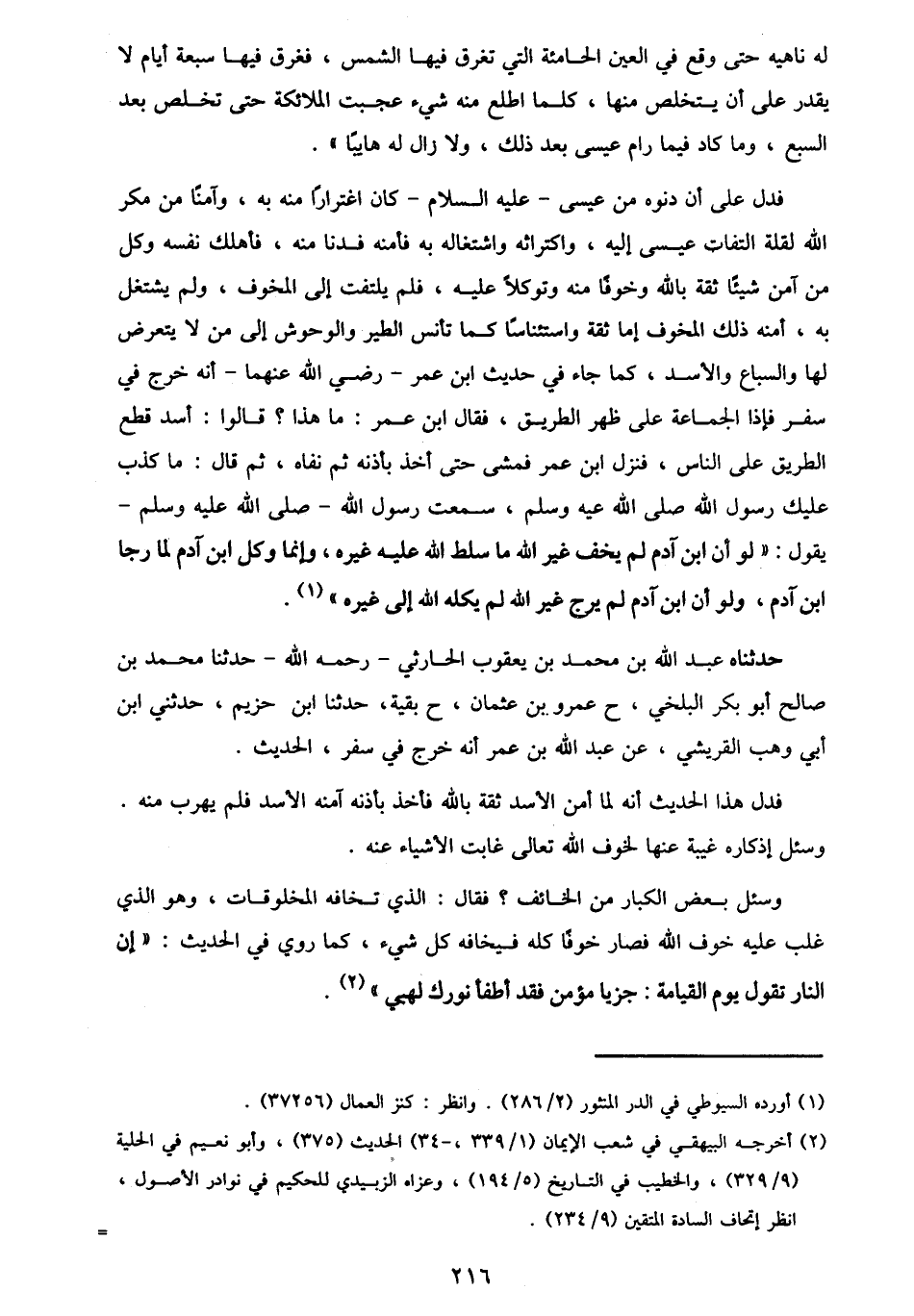 كَمَا جَاءَ فِي حَدِيثِ ابْنِ عُمَرَ رَضِيَ اللَّهُ عَنْهُمَا، أَنَّهُ خَرَجَ فِي سَفَرٍ، فَإِذَا الْجَمَاعَةُ عَلَى ظَهْرِ الطَّرِيقِ، فَقَالَ ابْنُ عُمَرَ: مَا هَذَا؟ قَالُوا: أَسَدٌ قَطَعَ الطَّرِيقَ عَلَى النَّاسِ، فَنَزَلَ ابْنُ عُمَرَ فَمَشَى حَتَّى أَخَذَ بِأُذُنِهِ، ثُمَّ نَفَاهُ، ثُمَّ قَالَ: مَا كَذَبَ عَلَيْكَ رَسُولُ اللَّهِ صَلَّى اللهُ عَلَيْهِ وَسَلَّمَ، سَمِعْتُ رَسُولَ اللَّهِ صَلَّى اللهُ عَلَيْهِ وَسَلَّمَ يَقُولُ: §«لَوْ أَنَّ ابْنَ آدَمَ لَمْ يَخَفْ غَيْرَ اللَّهِ مَا سَلَّطَ اللَّهُ عَلَيْهِ غَيْرَهُ، وَإِنَّمَا وُكِلَ ابْنُ آدَمَ لَمَّا رَجَا ابْنَ آدَمَ، وَلَوْ أَنَّ ابْنَ آدَمَ لَمْ يَرْجُ غَيْرَ اللَّهِ لَمْ يَكِلْهُ اللَّهُ إِلَى غَيْرِهِ» حَدَّثَنَاهُ عَبْدُ اللَّهِ بْنُ مُحَمَّدِ بْنِ يَعْقُوبَ الْحَارِثِيُّ رَحِمَهُ اللَّهُ، حَدَّثَنَا مُحَمَّدُ بْنُ صَالِحٍ أَبُو بَكْرٍ الْبَلْخِيُّ، ح عَمْرُو بْنُ عُثْمَانَ، ح بَقِيَّةُ، حَدَّثَنَا ابْنُ حُزَيْمٍ، حَدَّثَنِي ابْنُ أَبِي وَهْبٍ الْقُرَيْشِيُّ، عَنْ عَبْدِ اللَّهِ بْنِ عُمَرَ، أَنَّهُ خَرَجَ فِي سَفَرٍ، الْحَدِيثَ فَدَلَّ هَذَا الْحَدِيثُ أَنَّهُ لَمَّا أَمِنَ الْأَسَدَ ثِقَةً بِاللَّهِ، فَأَخَذَ بِأُذُنِهِ أَمِنَهُ الْأَسَدُ فَلَمْ يَهْرَبْ مِنْهُ، وَسَهُلَ إِنْكَارُهُ غَيْبَةً عَنْهَا لِخَوْفِ اللَّهِ تَعَالَى، غَابَتِ الْأَشْيَاءُ عَنْهُ. وَسُئِلَ بَعْضُ الْكِبَارِ مَنِ الْخَائِفُ؟ فَقَالَ: الَّذِي تَخَافُهُ الْمَخْلُوقَاتُ، وَهُوَ الَّذِي غَلَبَ عَلَيْهِ خَوْفُ اللَّهِ، فَصَارَ خَوْفًا كُلَّهُ، فَيَخَافُهُ كُلُّ شَيْءٍ، كَمَا رُوِيَ فِي الْحَدِيثِ: " إِنَّ النَّارَ تَقُولُ يَوْمَ الْقِيَامَةِ: جُزْ يَا مُؤْمِنُ، فَقَدْ أَطْفَأَ نُورُكَ لَهَبِي"