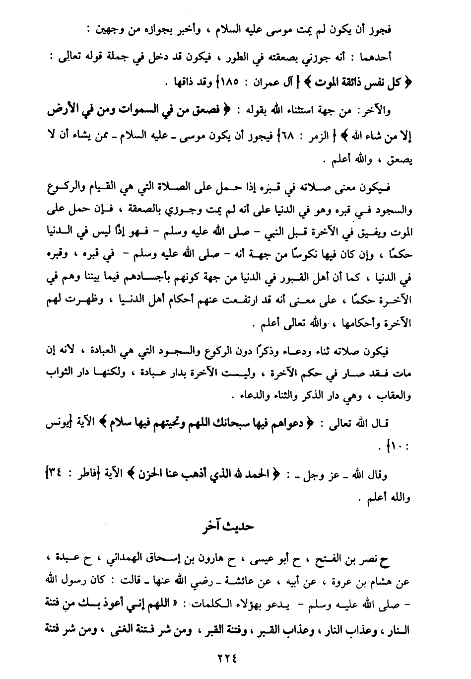 ح نَصْرُ بْنُ الْفَتْحِ، ح أَبُو عِيسَى، ح هَارُونُ بْنُ إِسْحَاقَ الْهَمْدَانِيُّ، ح عَبْدَةُ، عَنْ هِشَامِ بْنِ عُرْوَةَ، عَنْ أَبِيهِ، عَنْ عَائِشَةَ، رَضِيَ اللَّهُ عَنْهَا قَالَتْ: كَانَ رَسُولُ اللَّهِ صَلَّى اللهُ عَلَيْهِ وَسَلَّمَ يَدْعُو بِهَؤُلَاءِ الْكَلِمَاتِ: «اللَّهُمَّ إِنِّي §أَعُوذُ بِكَ مِنْ فِتْنَةِ النَّارِ، وَعَذَابِ النَّارِ، وَعَذَابِ الْقَبْرِ، وَفِتْنَةِ الْقَبْرِ، وَمِنْ شَرِّ فِتْنَةِ الْغِنَى، وَمِنْ شَرِّ فِتْنَةِ -[225]- الْفَقْرِ، وَمِنْ سُوءِ الْمَسِيحِ الدَّجَّالِ، اللَّهُمَّ اغْسِلْ خَطَايَايَ بِمَاءِ الثَّلْجِ، وَالْبَرَدِ، وَنَقِّ قَلْبِي مِنَ الْخَطَايَا كَمَا نَقَّيْتَ الثَّوْبَ الْأَبْيَضَ مِنَ الدَّنَسِ، وَبَاعِدْ بَيْنِي وَبَيْنَ خَطَايَايَ كَمَا بَاعَدْتَ بَيْنَ الْمَشْرِقِ وَالْمَغْرِبِ. اللَّهُمَّ إِنِّي أَعُوذُ بِكَ مِنَ الْكَسَلِ وَالْهَرَمِ وَالْمَأْثَمِ وَالْمَغْرَمِ» قَالَ الشَّيْخُ رَحِمَهُ اللَّهُ: قَوْلُهُ صَلَّى اللهُ عَلَيْهِ وَسَلَّمَ: «أَعُوذُ بِكَ مِنْ فِتْنَةِ النَّارِ» فَالْفِتْنَةُ تَنْصَرِفُ عَلَى وُجُوهٍ: أَحَدُهَا: وَهُوَ الْأَلْيَنُ فِي هَذَا الْمَكَانِ هِيَ التَّصْفِيَةُ وَالتَّهْذِيبُ، يُقَالُ: هَذَا ذَهَبٌ مَفْتُونٌ إِذَا دَخَلَ النَّارَ فَنُفِيَ عَنْهُ الْخَبَثُ، وَيُقَالُ لِلصَّائِغِ: الْفَاتِنُ؛ لِأَنَّهُ يَفْتِنُ الذَّهَبَ وَالْفِضَّةَ، أَيْ يُصَفِّيهِمَا بِالنَّارِ، وَيُزِيلُ الْخَبَثَ عَنْهُمَا، كَذَا قَالَ أَهْلُ اللُّغَةِ. وَمَنْ ذَلِكَ قَوْلُ اللَّهِ تَعَالَى {وَلَقَدْ فَتَنَّا سُلَيْمَانَ} [ص: 34] ، مَعْنَاهُ هَذَّبْنَاهُ وَصَفَّيْنَاهُ مِنَ الْأَوْصَافِ الذَّمِيمَةِ , وَكَذَلِكَ قَوْلُهُ تَعَالَى {وَظَنَّ دَاوُدُ أَنَّمَا فَتَنَّاهُ} ، أَيْ: عَلِمَ أَنَّا هَذَّبْنَاهُ، وَأَدَّبْنَاهُ، وَنَبَّهْنَاهُ , فَيَجُوزُ أَنْ يَكُونَ مَعْنَى قَوْلِهِ صَلَّى اللهُ عَلَيْهِ وَسَلَّمَ: «أَعُوذُ بِكَ مِنْ فِتْنَةِ النَّارِ» أَيْ: أَنْ يَكُونَ تَصْفِيَتِي وَتَهْذِيبِي بِالنَّارِ وَتَأْدِيبِي بِهَا، وَذَلِكَ أَنَّ الْخَطَايَا وَالذُّنُوبَ يُكَفِّرُهَا اللَّهُ بِالْمِحَنِ وَالْبَلَايَا فِي الدُّنْيَا، وَبِالْمَصَائِبِ وَالْأَمْرَاضِ؛ -[226]- قَالَ النَّبِيُّ صَلَّى اللهُ عَلَيْهِ وَسَلَّمَ: «لَا يَزَالُ الْبَلَاءُ بِالْمُؤْمِنِ حَتَّى يَمْشِيَ عَلَى الْأَرْضِ مَا لَهُ مِنْ ذَنْبٍ» وَتَكُونُ الْكَفَّارَةُ وَالتَّمْحِيصُ بَعْدَ الْمَوْتِ فِي الْقَبْرِ، وَفِي أَهْوَالِ الْقِيَامَةِ، وَيَكُونُ بِالْعَفْوِ وَالتَّجَاوُزِ فَضْلًا مِنَ اللَّهِ، وَيَكُونُ شَفَاعَةُ الْأَنْبِيَاءِ وَالْأَوْلِيَاءِ، فَإِنْ لَمْ يَكُنْ بِهَذِهِ الْأَسْبَابِ فَبِإِدْخَالِ النَّارِ، فَكَأَنَّهُ قَالَ: أَعُوذُ بِكَ مِنْ أَنْ تَكُونَ فِتْنَتِي وَتَمْحِيصِي مِنْ خَطَايَايَ وَكَفَّارَةُ ذُنُوبِي تَصْفِيَتِي مِنْهَا بِالنَّارِ، وَلَكِنْ بِعَفْوِكَ وَفَضْلِكَ وَكَرَمِكَ إِمَّا تَوْفِيقًا لِلتَّوْبَةِ مِنْهَا فِي الدُّنْيَا، أَوِ التَّجَاوُزَ عَنْهَا فِي الْآَخِرَةِ، يَدُلُّ عَلَى ذَلِكَ مَا جَاءَ فِي حَدِيثٍ آخَرَ: «أَذِقْنِي بَرْدَ عَفْوِكَ» . وَمَعْنَى قَوْلِهِ صَلَّى اللهُ عَلَيْهِ وَسَلَّمَ: «وَعَذَابِ النَّارِ» أَيْ: أَعُوذُ بِكَ مِنْ أَنْ تُعَاقِبَنِي بِهَا، وَتُعَذِّبَنِي بِالنَّارِ، كَأَنَّهُ يَقُولُ: لَا تَجْعَلْنِي مِنْ أَهْلِ النَّارِ الَّذِينَ هُمْ أَهْلُهَا مِنَ الْكُفَّارِ الْمُلْحِدِينَ، فَإِنَّهُمْ هُمُ الْمُعَذَّبُونَ بِهَا، فَأَمَّا الْمُوَحِّدُونَ فَهُمْ مُؤَدَّبُونَ بِهَا، لَا مُعَذَّبُونَ فِيهَا، الدَّلِيلُ عَلَى ذَلِكَ مَا رُوِيَ أَنَّ أَهْلَ التَّوْحِيدِ إِذَا دَخَلُوا النَّارَ قَالُوا: بِسْمِ الل