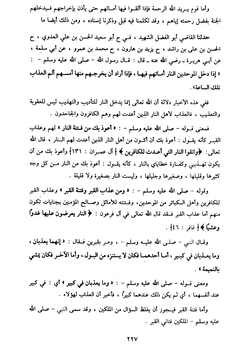 حَدَّثَنَا الْقَاضِي أَبُو الْفَضْلِ الشَّهِيدُ، فِي ح أَبُو سَعِيدٍ الْحَسَنُ بْنُ عَلِيٍّ الْعَدَوِيُّ، ح الْحَسَنُ بْنُ عَلِيِّ بْنِ رَاشِدٍ، ح يَزِيدُ بْنُ هَارُونَ، ح مُحَمَّدُ بْنُ عَمْرٍو، عَنْ أَبِي سَلَمَةَ، عَنْ أَبِي هُرَيْرَةَ، رَضِيَ اللَّهُ عَنْهُ قَالَ: قَالَ رَسُولُ اللَّهِ صَلَّى اللهُ عَلَيْهِ وَسَلَّمَ: «§إِذَا دَخَلَ الْمُوَحِّدُونَ النَّارَ أَمَاتَهُمْ فِيهَا، فَإِذَا أَرَادَ أَنْ يُخْرِجَهُمْ مِنْهَا أَمَسَّهُمْ أَلَمَ الْعَذَابِ تِلْكَ السَّاعَةَ» فَفِي هَذِهِ الْأَخْبَارِ دَلَالَةٌ أَنَّ اللَّهَ تَعَالَى إِنَّمَا يُدْخِلُ النَّارَ لِلتَّأَدِيبِ وَالتَّهْذِيبِ لَيْسَ لِلْعُقُوبَةِ وَالتَّعْذِيبِ، فَالْعَذَابُ لِأَهْلِ النَّارِ الَّذِينَ أُعِدَّتْ لَهُمْ، وَهُمُ الْكَافِرُونَ وَالْجَاحِدُونَ. فَمَعْنَى قَوْلِهِ صَلَّى اللهُ عَلَيْهِ وَسَلَّمَ: «أَعُوذُ بِكَ مِنْ فِتْنَةِ النَّارِ» لَهُمْ وَعَذَابُ الْقَبْرِ، كَأَنَّهُ يَقُولُ: أَعُوذُ بِكَ أَنْ أَكُونَ مِنْ أَهْلِ النَّارِ الَّذِينَ أُعِدِّتْ لَهُمُ النَّارُ، قَالَ اللَّهُ تَعَالَى {وَاتَّقُوا النَّارَ الَّتِي أُعِدَّتْ لِلْكَافِرِينَ} [آل عمران: 131] ، وَأَعُوذُ بِكَ مِنْ أَنْ يَكُونَ تَهْذِيبِي وَكَفَّارَةُ خَطَايَايَ بِالنَّارِ، كَأَنَّهُ يَقُولُ: أَعُوذُ بِكَ مِنَ النَّارِ مِنْ كُلِّ وَجْهٍ كَثِيرِهَا وَقَلِيلِهَا وَصَغِيرِهَا وَجَلِيلِهَا، وَلَيْسَتِ النَّارُ بِصَغِيرَةٍ وَلَا قَلِيلَةٍ. وَقَوْلُهُ صَلَّى اللهُ عَلَيْهِ وَسَلَّمَ: «وَمِنْ عَذَابِ الْقَبْرِ وَفِتْنَةِ الْقَبْرِ» ، وَعَذَابُ الْقَبْرِ لِلْكَافِرِينَ، وَأَهْلُ الْكَبَائِرِ مِنَ الْمُوَحِّدِينَ، وَفِتْنَتُهُ لِلْأَمَاثِلِ وَصَالِحِ الْمُؤْمِنِينَ بِجِنَايَاتٍ تَكُونُ مِنْهُمْ، أَمَّا عَذَابُ الْقَبْرِ فَقَدْ قَالَ اللَّهُ تَعَالَى فِي آلِ فِرْعَوْنَ {النَّارُ يُعْرَضُونَ عَلَيْهَا غُدُوًّا وَعَشِيًّا} [غافر: 46] وَقَالَ النَّبِيُّ صَلَّى اللهُ عَلَيْهِ وَسَلَّمَ، وَمَرَّ بِقَبْرَيْنِ، فَقَالَ: «إِنَّهُمَا يُعَذَّبَانِ، وَمَا يُعَذَّبَانِ فِي كَبِيرٍ، أَمَّا أَحَدُهُمَا فَكَانَ لَا يَسْتَنْزِهُ مِنَ الْبَوْلِ، وَأَمَّا الْأَخِرُ فَكَانَ يَمْشِي بِالنَّمِيمَةِ» وَمَعْنَى قَوْلِهِ صَلَّى اللهُ عَلَيْهِ وَسَلَّمَ: «وَمَا يُعَذَّبَانِ فِي كَبِيرٍ» أَيْ: فِي كَبِيرٍ عِنْدَ أَنْفُسِهِمَا، أَيْ لَمْ يَكُنْ ذَلِكَ عِنْدَهُمَا كَبِيرًا، فَأَخْبَرَ أَنَّ الْعَذَابَ لِهَؤُلَاءِ. وَأَمَّا فِتْنَةُ الْقَبْرِ فَيَجُوزُ أَنْ يُغَلَّظَ السُّؤَالُ مِنَ الْمَلَكَيْنِ، وَقَدْ سَمَّى النَّبِيُّ صَلَّى اللهُ عَلَيْهِ وَسَلَّمَ الْمَلَكَيْنِ فَتَّانَيِ الْقَبْرِ