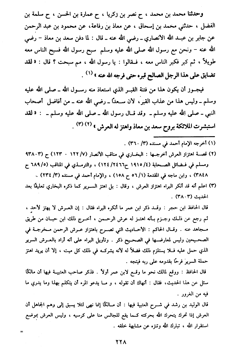 وَحَدَّثَنَا مُحَمَّدُ بْنُ مُحَمَّدٍ، ح نَصْرُ بْنُ زَكَرِيَّا، ح عُمَارَةُ بْنُ الْحَسَنِ، ح سَلَمَةُ بْنُ الْفَضْلِ، حَدَّثَنِي مُحَمَّدُ بْنُ إِسْحَاقَ، عَنْ مُعَاذِ بْنِ رِفَاعَةَ، عَنْ مَحْمُودِ بْنِ عَبْدِ الرَّحْمَنِ، عَنْ جَابِرِ بْنِ عَبْدِ اللَّهِ الْأَنْصَارِيِّ، رَضِيَ اللَّهُ عَنْهُ قَالَ: لَمَّا دُفِنَ سَعْدُ بْنُ مُعَاذٍ رَضِيَ اللَّهُ عَنْهُ، وَنَحْنُ مَعَ رَسُولِ اللَّهِ صَلَّى اللهُ عَلَيْهِ وَسَلَّمَ سَبَّحَ رَسُولُ اللَّهِ، فَسَبَّحَ النَّاسُ مَعَهُ طَوِيلًا، ثُمَّ كَبَّرَ، فَكَبَّرَ النَّاسُ مَعَهُ، فَقَالُوا: يَا رَسُولَ اللَّهِ مِمَّ سَبَّحْتَ؟ قَالَ: «لَقَدْ §تَضَايَقَ عَلَى هَذَا الرَّجُلِ الصَّالِحِ قَبْرُهُ حَتَّى فَرَّجَهُ اللَّهُ عَنْهُ» فَيَجُوزُ أَنْ يَكُونَ هَذَا مِنْ فِتْنَةِ الْقَبْرِ الَّذِي اسْتَعَاذَ مِنْهُ رَسُولُ اللَّهِ صَلَّى اللهُ عَلَيْهِ وَسَلَّمَ، وَلَيْسَ هَذَا مِنْ عَذَابِ الْقَبْرِ، لِأَنَّ سَعْدًا رَضِيَ اللَّهُ عَنْهُ مِنْ أَفَاضِلِ أَصْحَابِ النَّبِيِّ صَلَّى اللهُ عَلَيْهِ وَسَلَّمَ، وَقَدْ قَالَ رَسُولُ اللَّهِ صَلَّى اللهُ عَلَيْهِ وَسَلَّمَ: «لَقَدِ اسْتَبْشَرَتِ الْمَلَائِكَةُ بِرُوحِ سَعْدِ بْنِ مُعَاذٍ، وَاهْتَزَّ لَهُ الْعَرْشُ» -[229]- قَالَ النَّضْرُ بْنُ شُمَيْلٍ: الِاهْتِزَازُ: الْفَرَحُ وَقَوْلُهُ صَلَّى اللهُ عَلَيْهِ وَسَلَّمَ: «وَمِنْ شَرِّ فِتْنَةِ الْغِنَى وَمِنْ شَرِّ فِتْنَةِ الْفَقْرِ» ذَكَرَ الْفِتْنَةُ فِي هَذَيْنِ وَقَرَنَهَا بِالشَّرِّ، وَذَلِكَ أَنَّ الْفِتْنَةَ هَاهُنَا الِابْتِلَاءُ وَالِاخْتِيَارُ، وَقَالَ اللَّهُ تَعَالَى {وَجَعَلْنَا بَعْضَكُمْ لِبَعْضٍ فِتْنَةً} [الفرقان: 20] ، وَقَالَ تَعَالَى فِي شَأْنِ مُوسَى {وَفَتَنَّاكَ فُتُونًا} [طه: 40] أَيِ: اخْتَبَرْنَاكَ وَابْتَلَيْنَاكَ، وَالِاخْتِبَارُ وَالِابْتِلَاءُ لِلْمُؤْمِنِينَ وَالْأَوْلِيَاءِ وَالْأَنْبِيَاءِ لِإِصْلَاحِهِمْ وَإِرَادَةِ الْخَيْرِ بِهِمْ، كَمَا قَالَ فِي شَأْنِ مُوسَى صَلَّى اللهُ عَلَيْهِ وَسَلَّمَ {وَفَتَنَّاكَ فُتُونًا} [طه: 40] وَفِي دَاوُدَ وَسُلَيْمَانَ عَلَيْهِمَا السَّلَامُ {وَظَنَّ دَاوُدُ أَنَّمَا فَتَنَّاهُ} ، {وَلَقَدْ فَتَنَّا سُلَيْمَانَ} [ص: 34] ، اخْتَبَرَهُمْ، وَابْتَلَاهَمْ لِيُهَذِّبَهُمْ وَيُصَفِّيَهُمْ، وَالِاخْتِبَارُ وَالِابْتِلَاءُ لِلْكَافِرِينَ وَالْجَاحِدِينَ إِرَادَةُ الشَّرِّ بِهِمْ، قَالَ اللَّهُ تَعَالَى {وَلَقَدْ فَتَنَّا قَبْلَهُمْ قَوْمَ فِرْعَوْنَ} [الدخان: 17] وَقَالَ تَعَالَى {فَإِنَّا قَدْ فَتَنَّا قَوْمَكَ مِنْ بَعْدِكَ} [طه: 85] أَيْ ضَلَّلْنَاهُمْ، فَدَلَّ أَنَّ الِاخْتِبَارَ يَكُونُ لِإِرَادَةِ الْخَيْرِ وَالشَّرِّ، فَمَنْ أَرَادَ اللَّهُ تَعَالَى بِهِ الْخَيْرَ كَانَ الْغِنَى فِتْنَةً لَهُ، أَيِ: اخْتِبَارًا لَهُ وَابْتِلَاءً لِيَظْهَرَ مَكْنُونُ مَا عَلِمَ اللَّهُ مِنْ طَهَارَةِ سِرِّهِ وَصَفَاءِ قَلْبِهِ، وَقِلَّةِ نَظَرِهِ إِلَى الدُّنْيَا، فَلَا يَفْتِنُهُ عَنْ دِينِهِ، وَلَا يَشْغَلُهُ عَنِ اللَّهِ؛ -[230]- قَالَ اللَّهَ تَعَالَى خَبَرًا عَنْ نَبِيِّهِ سُلَيْمَانَ عَلَيْهِ السَّلَامُ {هَذَا مِنْ فَضْلِ رَبِّي لِيَبْلُوَنِي أَأَشْكُرُ أَمْ أَكْفُرُ} [النمل: 40] ، وَمَنْ أَرَادَ اللَّهَ تَعَالَى بِهِ الشَّرَّ فَتَنَهُ بِالْغِنَى فَافْتَتَنَ، قَالَ اللَّهُ تَعَالَى يَحْكِي عَنْ قَارُونَ {قَالَ إِنَّمَا أُوتِيتُهُ عَلَى عِلْمٍ عِنْدِي} [القصص: 78] ، وَقَالَ عَزَّ وَجَلَّ {فَتَحْنَا عَلَيْهِمْ أَبْوَابَ كُلِّ شَيْءٍ حَتَّى إِذَا فَرِحُوا بِمَا أُوتُوا أَخَذْنَاهُمْ بَغْتَةً} [الأنعام: 44] . إِذًا فَالْغِنَى فِتْنَةٌ أَيِ: اخْتِبَارٌ وَابْتِلَاءٌ لِلْخَيْرِ مِنَ الشَّرِّ، فَكَأَنَّ