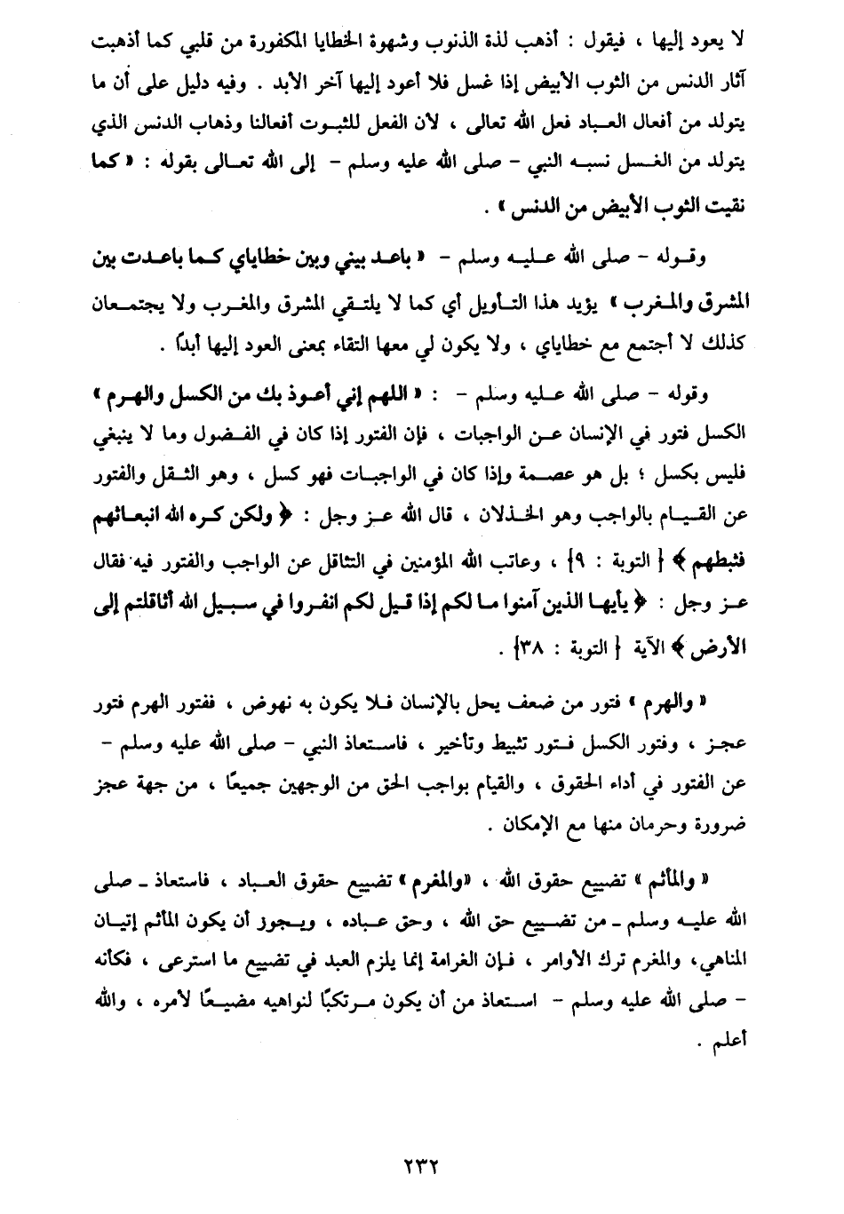 @ 232@لا يعود إليها ، فيقول : اذهب لذة الذنوب وشهوة الخطايا المكفورة من قلبي كما اذهبت آثار الدنس من الثوب الأبيض إذا غسل فلا أعود إليها آخر الأبد . وفيه دليل على أن ما يتولد من أفعال العباد فعل الله تعالى ، لأن الفعل للثبوت أفعالنا وذهاب الدنس الذي يتولد من الغسل نسبه النبي صلى الله عليه وسلم إلى الله تعالى بقوله : كما نقيت الثوب الأبيض من الدنس.