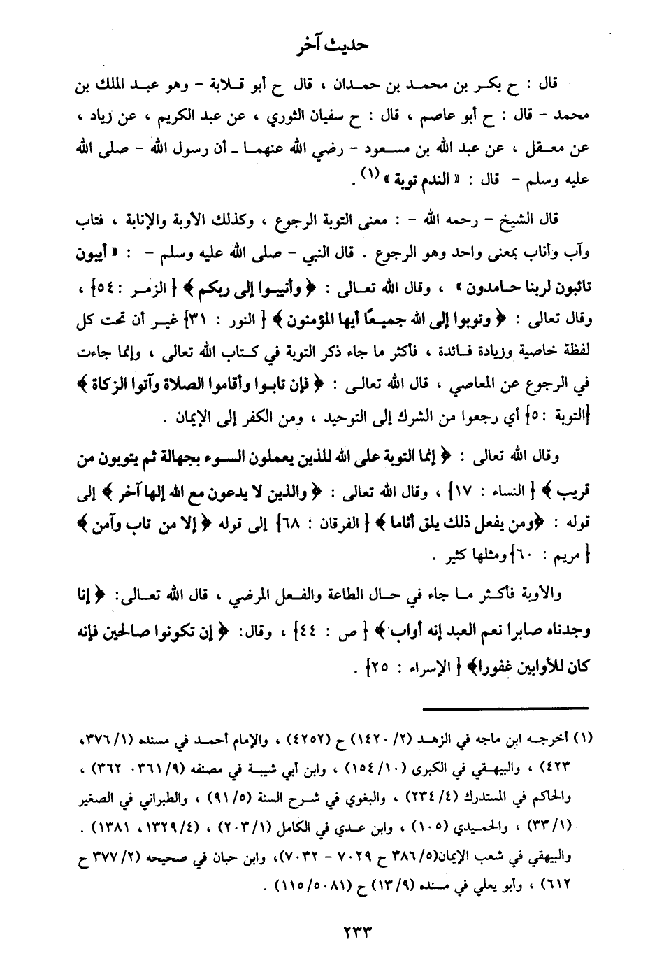 قَالَ: ح بَكْرُ بْنُ مُحَمَّدِ بْنِ حَمْدَانَ قَالَ: ح أَبُو قِلَابَةَ وَهُوَ عَبْدُ الْمَلِكِ بْنُ مُحَمَّدٍ قَالَ: ح أَبُو عَاصِمٍ قَالَ: ح سُفْيَانُ الثَّوْرِيُّ، عَنْ عَبْدِ الْكَرِيمِ، عَنْ زِيَادٍ، عَنْ مَعْقِلٍ، عَنْ عَبْدِ اللَّهِ بْنِ مَسْعُودٍ، رَضِيَ اللَّهُ عَنْهُمَا، أَنَّ رَسُولَ اللَّهِ صَلَّى اللهُ عَلَيْهِ وَسَلَّمَ قَالَ: «§النَّدَمُ تَوْبَةٌ» قَالَ الشَّيْخُ رَحِمَهُ اللَّهُ: مَعْنَى التَّوْبَةِ: الرُّجُوعُ، وَكَذَلِكَ الْأَوْبَةُ وَالْإِنَابَةُ، فَتَابَ وَآبَ، وَأَنَابَ بِمَعْنًى وَاحِدٍ، وَهُوَ الرُّجُوعُ. قَالَ النَّبِيُّ صَلَّى اللهُ عَلَيْهِ وَسَلَّمَ: «آَيِبُونَ تَائِبُونَ لِرَبِّنَا حَامِدُونَ» ، وَقَالَ اللَّهُ تَعَالَى {وَأَنِيبُوا إلَى رَبِّكُمْ} [الزمر: 54] وَقَالَ تَعَالَى {وَتُوبُوا إِلَى اللَّهِ جَمِيعًا أَيُّهَا الْمُؤْمِنُونَ} [النور: 31] ، غَيْرَ أَنْ تَحْتَ كُلِّ لَفْظَةٍ خَاصِّيَةً وَزِيَادَةَ فَائِدَةٍ، فَأَكْثَرُ مَا جَاءَ ذِكْرُ التَّوْبَةِ فِي كِتَابِ اللَّهِ تَعَالَى، وَإِنَّمَا جَاءَتْ فِي الرُّجُوعِ عَنِ الْمَعَاصِي، قَالَ اللَّهُ تَعَالَى {فَإِنْ تَابُوا وَأَقَامُوا الصَّلَاةَ وَآتَوَا الزَّكَاةَ} [التوبة: 5] ، أَيْ: رَجَعُوا مِنَ الشِّرْكِ إِلَى التَّوْحِيدِ، وَمِنَ الْكُفْرِ إِلَى الْإِيمَانِ. وَقَالَ اللَّهُ تَعَالَى {إِنَّمَا التَّوْبَةُ عَلَى اللَّهِ لِلَّذِينَ يَعْمَلُونَ السُّوءَ بِجَهَالَةٍ ثُمَّ يَتُوبُونَ مِنْ قَرِيبٍ} [النساء: 17] ، وَقَالَ اللَّهُ تَعَالَى {وَالَّذِينَ لَا يَدْعُونَ مَعَ اللَّهِ إِلَهًا آخَرَ} [الفرقان: 68] إِلَى قَوْلِهِ {وَمَنْ يَفْعَلْ ذَلِكَ يَلْقَ أَثَامًا} [الفرقان: 68] ، إِلَى قَوْلِهِ {إِلَّا مَنْ تَابَ وَآمَنَ} [مريم: 60] ، وَمِثْلُهَا كَثِيرٌ. وَالْأَوْبَةُ فَأَكْثَرُ مَا جَاءَ فِي حَالِ الطَّاعَةِ وَالْفِعْلِ الْمَرْضِيِّ، قَالَ اللَّهُ تَعَالَى {إِنَّا وَجَدْنَاهُ صَابِرًا نِعْمَ الْعَبْدُ إِنَّهُ أَوَّابٌ} [ص: 44] ، وَقَالَ {إِنْ تَكُونُوا صَالِحِينَ فَإِنَّهُ كَانَ لِلْأَوَّابِينَ غَفُورًا} [الإسراء: 25]