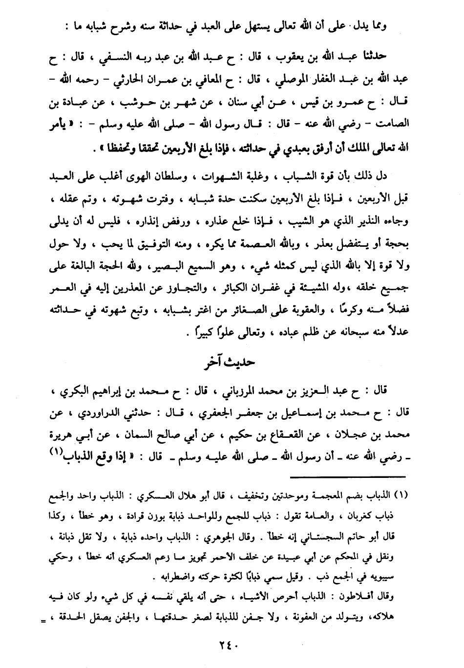 حَدَّثَنَا عَبْدُ اللَّهِ بْنُ يَعْقُوبَ، قَالَ: ح عَبْدُ اللَّهِ بْنُ عَبْدِ رَبِّهِ النَّسَفِيُّ قَالَ: ح عَبْدُ اللَّهِ بْنُ عَبْدِ الْغَفَّارِ الْمَوْصِلِيُّ قَالَ: ح الْمُعَافَى بْنُ عِمْرَانَ الْحَارِثِيُّ رَحِمَهُ اللَّهُ قَالَ: ح عَمْرُو بْنُ قَيْسٍ، عَنْ أَبِي سِنَانٍ، عَنْ شَهْرِ بْنِ حَوْشَبٍ، عَنْ عُبَادَةَ بْنِ الصَّامِتِ رَضِيَ اللَّهُ عَنْهُ قَالَ: قَالَ رَسُولُ اللَّهِ صَلَّى اللهُ عَلَيْهِ وَسَلَّمَ: «§يَأْمُرُ اللَّهُ تَعَالَى الْمَلَكُ أَنْ أَرْفُقَ بِعَبْدِي فِي حَدَاثَتِهِ، فَإِذَا بَلَغَ الْأَرْبَعِينَ تَحَقُّقًا، وَتَحَفُّظًا» دَلَّ ذَلِكَ بِأَنَّ قُوَّةَ الشَّبَابِ، وَغَلَبَةَ الشَّهَوَاتِ، وَسُلْطَانَ الْهَوَى أَغْلَبُ عَلَى الْعَبْدِ قَبْلَ الْأَرْبَعِينَ، فَإِذَا بَلَغَ الْأَرْبَعِينَ سَكَنَتْ حِدَّةُ شَبَابِهِ، وَفَتَرَتْ شَهْوَتُهُ، وَتَمَّ عَقْلُهُ، وَجَاءَهُ النَّذِيرُ الَّذِي هُوَ الشَّيْبُ، فَإِذَا خَلَعَ عِذَارَهُ، وَرَفَضَ إِنْذَارَهُ، فَلَيْسَ لَهُ أَنْ يُدْلِيَ بِحُجَّةٍ، أَوْ يَتَفَضَّلَ بِعُذْرٍ، وَبِاللَّهِ الْعِصْمَةُ مِمَّا يَكْرَهُ، وَمِنْهُ التَّوْفِيقُ لِمَا يُحِبُّ، وَلَا حَوْلَ وَلَا قُوَّةَ إِلَّا بِاللَّهِ الَّذِي لَيْسَ كَمِثْلِهِ شَيْءٌ، وَهُوَ السَّمِيعُ الْبَصِيرُ، وَلِلَّهِ الْحُجَّةُ الْبَالِغَةُ عَلَى جَمِيعِ خَلْقِهِ، وَلَهُ الْمَشِيئَةُ فِي غُفْرَانِ الْكَبَائِرِ، وَالتَّجَاوُزِ عَنِ الْمُعْذَرِينَ إِلَيْهِ فِي الْعُمُرِ فَضْلًا مِنْهُ، وَكَرَمًا، وَالْعُقُوبَةُ عَلَى الصَّغَائِرِ مَنِ اغْتَرَّ بِشَبَابِهِ، وَتَبِعَ شَهْوَتَهُ فِي حَدَاثَتِهِ عَدْلًا مِنْهُ، سُبْحَانَهُ عَنْ ظُلْمِ عِبَادِهِ، وَتَعَالَى عُلُوًّا كَبِيرًا