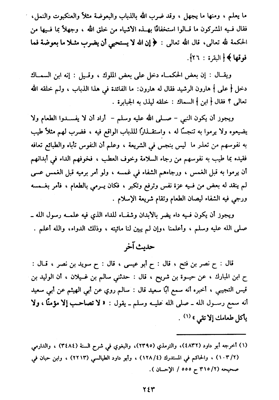 قَالَ: ح نَصْرُ بْنُ فَتْحٍ قَالَ: ح أَبُو عِيسَى قَالَ: ح سُوَيْدُ بْنُ نَصْرٍ قَالَ: ح ابْنُ الْمُبَارَكِ، عَنْ حَيْوَةَ بْنِ شُرَيْحٍ، قَالَ: حَدَّثَنِي سَالِمُ بْنُ غَيْلَانَ، أَنَّ الْوَلِيدَ بْنَ قَيْسٍ التُّجِيبِيَّ، أَخْبَرَهُ أَنَّهُ سَمِعَ أَبَا سَعِيدٍ، قَالَ: سَالِمٌ رَوَى عَنْ أَبِي الْهَيْثَمِ، عَنْ أَبِي سَعِيدٍ، أَنَّهُ سَمِعَ رَسُولَ اللَّهِ صَلَّى اللهُ عَلَيْهِ وَسَلَّمَ، يَقُولُ: «§لَا تُصَاحِبْ إِلَّا مُؤْمِنًا، وَلَا يَأْكُلْ طَعَامَكَ إِلَّا تَقِيٌّ» -[244]- قَالَ الشَّيْخُ رَحِمَهُ اللَّهُ: يَجُوزُ أَنْ يَكُونَ الْمُرَادُ بِقَوْلِهِ: «لَا يَأْكُلْ طَعَامُكَ إِلَّا تَقِيٌّ» ، يُرِيدُ بِهِ الْمُوَاكَلَةَ الَّتِي تُوجِبُ الْأُلْفَةَ، وَتُؤَدِّي إِلَى الْخِلْطَةِ، فَإِنَّ الْمُوَاكَلَةَ أَوْكَدُ أَسْبَابِ الْأُلْفَةِ، وَأَحْكَمُ دَوَاعِي الْخِلْطَةِ، وَأَوْثَقُ عُرَى الْمُدَاخَلَةِ، وَالِاسْتِئْنَاسِ، وَمُخَالَطَةُ مَنْ لَيْسَ بِتَقِيٍّ، وَالِاسْتِئْنَاسُ بِهِ وَالْأُلْفَةُ مَعَهُ تَغُرُّ الْإِنْسَانَ، وَتُخِلُّ بِالدِّينِ، وَتُذْهِبُ الْمُرُوءَةَ، وَتُوقِعُ فِي الشُّبُهَاتِ، وَتُؤَدِّي إِلَى تَنَاوَلِ الْمُحَرَّمَاتِ، فَكَأَنَّهُ صَلَّى اللهُ عَلَيْهِ وَسَلَّمَ حَذَّرَ مُخَالَطَةَ الْأَشْرَارِ، وَنَهَى عَنْ مُصَاحَبَةِ الْفُجَّارِ؛ لِأَنَّ مُخَالَطَةَ الْفَاجِرِ لَا تَخْلُو مِنْ فَسَادٍ يَلْحَقُكَ مِنْهُ، إِلَّا مُتَابَعَةً لَهُ فِيمَا يَأْتِيهِ، فَيَذْهَبُ الدِّينُ. وَإِمَّا مُسَامَحَةً فِي الْأَعْضَاءِ عَمَّا يُوجِبُهُ حَقُّ اللَّهِ مِنْ أَمْرٍ بِمَعْرُوفٍ، أَوْ نَهْيٍ عَنْ مُنْكَرٍ، وَإِمَّا اسْتِخْفَافًا بِفُجُورِهِ، فَإِنَّ مَنْ رَأَى الشَيْءَ كَثِيرًا، سَهُلَ ذَلِكَ فِي عَيْنِهِ، وَصَغُرَ عِنْدَ نَفْسِهِ، فَإِنْ سَلِمَ الْإِنْسَانُ عَنْ هَذِهِ الْأَسْبَابِ، وَلَا يَكَادُ يَسْلَمُ إِلَّا مَنْ عَصَمَهُ اللَّهُ، فَيُخْطِئُهُ فِتْنَةُ الْغَيْرِ بِهِ. الدَّلِيلُ عَلَى هَذَا التَّأْوِيلِ قَوْلُهُ: «لَا تُصَاحِبْ إِلَّا مُؤْمِنًا» ، أَيْ: لَا يَكُونُ مَنْ لَيْسَ بِمُؤْمِنٍ عَهْدًا، وَقَوْلًا لَكَ بِصَاحِبٍ بِوَجْهٍ مِنَ الْوُجُوهِ، وَلَا مَنْ تَرَكَ آدَابَ الْإِيمَانِ، وَشَرَائِطَهُ صَاحِبًا لَكَ فِي وَقْتٍ مِنَ الْأَوْقَاتِ، وَإِلَّا عِشْرَةً تُعَاشِرُهُ عَلَى شَرْطِ النَّصِيحَةِ الَّتِي أَوْجَبَتْ عُقْدَةُ الْإِيمَانِ فِي تَحَرُّزٍ مِنْ آفَةٍ تَلْحَقُ الدِّينَ، أَوْ تَقْدَحُ فِيٍ الْمُرُوءَةِ. وَلَيْسَ قَوْلُهُ صَلَّى اللهُ عَلَيْهِ وَسَلَّمَ: «لَا يَأْكُلْ طَعَامَكَ إِلَّا تَقِيٌّ» ، إِنْ شَاءَ اللَّهُ تَعَالَى عَلَى مَعْنَى حِرْمَانِ ذَلِكَ - إِطْعَامًا وَمُنَاوَلَةً - مَنْ لَيْسَ بِتَقِيٍّ، فَقَدْ أَطْعَمَ النَّبِيُّ الْمُشْرِكِينَ، وَأَعْطَى الْمُؤَلَّفَةَ قُلُوبِهِمُ الْمِائَتَيْنِ مِنَ الْإِبِلِ، وَالْأُلُوفَ مِنَ الشِّيَاهِ وَغَيْرِهِ، وَكَانَ يَصْنَعُ إِلَى الْبَرِّ، وَالْفَاجِرِ، وَيَأْمُرُ بِهِ