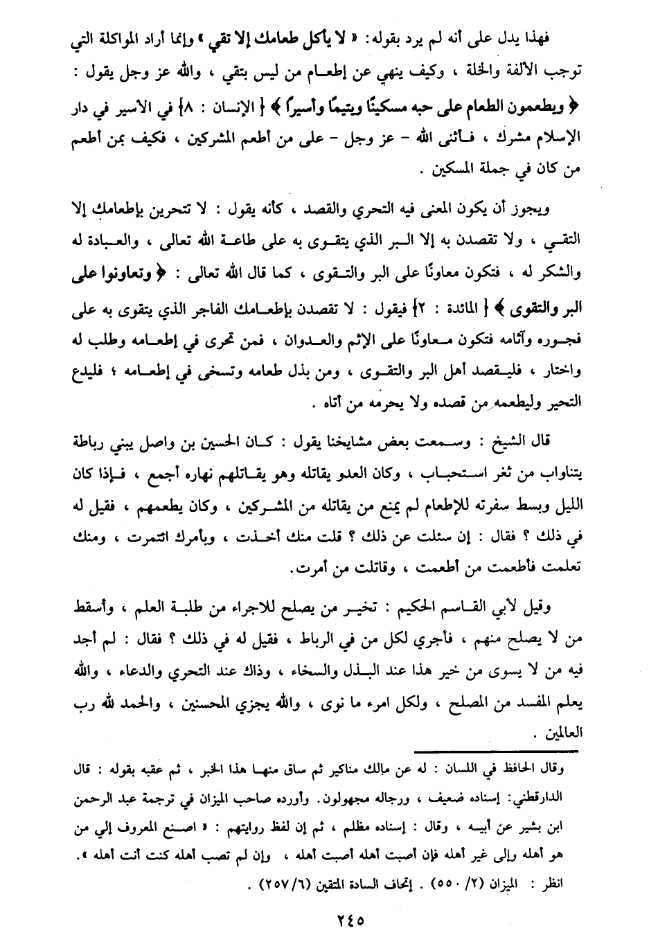 @ 245@فهذا يدل على انه لم يرد بقوله : لا يأكل طعامك إلا تقي وإنما أراد المواكلة التي توجب الألفة والخلة ، وكيف ينهي عن إطعام من ليس بتقي ، والله عز وجل يقول : {ويطعمون الطعام على حبه مسكينا ويتيما وأسيرا} [الإنسان : 8] في الاسير في دار الإسلام مشرك ، فأثنى الله عز وجل على من أطعم المشركين ، فكيف بمن أطعم من كان في جملة المسكين.