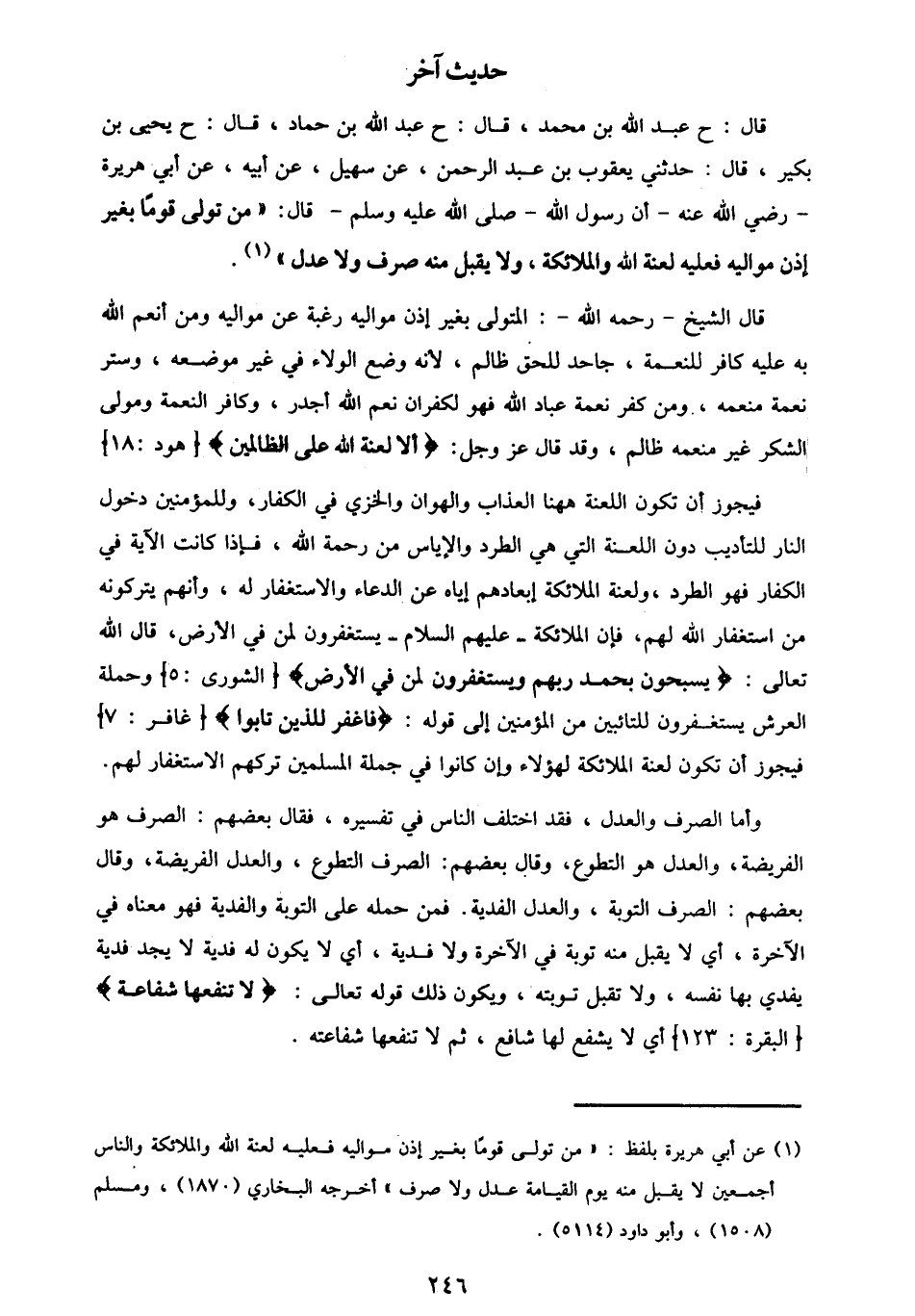 قَالَ: ح عَبْدُ اللَّهِ بْنُ مُحَمَّدٍ قَالَ: ح عَبْدُ اللَّهِ بْنُ حَمَّادٍ قَالَ: ح يَحْيَى بْنُ بُكَيْرٍ قَالَ: حَدَّثَنِي يَعْقُوبُ بْنُ عَبْدِ الرَّحْمَنِ، عَنْ سُهَيْلٍ، عَنْ أَبِيهِ، عَنْ أَبِي هُرَيْرَةَ، رَضِيَ اللَّهُ عَنْهُ، أَنَّ رَسُولَ اللَّهِ صَلَّى اللهُ عَلَيْهِ وَسَلَّمَ قَالَ: §«مَنْ تَوَلَّى قَوْمًا بِغَيْرِ إِذْنِ مَوَالِيهِ، فَعَلَيْهِ لَعْنَةُ اللَّهِ وَالْمَلَائِكَةِ، وَلَا يُقْبَلُ مِنْهُ صَرْفٌ، وَلَا عَدْلٌ» قَالَ الشَّيْخُ رَحِمَهُ اللَّهُ: الْمُتَوَلِّي بِغَيْرِ إِذْنِ مَوَالِيهِ رَغْبَةً عَنْ مَوَالِيهِ، وَمَنْ أَنْعَمَ اللَّهُ بِهِ عَلَيْهِ كَافِرٌ لِلنِّعْمَةِ، جَاحِدٌ لِلْحَقِّ ظَالِمٌ؛ لِأَنَّهُ وَضَعَ الْوَلَاءَ فِي غَيْرِ مَوْضِعِهِ، وَسَتَرَ نِعْمَةَ مُنْعِمِهِ، وَمَنْ كَفَرَ نِعْمَةَ عِبَادِ اللَّهِ، فَهُوَ لِكُفْرَانِ نِعَمِ اللَّهِ أَجْدَرُ، وَكَافِرُ النِّعْمَةِ، وَمُولِي الشُّكْرِ غَيْرَ مُنْعِمِهِ ظَالِمٌ، وَقَدْ قَالَ عَزَّ وَجَلَّ: {أَلَا لَعْنَةُ اللَّهِ عَلَى الظَّالِمِينَ} [هود: 18] . فَيَجُوزُ أَنْ تَكُونَ اللَّعْنَةُ هَا هُنَا الْعَذَابَ، وَالْهَوَانَ، وَالْخِزْيَ فِي الْكُفَّارِ، وَلِلْمُؤْمِنِينَ دُخُولَ النَّارِ لِلتَّأْدِيبِ دُونَ اللَّعْنَةِ الَّتِي هِيَ الطَّرْدُ، وَالْإِيَاسُ مِنْ رَحْمَةِ اللَّهِ، فَإِذَا كَانَتِ الْآيَةُ فِي الْكُفَّارِ، فَهُوَ الطَّرْدُ، وَلَعْنَةُ الْمَلَائِكَةِ إِبْعَادُهُمْ إِيَّاهُ عَنِ الدُّعَاءِ وَالِاسْتِغْفَارِ لَهُ، وَأَنَّهُمْ يَتْرُكُونَهُ مِنَ اسْتِغْفَارِ اللَّهِ لَهُمْ، فَإِنَّ الْمَلَائِكَةَ عَلَيْهِمُ السَّلَامُ يَسْتَغْفِرُونَ لِمَنْ فِي الْأَرْضِ، قَالَ اللَّهُ تَعَالَى: {يُسَبِّحُونَ بِحَمْدِ رَبِّهِمْ وَيَسْتَغْفِرُونَ لِمَنْ فِي الْأَرْضِ} [الشورى: 5] ، وَحَمَلَةُ الْعَرْشِ يَسْتَغْفِرُونَ لِلتَّائِبِينَ مِنَ الْمُؤْمِنِينَ إِلَى قَوْلِهِ: {فَاغْفِرْ لِلَّذِينَ تَابُوا} [غافر: 7] ، فَيَجُوزُ أَنْ تَكُونَ لَعْنَةُ الْمَلَائِكَةِ لِهَؤُلَاءِ، وَإِنْ كَانُوا فِي جُمْلَةِ الْمُسْلِمِينَ تَرْكَهُمُ الِاسْتِغْفَارَ لَهُمْ. وَأَمَّا الصَّرْفُ، وَالْعَدْلُ، فَقَدِ اخْتَلَفَ النَّاسُ فِي تَفْسِيرِهِ، فَقَالَ بَعْضُهُمُ: الصَّرْفُ هُوَ الْفَرِيضَةُ، وَالْعَدْلُ هُوَ التَّطَوُّعُ، وَقَالَ بَعْضُهُمُ: الصَّرْفُ التَّطَوُّعُ، وَالْعَدْلُ الْفَرِيضَةُ، وَقَالَ بَعْضُهُمُ: الصَّرْفُ التَّوْبَةُ، وَالْعَدْلُ الْفِدْيَةُ. فَمَنْ حَمَلَهُ عَلَى التَّوْبَةِ وَالْفِدْيَةِ، فَهُوَ مَعْنَاهُ فِي الْآخِرَةِ، أَيْ: لَا يَقْبَلُ مِنْهُ تَوْبَةً فِي الْآخِرَةِ، وَلَا فِدْيَةً، أَيْ: لَا يَكُونُ لَهُ فِدْيَةٌ، لَا يَجِدُ فِدْيَةً يَفْدِي بِهَا نَفْسَهُ، وَلَا تُقْبَلُ تَوْبَتُهُ، وَيَكُونُ ذَلِكَ قَوْلُهُ تَعَالَى: {لَا تَنْفَعُهَا شَفَاعَةٌ} [البقرة: 123] ، أَيْ: لَا يَشْفَعُ لَهَا شَافِعٌ، ثُمَّ لَا تَنْفَعُهَا شَفَاعَتُهُ -[247]- كَذَلِكَ قَوْلُهُ صَلَّى اللهُ عَلَيْهِ وَسَلَّمَ: «لَا يُقْبَلُ مِنْهُ فِدْيَةٌ» ، أَيْ: لَيْسَ لَهُ مَا يَفْدِي بِهِ نَفْسَهُ، وَتَوْبَتُهُ فِي الْآخِرَةِ لَا تُقْبَلُ، فَأَمَّا التَّوْبَةُ، فَإِنَّهَا تُقْبَلُ فِي الدُّنْيَا، وَيَمْحْو اللَّهُ تَعَالَى السَّيِّئَاتِ بِالْحَسَنَاتِ، وَمَنْ قُبِلَتْ حَسَنَتُهُ فَدَاهُ اللَّهُ تَعَالَى يَوْمَ الْقِيَامَةِ بِأَهْلِ الْأَدْيَانِ مِنَ الْيَهُودِ، وَالنَّصَارَى، وَبِهِ جَاءَ الْخَبَرُ عَنْ رَسُولِ اللَّهِ صَلَّى اللهُ عَلَيْهِ وَسَلَّمَ. وَمِمَّا يَدُلُّ عَلَى أَنَّهُ أَرَادَ بِالتَّوْبَةَ وَالْفِدْيَةِ فِي الْآخِرَةِ، مَا جَاءَ فِي رِوَايَةِ عَلِيِّ بْنِ أَبِي طَالِبٍ رَضِيَ اللَّهُ عَنْهُ، عَنِ النَّبِيِّ صَ