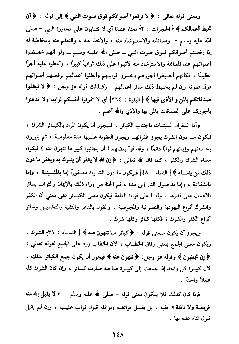 @ 248@ومعنى قوله تعالى : {لا ترفعوا اصواتكم فوق صوت النبي} إلى قوله : {أن تحبط أعمالكم} [الحجرات : 2] معناه عندنا أي لا تثابون على محاورة النبي صلى الله عليه وسلم ومسائلته والاسترشاد منه ، والأخذ عنه ، والتعلم منه بالمخاطبة له إذا رفعتم أصواتكم فوق صوت النبي صلى الله عليه وسلم ولو انهم خفضوا أصواتهم عند المسائلة والاسترشاد منه لأثيبوا على ذلك ثواب كبيرا ، واعطوا عليه أجرا عظيما ، فكأنهم احبطوا أجورهم وخسروا ثوابهم وأبطلوا أعمالهم برفعهم أصواتهم فوق صوته وإن لم يحبط ذلك سائر أعمالهم . وكذلك قوله عز وجل : {لا تبطلوا صدقاتكم بالمن والأذى فيها} [البقرة : 264] أي لا تفوتوا أنفسكم ثوابها ولا تدهنوا بأجوركم على الصدقات بالمن بها والأذى والله أعلم.