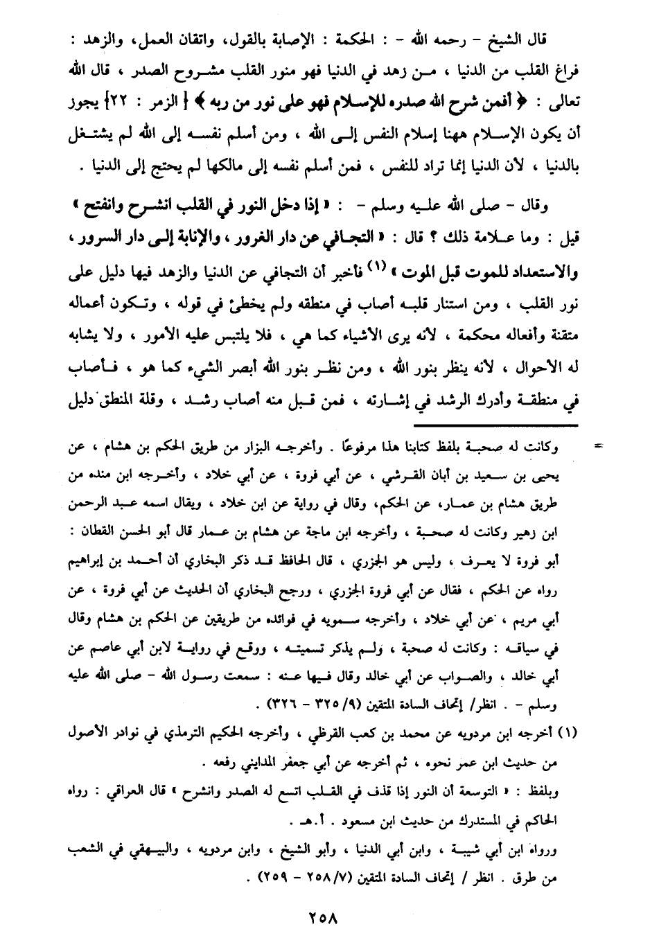 @ 258@قال الشيخ رحمه الله : الحكمة : الإصابة بالقول ، واتقان العمل ، والزهد : فراغ القلب من الدنيا ، من زهد في الدنيا فهو منور القلب مشروح الصدر ، قال الله تعالى : {أفمن شرح الله صدره للإسلام فهو على نور من ربه} [الزمر : 22] يجوز أن يكون الإسلام ههنا إسلام النفس إلى الله ، ومن اسلم نفسه إلى الله لم يشتغل بالدنيا ، لأن الدنيا إنما تراد للنفس ، فمن اسلم نفسه إلى مالكها لم يحتج إلى الدنيا.