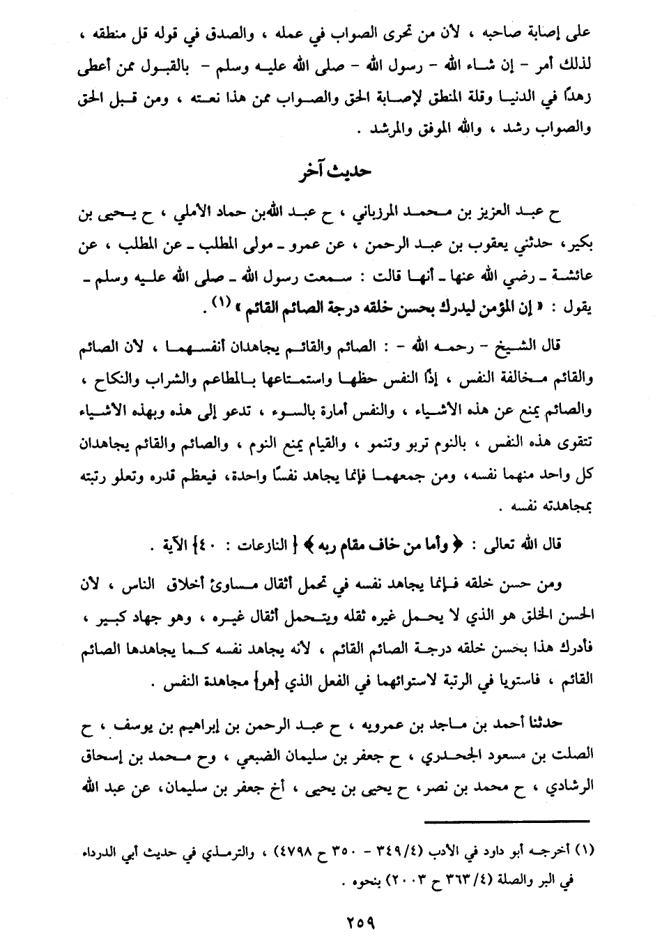 ح عَبْدُ الْعَزِيزِ بْنُ مُحَمَّدٍ الْمَرْزُبَانِيُّ، ح عَبْدُ اللَّهِ بْنُ حَمَّادٍ الْآمُلِيُّ، ح يَحْيَى بْنُ بُكَيْرٍ، حَدَّثَنِي يَعْقُوبُ بْنُ عَبْدِ الرَّحْمَنِ، عَنْ عَمْرٍو، مَوْلَى الْمُطَّلِبِ، عَنِ الْمُطَّلِبِ، عَنْ عَائِشَةَ، رَضِيَ اللَّهُ عَنْهَا أَنَّهَا قَالَتْ: سَمِعْتُ رَسُولَ اللَّهِ صَلَّى اللهُ عَلَيْهِ وَسَلَّمَ يَقُولُ: «إِنَّ §الْمُؤْمِنَ لَيُدْرِكُ بِحُسْنِ خُلُقِهِ دَرَجَةَ الصَّائِمِ الْقَائِمِ» قَالَ الشَّيْخُ رَحِمَهُ اللَّهُ: الصَّائِمُ وَالْقَائِمُ يُجَاهِدَانِ أَنْفُسَهُمَا؛ لِأَنَّ الصَّائِمَ وَالْقَائِمَ مُخَالَفَةُ النَّفْسِ، إِذِ النَّفْسُ حَظُّهَا وَاسْتِمتَاعُهَا بِالْمَطَاعِمِ وَالشَّرَابِ وَالنِّكَاحِ، وَالصَّائِمُ يُمْنَعُ عَنْ هَذِهِ الْأَشْيَاءِ، وَالنَّفْسُ أَمَّارَةٌ بِالسُّوءِ، تَدْعُو إِلَى هَذِهِ، وَبِهَذِهِ الْأَشْيَاءِ تَتَقَوَّى هَذِهِ النَّفْسُ، بِالنَّوْمِ تَرْبُو وَتَنْمُو، وَالْقِيَامُ يَمْنَعُ النَّوْمَ، وَالصَّائِمُ وَالْقَائِمُ يُجَاهِدَانِ كُلُّ وَاحِدٍ مِنْهُمَا نَفْسَهُ، وَمَنْ جَمَعَهُمَا فَإِنَّمَا يُجَاهِدُ نَفْسًا وَاحِدَةً، فَيَعْظُمُ قَدْرُهُ، وَتَعْلُو رُتْبَتُهُ بِمُجَاهَدَتِهِ نَفْسَهُ. قَالَ اللَّهُ تَعَالَى {وَأَمَّا مَنْ خَافَ مَقَامَ رَبِّهِ} [النازعات: 40] الْآيَةَ. وَمَنْ حَسُنَ خُلُقُهُ، فَإِنَّمَا يُجَاهِدُ نَفْسَهُ فِي تَحَمُّلِ أَثْقَالِ مَسَاوِئِ أَخْلَاقِ النَّاسِ؛ لِأَنَّ الْحَسَنَ الْخُلُقِ هُوَ الَّذِي لَا يُحَمِّلُ غَيْرَهُ ثِقَلَهُ، وَيَتَحَمَّلُ أَثْقَالَ غَيْرِهِ، وَهُوَ جِهَادٌ كَبِيرٌ، فَأَدْرَكَ هَذَا بِحُسْنِ خُلُقِهِ دَرَجَةَ الصَّائِمِ الْقَائِمِ؛ لِأَنَّهُ يُجَاهِدُ نَفْسَهُ كَمَا يُجَاهِدُهَا الصَّائِمُ الْقَائِمُ، فَاسْتَوَيَا فِي الرُّتْبَةِ لِاسْتِوَائِهِمَا فِي الْفِعْلِ الَّذِي هُوَ مُجَاهَدَةُ النَّفْسِ