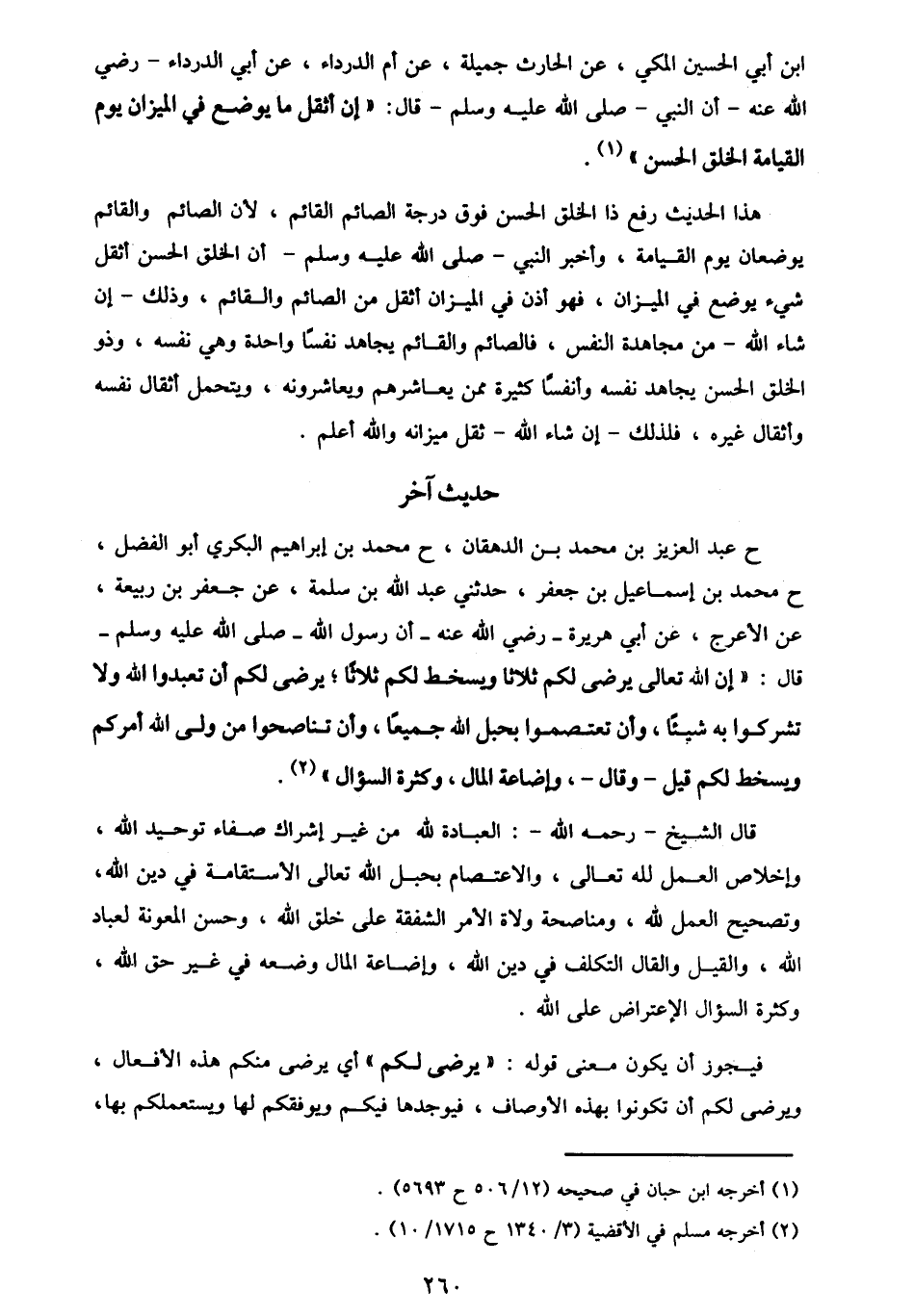 ح عَبْدُ الْعَزِيزِ بْنُ مُحَمَّدِ بْنِ الدِّهْقَانِ، ح مُحَمَّدُ بْنُ إِبْرَاهِيمَ الْبَكْرِيُّ أَبُو الْفَضْلِ، ح مُحَمَّدُ بْنُ إِسْمَاعِيلَ بْنِ جَعْفَرٍ، حَدَّثَنِي عَبْدُ اللَّهِ بْنُ سَلَمَةَ، عَنْ جَعْفَرِ بْنِ رَبِيعَةَ، عَنِ الْأَعْرَجِ، عَنْ أَبِي هُرَيْرَةَ، رَضِيَ اللَّهُ عَنْهُ، أَنَّ رَسُولَ اللَّهِ صَلَّى اللهُ عَلَيْهِ وَسَلَّمَ قَالَ: " إِنَّ §اللَّهَ تَعَالَى يَرْضَى لَكُمْ ثَلَاثًا وَيَسْخَطُ لَكُمْ ثَلَاثًا، يَرْضَى لَكُمْ: أَنْ تَعْبُدُوا اللَّهَ وَلَا تُشْرِكُوا بِهِ شَيْئًا، وَأَنْ تَعْتَصِمُوا بِحَبْلِ اللَّهِ جَمِيعًا، وَأَنْ تُنَاصِحُوا مَنْ وَلَّى اللَّهُ أَمْرَكُمْ، وَيَسْخَطُ لَكُمْ: قِيلَ وَقَالَ، وَإِضَاعَةَ الْمَالِ، وَكَثْرَةَ السُّؤَالِ " قَالَ الشَّيْخُ رَحِمَهُ اللَّهُ:: الْعِبَادَةُ لِلَّهِ مِنْ غَيْرِ إِشْرَاكٍ صَفَاءُ تَوْحِيدِ اللَّهِ، وَإِخْلَاصُ الْعَمَلِ لِلَّهِ تَعَالَى، وَالِاعْتِصَامُ بِحَبْلِ اللَّهِ تَعَالَى الِاسْتِقَامَةُ فِي دِينِ اللَّهِ، وَتَصْحِيحُ الْعَمَلِ لِلَّهِ، وَمُنَاصَحَةُ وُلَاةِ الْأَمْرِ الشَّفَقَةُ عَلَى خَلْقِ اللَّهِ، وَحُسْنُ الْمَعُونَةِ لِعِبَادِ اللَّهِ، وَالْقِيلُ وَالْقَالُ التَّكَلُّفُ فِي دِينِ اللَّهِ، وَإِضَاعَةُ الْمَالِ وَضْعُهُ فِي غَيْرِ حَقِّ اللَّهِ، وَكَثْرَةُ السُّؤَالِ الِاعْتِرَاضُ عَلَى اللَّهِ. فَيَجُوزُ أَنْ يَكُونَ مَعْنَى قَوْلِهِ: «يَرْضَى لَكُمْ» أَيْ: يَرْضَى مِنْكُمْ هَذِهِ الْأَفْعَالَ، وَيَرْضَى لَكُمْ أَنْ تَكُونُوا بِهَذِهِ الْأَوْصَافِ، فَيُوجِدُهَا فِيكُمْ، وَيُوَفِّقُكُمْ لَهَا، وَيَسْتَعْمِلُكُمْ بِهَا؛ -[261]- لِأَنَّهَا تُحَبِّبُكُمْ وَالْمُحِبُّ يُحِبُّ لِحَبِيبِهِ أَرْفَعَ الْمَنَازِلِ، وَأَعْلَى الدَّرَجَاتِ، وَأَحْسَنَ الْأَوْصَافِ، وَأَنْ تُطِيعُوهُ أَنْتُمْ فَيُوجِدُهَا فِيكُمْ، وَيَضَعُهَا فِيكُمْ، وَيَجْلِبُكُمْ فَضْلًا وَكَرَمًا، وَيَسْخَطُ لَكُمُ الثَّلَاثَ الْأُخَرَ، فَيَحُولُ بَيْنَكُمْ وَبَيْنَهَا، وَيَعْصِمُكُمْ مِنْهَا وَلَا يُحْدِثُهَا فِيكُمْ عِصْمَةً لَكُمْ، وَيَسْخَطُ مِنْكُمْ هَذِهِ الْأَوْصَافَ الذَّمِيمَةَ، فَتَكَلَّفُوا إِزَالَتَهَا عَنْكُمْ، وَمُجَانَبَتَهَا إِنْ لَمْ تَكُنْ فِيكُمْ، فَلَا يَسْخَطُ اللَّهُ عَلَيْكُمْ، وَاللَّهُ وَلِيُّ التَّوْفِيقِ وَالْعِصْمَةِ