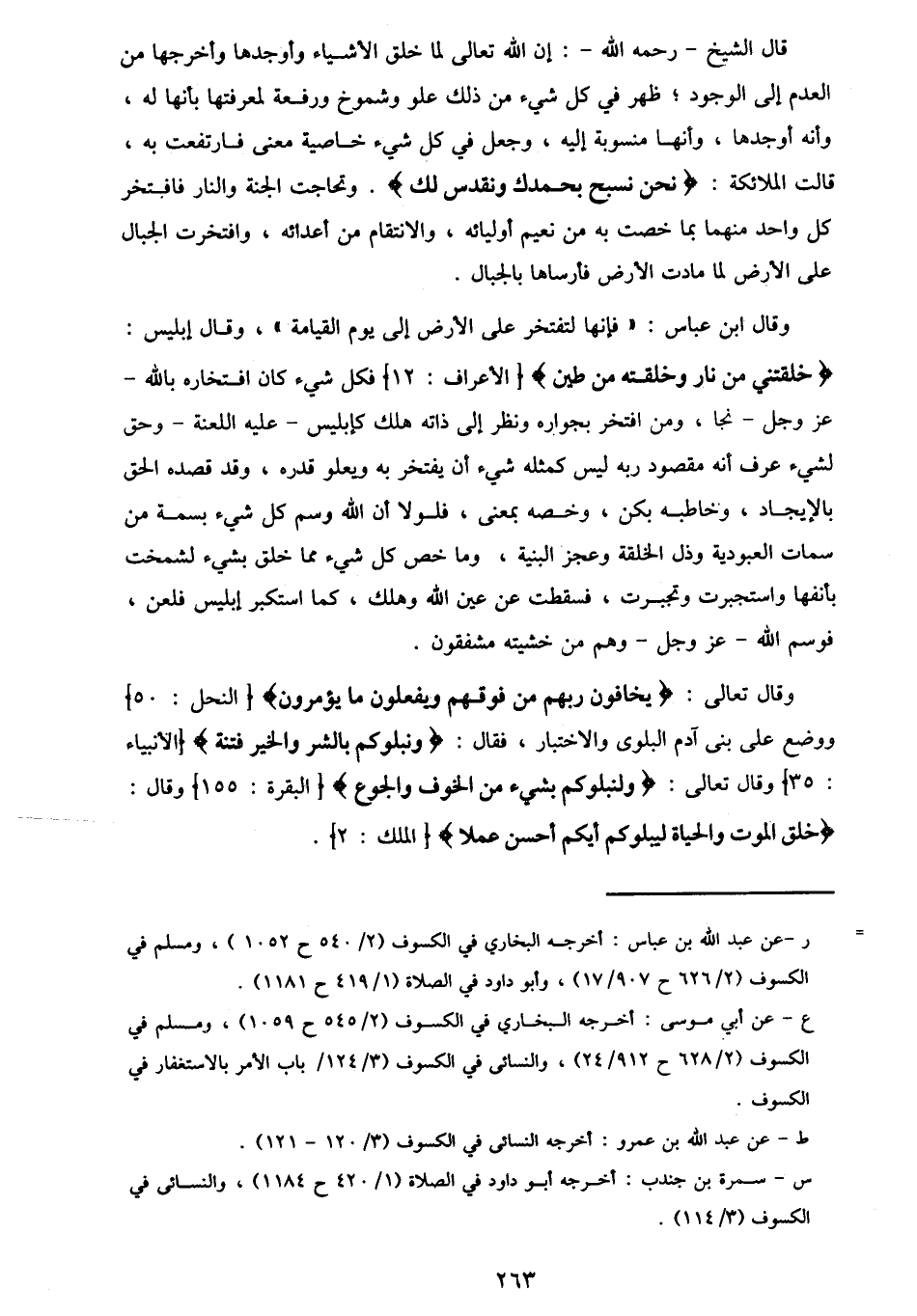 @ 263@قال الشيخ رحمه الله : إن الله تعالى لما خلق الأشياء وأوجدها وأخرجها من العدم إلى الوجود ، ظهر في كل شيء من ذلك علو وشموخ ورفعة لمعرفتها بأنها له ، وأنه اوجدها ، وأنها منسوبة إليه ، وجعل في كل شيء خاصية معنى فارتفعت به ، قالت الملائكة : {نحن نسبح بحمدك ونقدس لك} . وتحاجت الجنة والنار فافتخر كل واحد منهما بما خصت به من نعيم اوليائه ، والانتقام من اعدائه ، وافتخرت الجبال على الأرض لما مادت الأرض فأرساها بالجبال.