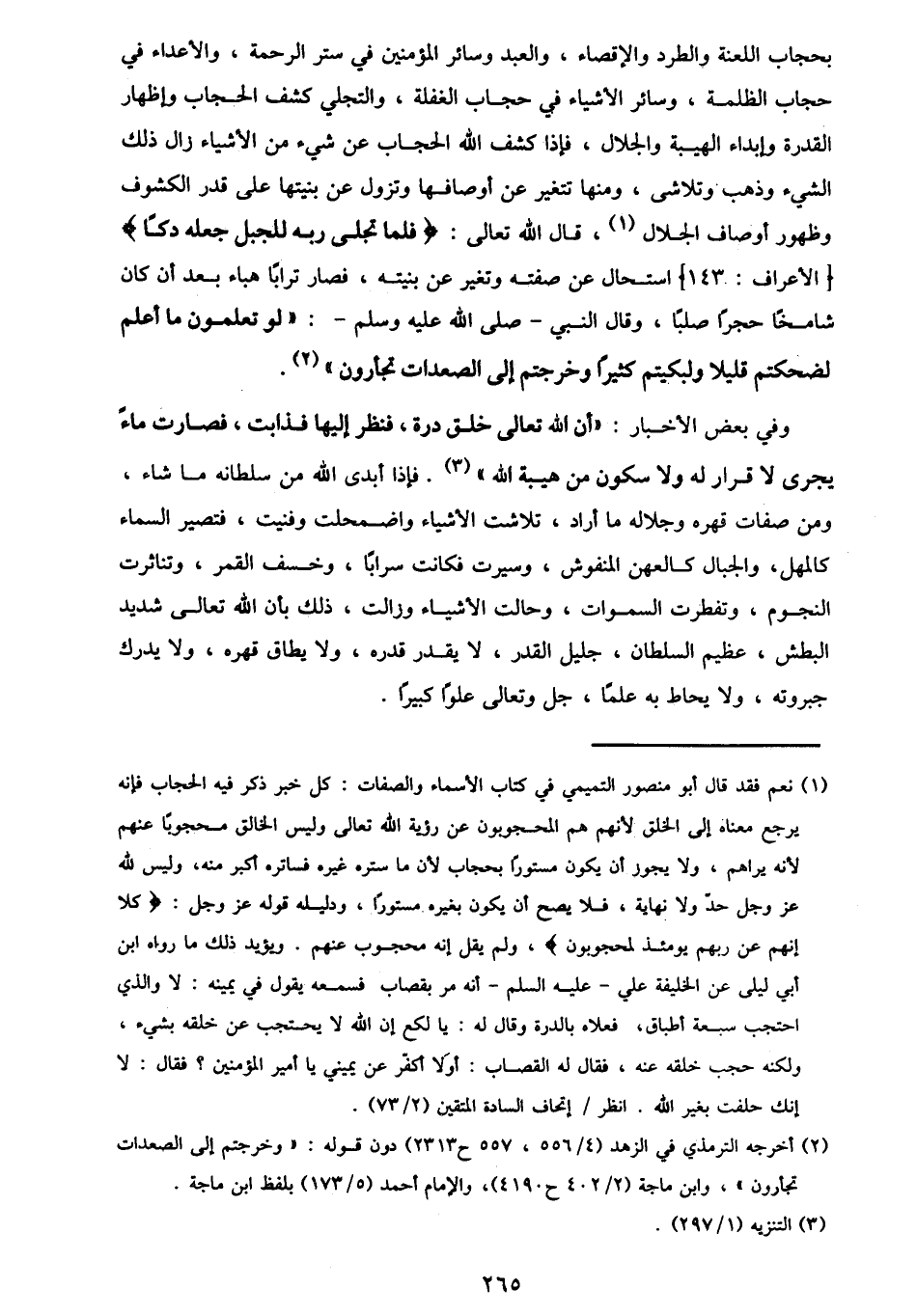 @ 265@بحجاب اللعنة والطرد والاقصاء ، والعبد وسائر المؤمنين في ستر الرحمة ، والأعداء في حجاب الظلمة ، وسائر الأشياء في حجاب الغفلة ، والتجلي كشف الحجاب وإظهار القدرة وإبداء الهيبة والجلال ، فإذا كشف الله الحجاب عن شيء من الأشياء زال ذلك الشيء وذهب وتلاشى ، ومنها تتغير عن اوصافها وتزول عن بنيتها على قدر الكشوف وظهور أوصاف الجلال ، قال الله تعالى : {فلما تجلى ربه للجبل جعله دكا} [الأعراف : 143] استحال عن صفته وتغير عن بنيته ، فصار ترابا هباء بعد أن كان شامخا حجرا صلبا ، وقال النبي صلى الله عليه وسلم : لو تعلمون ما أعلم لضحكتم قليلا ولبكيتم كثيرا وخرجتم إلى الصعدات تجأرون.