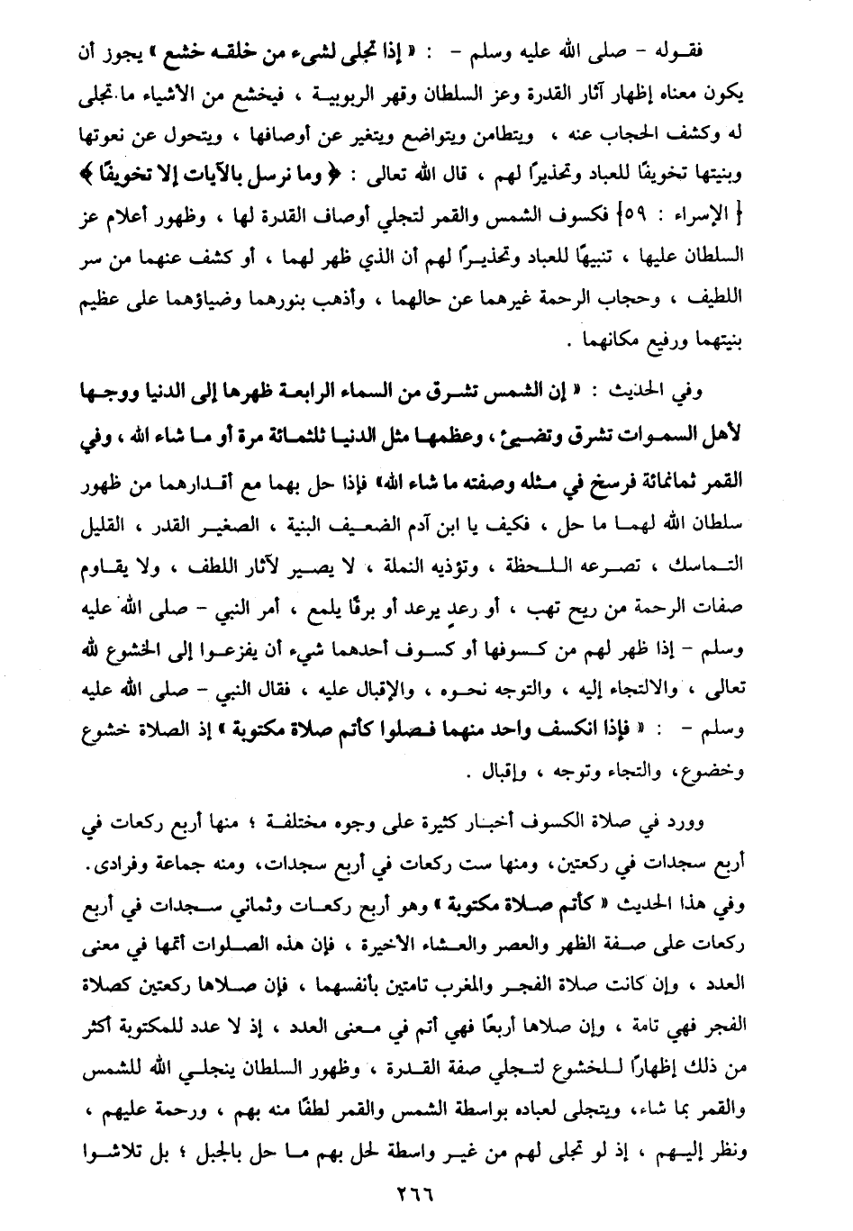|وورد في صلاة الكسوف اخبار كثيرة على وجوه مختلفة ، منها أربع ركعات في أربع سجدات في ركعتين ، ومنها ست ركعات في أربع سجدات ، ومنه جماعة وفرادى ، وفي هذا الحديث كأتم صلاة مكتوبة وهو أربع ركعات وثماني سجدات في أربع ركعات على صفة الظهر والعصر والعشاء الأخيرة ، فإن هذه الصلوات اتمها في معنى العدد ، وإن كانت صلاة الفجر والمغرب تامتين بأنفسهما ، فإن صلاها ركعتين كصلاة الفجر فهي تامة ، وان صلاها أربعا فهي أتم في معنى العدد ، إذ لا عدد للمكتوبة اكثر من ذلك إظهارا للخشوع لتجلي صفة القدرة ، وظهور السلطان ينجلي الله للشمس والقمر بما شاء ، ويتجلى لعباده بواسطة الشمس والقمر لطفا منه بهم ، ورحمة عليهم ، ونظر إليهم ، إذ لو تجلى لهم من غير واسطة لحل بهم ما حل بالجبل ، بل تلاشوا |
