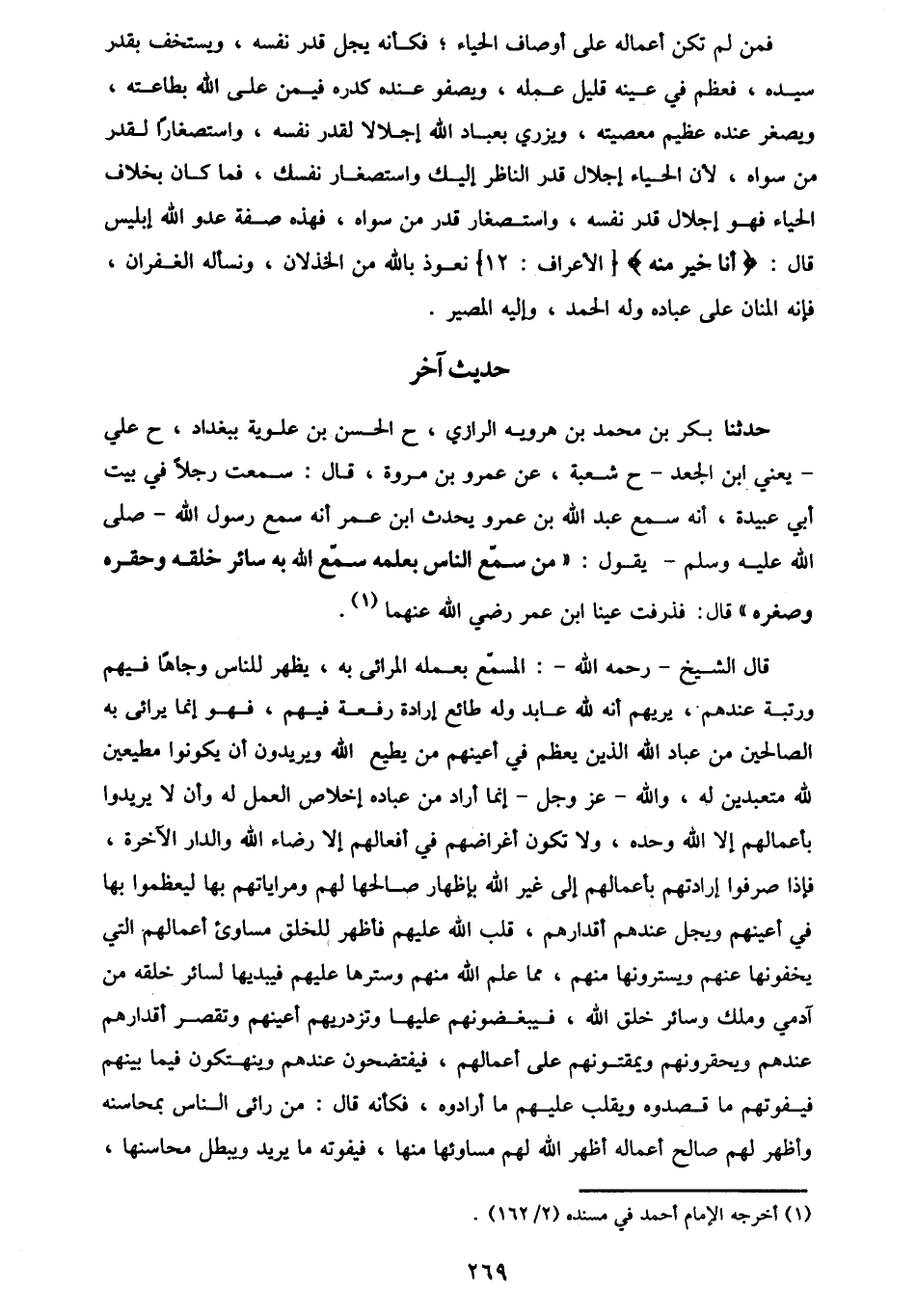 - حَدَّثَنَا بَكْرُ بْنُ مُحَمَّدِ بْنِ هَرَوَيْهِ الرَّازِيُّ، ح الْحَسَنُ بْنُ عَلُّوَيْهِ بِبَغْدَادَ، ح عَلِيٌّ يَعْنِي ابْنَ الْجَعْدِ، ح شُعْبَةُ، عَنْ عَمْرِو بْنِ مُرَّةَ، قَالَ: سَمِعْتُ رَجُلًا، فِي بَيْتِ أَبِي عُبَيْدَةَ أَنَّهُ سَمِعَ عَبْدَ اللَّهِ بْنَ عَمْرٍو، يُحَدِّثُ ابْنَ عُمَرَ أَنَّهُ سَمِعَ رَسُولَ اللَّهِ صَلَّى اللهُ عَلَيْهِ وَسَلَّمَ يَقُولُ: §«مَنْ سَمَّعَ النَّاسَ بِعَمَلِهِ سَمَّعَ اللَّهَ بِهِ سَائِرَ خَلْقِهِ وَحَقَّرَهُ وَصَغَّرَهُ» قَالَ: فَذَرَفَتْ عَيْنَا ابْنِ عُمَرَ رَضِيَ اللَّهُ عَنْهُمَا قَالَ الشَّيْخُ رَحِمَهُ اللَّهُ: الْمُسَمِّعُ بِعَمَلِهِ الْمَرَائِي بِهِ، يُظْهِرُ لِلنَّاسِ وَجَاهًا فِيهِمْ وَرُتْبَةً عِنْدَهُمْ، يُرِيهِمْ أَنَّهُ لِلَّهِ عَابِدٌ وَلَهُ طَائِعٌ إِرَادَةَ رِفْعَةٍ فِيهِمْ، فَهُوَ إِنَّمَا يُرَائِي بِهِ الصَّالِحِينَ مِنْ عِبَادِ اللَّهِ الَّذِينَ يَعْظُمُ فِي أَعْيُنِهِمْ مَنْ يُطِيعُ اللَّهَ، وَيُرِيدُونَ أَنْ يَكُونُوا مُطِيعِينَ لِلَّهِ مُتَعَبِّدِينَ لَهُ، وَاللَّهُ عَزَّ وَجَلَّ إِنَّمَا أَرَادَ مِنْ عِبَادِهِ إِخْلَاصَ الْعَمَلِ لَهُ، وَأَنْ لَا يُرِيدُوا بِأَعْمَالِهِمْ إِلَّا اللَّهَ وَحْدَهُ، وَلَا تَكُونَ أَغْرَاضُهُمْ فِي أَفْعَالِهِمْ إِلَّا رِضَاءَ اللَّهِ وَالدَّارَ الْآخِرَةِ، فَإِذَا صَرَفُوا إِرَادَتَهُمْ بِأَعْمَالِهِمْ إِلَى غَيْرِ اللَّهِ بِإِظْهَارِ صَالِحِهَا لَهُمْ، وَمُرَاءَاتِهِمْ بِهَا لِيَعْظُمُوا بِهَا فِي أَعْيُنِهِمْ، وَيَجِلَّ عِنْدَهُمْ أَقْدَارُهُمْ، قَلَبَ اللَّهُ عَلَيْهِمْ، فَأَظْهَرَ لِلْخَلْقِ مَسَاوِئَ أَعْمَالِهِمُ الَّتِي يُخْفُونَهَا عَنْهُمْ، وَيَسْتُرُونَهَا مِنْهُمْ، مِمَّا عَلِمَ اللَّهُ مِنْهُمْ، وَسَتَرَهَا عَلَيْهِمْ، فَيُبْدِيهَا لِسَائِرِ خَلْقِهِ مِنْ آدَمِيٍّ وَمَلَكٍ، وَسَائِرِ خَلْقِ اللَّهِ، فَيُبْغِضُونَهُمْ عَلَيْهَا، وَتَزْدَرِيهِمْ أَعْيُنُهُمْ، وَتَقْصُرُ أَقْدَارُهُمْ عِنْدَهُمْ، وَيَحْقُرُونَهُمْ وَيَمْقُتُونَهُمْ عَلَى أَعْمَالِهِمْ، فَيَفْتَضِحُونَ عِنْدَهُمْ، وَيُنْتَهَكُونَ فِيمَا بَيْنَهُمْ، فَيَفُوتُهُمْ مَا قَصَدُوهُ، وَيُقْلَبُ عَلَيْهِمْ مَا أَرَادُوهُ، فَكَأَنَّهُ قَالَ: مَنْ رَاءَى النَّاسَ بِمَحَاسِنِهِ وَأَظْهَرَ لَهُمْ صَالِحَ أَعْمَالِهِ، أَظْهَرَ اللَّهُ لَهُمْ مَسَاوِئَهَا مِنْهَا، فَيَفُوتُهُ مَا يُرِيدُ، وَيَبْطُلُ مَحَاسِنُهَا -[270]-، فَلَا يُثَابُ عَلَيْهَا، وَلَا يُدْرِكُ مَا يُرِيدُ، بَلْ يَفْتَضِحُ وَيَصْغُرُ وَيَحْقُرُ، نَعُوذُ بِاللَّهِ مِنَ الْخِذْلَانِ