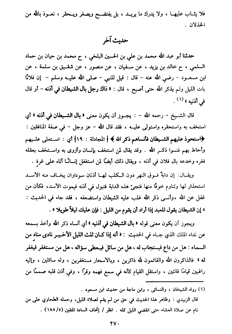 - حَدَّثَنَا أَبُو عَبْدِ اللَّهِ، مُحَمَّدُ بْنُ عَلِيِّ بْنِ الْحُسَيْنِ الْبَلْخِيُّ، ح مُحَمَّدُ بْنُ حَيَّانَ بْنِ حَمَّادٍ السُّلَمِيُّ، ح خَالِدُ بْنُ يَزِيدَ، عَنْ سُفْيَانَ، عَنْ مَنْصُورٍ، عَنْ شَقِيقِ بْنِ سَلَمَةَ، عَنِ ابْنِ مَسْعُودٍ، رَضِيَ اللَّهُ عَنْهُ قَالَ: قِيلَ لِلنَّبِيِّ صَلَّى اللهُ عَلَيْهِ وَسَلَّمَ: إِنَّ فُلَانًا بَاتَ اللَّيْلَ وَلَمْ يَذْكُرِ اللَّهَ، حَتَّى أَصْبَحَ قَالَ: " §ذَاكَ رَجُلٌ بَالَ الشَّيْطَانُ فِي أُذُنِهِ، أَوْ قَالَ: فِي أُذُنَيْهِ " قَالَ الشَّيْخُ رَحِمَهُ اللَّهُ: يَجُوزُ أَنْ يَكُونَ مَعْنَى «بَالَ الشَّيْطَانُ فِي أُذُنِهِ» أَيِ: اسْتَخَفَّ بِهِ، وَاسْتَحْقَرَهُ، وَاسْتَوْلَى عَلَيْهِ، فَقَدْ قَالَ اللَّهُ عَزَّ وَجَلَّ فِي صِفَةِ الْمُنَافِقِينَ {اسْتَحْوَذَ عَلَيْهِمُ الشَّيْطَانُ فَأَنْسَاهَمْ ذِكْرَ اللَّهِ} [المجادلة: 19] ، أَيِ: اسْتَعْلَى عَلَيْهِمْ، وَأَحَاطَ بِهِمْ، فَنَسَوْا ذِكْرَ اللَّهِ. وَقَدْ يُقَالُ لِمَنِ اسْتَخَفَّ بِإِنْسَانٍ، وَأَزْوَى بِهِ، وَاسْتَخَفَّ بِعَقْلِهِ، فَغَرَّهُ وَخَدَعَهُ: بَالَ فُلَانٌ فِي أُذُنِهِ، وَيُقَالُ ذَلِكَ أَيْضًا لِمَنِ اسْتَغْفَلَ إِنْسَانًا أَتَاهُ عَلَى غِرَّةٍ. وَيُقَالُ: إِنَّ دَابَّةً فَوْقَ النَّهَرِ دُونَ الْكَلْبِ لَهَا أُذُنَانِ سَوْدَاوَانِ يَخَافُ مِنْهُ الْأَسَدُ اسْتِحْذَارًا لَهَا، وَتَنَاوَمَ خَوْفًا مِنْهَا، فَتَجِيءُ هَذِهِ الدَّابَّةُ فَتَبُولُ فِي أُذُنِهِ فَيَمُوتُ الْأَسَدُ، فَكَأَنَّ مَنْ غَفَلَ عَنِ اللَّهِ، وَأُنْسِيَ ذِكْرَ اللَّهِ غَلَبَ عَلَيْهِ الشَّيْطَانُ وَاسْتَضْعَفَهُ، فَقَدْ جَاءَ فِي الْحَدِيثِ: " إِنَّ الشَّيْطَانَ يَقُولُ لِلْعَبْدِ إِذَا أَرَادَ أَنْ يَقُومَ مِنَ اللَّيْلِ: فَإِنَّ عَلَيْكَ لَيْلًا طَوِيلًا ". وَيَجُوزُ أَنْ يَكُونَ مَعْنَى قَوْلِهِ: «بَالَ الشَّيْطَانُ فِي أُذُنَيْهِ» أَيْ: أَنْسَاهُ ذِكْرَ اللَّهَ، وَأَخَذَ بِسَمْعِهِ عَنْ نِدَاءِ الْمَلَكِ الَّذِي جَاءَ فِي الْحَدِيثِ: " إِنَّهُ إِذَا كَانَ ثُلُثُ اللَّيْلِ الْأَخِيرُ نَادَى مُنَادٍ مِنَ السَّمَاءِ: هَلْ مِنْ دَاعٍ فَيُسْتَجَابَ لَهُ، هَلْ مِنْ سَائِلٍ فَيُعْطَى سُؤَالَهُ، هَلْ مِنْ مُسْتَغْفِرٍ فَيُغْفَرَ لَهُ " فَالذَّاكِرُونَ اللَّهَ، وَالْقَائِمُونَ لِلَّهِ ذَاكِرِينَ، وَبِالْأَسْحَارِ مُسْتَغْفِرِينَ، وَلَهُ سَائِلِينَ، وَإِلَيْهِ رَاغِبِينَ قِيَامًا قَانِتِينَ، وَاسْتَقَلَّ الْقِيَامَ كَأَنَّهُ فِي سَمْعِ فَهْمِهِ وَقْرًا، وَفِي أُذُنِ قَلْبِهِ صَمَمًا مِنْ -[271]- تَزْيِينِ الشَّيْطَانِ لَهُ، وَأَخْذِهِ عَنْ نِدَاءِ الْمَلَكِ، يُسْمِعُهُ بِوَسْوَسَتِهِ إِلَيْهِ؛ لِأَنَّ الْوَسْوَسَةَ كَلَامٌ خَفِيٌّ، وَإِكْثَارٌ مِنْهُ، فَكَأَنَّهُ يَشْغَلُهُ بِحَدِيثِهِ عَنْ سَمَاعِ نِدَاءِ الْمَلَكِ بِسَمْعِهِ لِوَسْوَسَتِهِ إِلَيْهِ، وَهُوَ اللَّعِينُ قَذِرٌ نَجِسٌ، فَأَفْعَالُهُ نَجِسَةٌ، وَأَعْمَالُهُ رَجِسَةٌ، وَقَذِرَةٌ مُنْتِنَةٌ، فَهُوَ إِذَا شَغَلَ سَمْعَ عَبْدٍ عَنِ الدَّاعِي بِشَهْوَةِ نَفْسِهِ وَبِوَسْوَسَتِهِ إِلَيْهِ أَتَى خَبِيثًا مِنَ الْأَمْرِ وَرِجْسًا مِنَ الصِّفَةِ، فَكَانَ كَأَنَّهُ بَالَ فِي أُذُنِهِ، نَسْأَلُ اللَّهَ تَعَالَى الْعَوْنَ عَلَيْهِ، وَالْعِصْمَةَ مِنْهُ، فَإِنَّهُ لَا حَوْلَ وَلَا قُوَّةَ إِلَّا بِاللَّهِ
