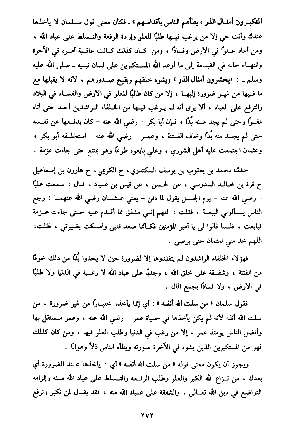 حَدَّثَنَا مُحَمَّدُ بْنُ يَعْقُوبَ بْنِ يُوسُفَ السَّكَنْدَرِيُّ، ح الْكَرِيمِيُّ، ح هَارُونُ بْنُ إِسْمَاعِيلَ، ح قُرَّةُ بْنُ خَالِدٍ السَّدُوسِيُّ، عَنِ الْحَسَنِ، عَنْ قَيْسِ بْنِ عَبَّادٍ، قَالَ: سَمِعْتُ عَلِيًّا، رَضِيَ اللَّهُ عَنْهُ يَوْمَ الْجَمَلِ يَقُولُ لَمَّا دُفِنَ - يَعْنِي - عُثْمَانَ رَضِيَ اللَّهُ عَنْهُمَا: رَجَعَ النَّاسُ يَسْأَلُونِي الْبَيْعَةَ فَقُلْتُ: اللَّهُمَّ إِنِّي مُشْفِقٌ مِمَّا أَقْدَمُ عَلَيْهِ، حَتَّى جَاءَتْ عَزْمَةً، فَبَايَعْتُ، فَلَمَّا قَالُوا لِي: يَا أَمِيرَ الْمُؤْمِنِينَ فَكَأَنَّمَا صَعِدَ قَلْبِي، وَأَمْسَكْتُ بِغَيْرَتِي، فَقُلْتُ: §اللَّهُمَّ خُذْ مِنِّي لِعُثْمَانَ حَتَّى يَرْضَى فَهَؤُلَاءِ الْخُلَفَاءُ الرَّاشِدُونَ لَمْ يَتَقَلَّدُوهَا إِلَّا لِضَرُورَةٍ حِينَ لَا يَجِدُوا بُدًّا مِنْ ذَلِكَ خَوْفًا مِنَ الْفِتْنَةِ، وَشَفَقَةً عَلَى خَلْقِ اللَّهِ، وَحَدْبًا عَلَى عِبَادِ اللَّهِ، لَا رَغْبَةً فِي الدُّنْيَا، وَلَا طَلَبًا فِي الْأَرْضِ، وَلَا فَسَادًا بِجَمْعِ الْمَالِ. فَقَوْلُ سَلْمَانَ: مَنْ سَلَتَ اللَّهُ أَنْفَهُ أَيْ: إِنَّمَا يَأْخُذُهُ اخْتِيَارًا مِنْ غَيْرِ ضَرُورَةٍ مَنْ سَلَتَ اللَّهُ أَنْفَهُ؛ لِأَنَّهُ لَمْ يَكُنْ يَأْخُذُهَا فِي حَيَاةِ عُمَرَ رَضِيَ اللَّهُ عَنْهُ، وَعُمَرُ مُسْتَقِلٌّ بِهَا، وَأَفْضَلُ النَّاسِ يَوْمَئِذٍ عُمَرُ إِلَّا مَنْ رَغِبَ فِي الدُّنْيَا، وَطَلَبَ الْعُلُوَّ فِيهَا، وَمَنْ كَانَ كَذَلِكَ فَهُوَ مِنَ الْمُسْتَكْبِرِينَ الَّذِينَ يُشَوِّهُ فِي الْآخِرَةِ صُورَتَهُ، وَيَطَأُهُ النَّاسُ ذُلًّا وَهَوَانًا. وَيَجُوزُ أَنْ يَكُونَ مَعْنَى قَوْلِهِ: مَنْ سَلَتَ اللَّهُ أَنْفَهُ أَيْ: يَأْخُذُهَا عِنْدَ الضَّرُورَةِ، أَيْ: بَعْدَكَ، مِنْ نِزَاعِ اللَّهِ الْكِبْرَ وَالْعُلُوَّ، وَطَلَبِ الرِّفْعَةِ وَالتَّسَلُّطِ عَلَى عِبَادِ اللَّهِ مِنْهُ، وَإِلْزَامِهِ التَّوَاضُعَ فِي دِينِ اللَّهِ تَعَالَى وَالشَّفَقَةَ عَلَى عِبَادِ اللَّهِ مِنْهُ، فَقَدْ يُقَالُ لِمَنْ تَكَبَّرَ وَتَرَفَّعَ -[273]- وَاسْتَطَالَ عَلَى النَّاسِ شَمَخَ بِأَنْفِهِ، فَيَجُوزُ أَنْ يَكُونَ: «سَلَتَ اللَّهُ أَنْفَهُ» أَيْ: نَزَعَ الْكِبْرَ مِنْهُ، وَنَفَاهُ عَنْهُ، فَيَكُونُ الْأَنْفُ عِبَارَةً عَنِ الْكِبْرِ وَالتَّعَظُّمِ. وَوَضْعُ الْخَدِّ بِالْأَرْضِ، وَإِلْصَاقُهُ بِهَا عِبَارَةٌ عَنِ التَّوَاضُعِ لِلَّهِ، وَالتَّذَلُّلِ لِعِبَادِ اللَّهِ، كَمَا قَالَ اللَّهُ تَعَالَى {أَذِلَّةٍ عَلَى الْمُؤْمِنِينَ أَعِزَّةٍ عَلَى الْكَافِرِينَ} [المائدة: 54] ، فَكَأَنَّهُ قَالَ: يَأْخُذُهَا عَنْكَ بَعْدَكَ يَا عُمَرُ مَنْ لَا يُرِيدُ بِهَا عُلُوًّا فِي الْأَرْضِ وَلَا فَسَادًا، بَلْ يُرِيدُ بِهَا تَوَاضُعًا لِلَّهِ وَشَفَقَةً عَلَى عَبَادِ اللَّهِ ضَرُورَةَ مَخَافَةِ الْفِتْنَةِ فِي الدِّينِ، وَتَشْتِيتِ كَلِمَةِ الْمُسْلِمِينَ، فَكَانَ كَمَا أَخَذَهَا بَعْدَ عُمَرَ عُثْمَانُ رَضِيَ اللَّهُ عَنْهُمَا مُتَوَاضِعًا مُتَذَلِّلًا غَيْرَ مُتَكَبِّرٍ وَلَا مُتَجَبِّرٍ، إِمَامًا عَادِلًا خَلِيفَةً صَادِقًا تَسْتَحِييهِ الْمَلَائِكَةُ رَضِيَ اللَّهُ عَنْهُ، وَبَعْدَهُ الْهَادِي الْمَهْدِيُّ أَخُو رَسُولِ اللَّهِ صَلَّى اللهُ عَلَيْهِ وَسَلَّمَ، يُحِبُّهُ اللَّهُ وَرَسُولُهُ، وَيُحِبُّ اللَّهَ وَرَسُولَهُ رَضِيَ اللَّهُ تَعَالَى عَنْهُمْ أَجْمَعِينَ، وَأَلْحَقَنَا بِهِمْ آمِينَ رَبَّ الْعَالَمِينَ