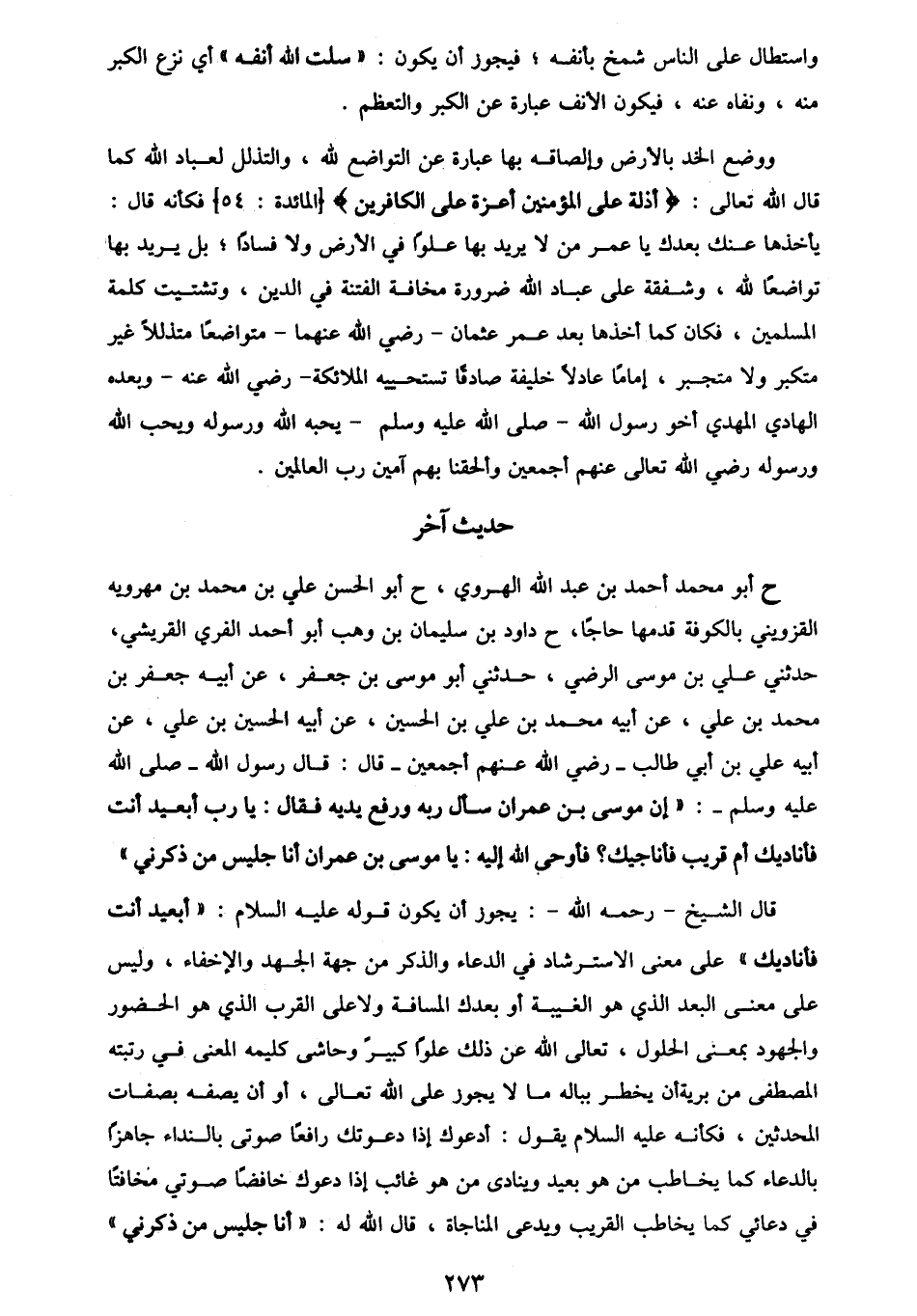 - ح أَبُو مُحَمَّدٍ، أَحْمَدُ بْنُ عَبْدِ اللَّهِ الْهَرَوِيُّ، ح أَبُو الْحَسَنِ، عَلِيُّ بْنُ مُحَمَّدِ بْنِ مَهْرَوَيْهِ الْقَزْوِينِيُّ بِالْكُوفَةِ قَدِمَهَا حَاجًّا، ح دَاوُدُ بْنُ سُلَيْمَانَ بْنِ وَهْبٍ أَبُو أَحْمَدَ الْفَرِيُّ الْقُرَيْشِيُّ، حَدَّثَنِي عَلِيُّ بْنُ مُوسَى الرَّضِيُّ، حَدَّثَنِي أَبُو مُوسَى بْنُ جَعْفَرٍ، عَنْ أَبِيهِ جَعْفَرِ بْنِ مُحَمَّدِ بْنِ عَلِيٍّ، عَنْ أَبِيهِ مُحَمَّدِ بْنِ عَلِيِّ بْنِ الْحُسَيْنِ، عَنْ أَبِيهِ الْحُسَيْنِ بْنِ عَلِيٍّ، عَنْ أَبِيهِ عَلِيِّ بْنِ أَبِي طَالِبٍ رَضِيَ اللَّهُ عَنْهُمْ أَجْمَعِينَ قَالَ: قَالَ رَسُولُ اللَّهِ صَلَّى اللهُ عَلَيْهِ وَسَلَّمَ: " إِنَّ مُوسَى بْنَ عِمْرَانَ سَأَلَ رَبَّهُ، وَرَفَعَ يَدَيْهِ، فَقَالَ: يَا رَبِّ أَبَعِيدٌ أَنْتَ فَأُنَادِيَكَ، أَمْ قَرِيبٌ فَأُنَاجِيَكَ؟ فَأَوْحَى اللَّهُ إِلَيْهِ: يَا مُوسَى بْنَ عِمْرَانَ §أَنَا جَلِيسُ مَنْ ذَكَرَنِي " قَالَ الشَّيْخُ رَحِمَهُ اللَّهُ: يَجُوزُ أَنْ يَكُونَ قَوْلُهُ عَلَيْهِ السَّلَامُ: «أَبَعِيدٌ أَنْتَ فَأُنَادِيَكَ» عَلَى مَعْنَى الِاسْتِرْشَادِ فِي الدُّعَاءِ وَالذِّكْرِ مِنْ جِهَةِ الْجَهْدِ وَالْإِخْفَاءِ، وَلَيْسَ عَلَى مَعْنَى الْبُعْدِ الَّذِي هُوَ الْغَيْبَةُ، أَوْ بُعْدُ الْمَسَافَةِ، وَلَا عَلَى الْقُرْبِ الَّذِي هُوَ الْحُضُورُ وَالْجُهُودُ بِمَعْنَى الْحُلُولِ، تَعَالَى اللَّهُ عَنْ ذَلِكَ عُلُوًّا كَبِيرًا، وَحَاشَى كَلِيمَهُ الْمَعْنِيَّ فِي رُتْبَتِهِ الْمُصْطَفَى مِنْ بَرِيَّتِهِ أَنْ يَخْطُرَ بِبَالِهِ مَا لَا يَجُوزُ عَلَى اللَّهِ تَعَالَى، أَوْ أَنْ يَصِفَهُ بِصِفَاتِ الْمُحْدَثِينَ، فَكَأَنَّهُ عَلَيْهِ السَّلَامُ يَقُولُ: أَدْعُوكَ إِذَا دَعَوْتُكَ رَافِعًا صَوْتِي بِالنِّدَاءِ، جَاهِرًا بِالدُّعَاءِ، كَمَا يُخَاطَبُ مَنْ هُوَ بَعِيدٌ، وَيُنَادَى مَنْ هُوَ غَائِبٌ، إِذَا دَعَوْتُكَ خَافِضًا صَوْتِي مُخَافِتًا فِي دُعَائِي، كَمَا يُخَاطَبُ الْقَرِيبُ، وَيُدْعَى الْمُنَاجَى، قَالَ اللَّهُ لَهُ: «أَنَا جَلِيسُ مَنْ ذَكَرَنِي»