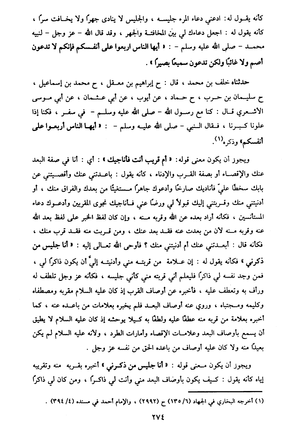 وَقَدْ قَالَ اللَّهُ عَزَّ وَجَلَّ لِنَبِيِّهِ مُحَمَّدٍ صَلَّى اللهُ عَلَيْهِ وَسَلَّمَ: «§أَيُّهَا النَّاسُ ارْبَعُوا عَلَى أَنْفُسِكُمْ، فَإِنَّكُمْ لَا تَدْعُونَ أَصَمَّ وَلَا غَائِبًا، وَلَكِنْ تَدْعُونَ سَمِيعًا بَصِيرًا» حَدَّثَنَاهُ خَلْفُ بْنُ مُحَمَّدٍ، قَالَ: ح إِبْرَاهِيمُ بْنُ مَعْقِلٍ، ح مُحَمَّدُ بْنُ إِسْمَاعِيلَ، ح سُلَيْمَانُ بْنُ حَرْبٍ، ح حَمَّادٌ، عَنْ أَيُّوبَ، عَنْ أَبِي عُثْمَانَ، عَنْ أَبِي مُوسَى الْأَشْعَرِيِّ، قَالَ: كُنَّا مَعَ رَسُولِ اللَّهِ صَلَّى اللهُ عَلَيْهِ وَسَلَّمَ فِي سَفَرٍ، فَكُنَّا إِذَا عَلَوْنَا كَبَّرْنَا، فَقَالَ النَّبِيُّ صَلَّى اللهُ عَلَيْهِ وَسَلَّمَ: «أَيُّهَا النَّاسُ أَرْبِعُوا عَلَى أَنْفُسَكُمْ» ، وَذَكَرَهُ وَيَجُوزُ أَنْ يَكُونَ مَعْنَى قَوْلِهِ: «أَمْ قَرِيبٌ أَنْتَ فَأُنَاجِيَكَ» أَيْ: أَنَا فِي صِفَةِ الْبُعْدِ عَنْكَ وَالْإِقْصَاءِ أَوْ بِصِفَةِ الْقُرْبِ وَالْإِدْنَاءِ، كَأَنَّهُ يَقُولُ: بَاعَدْتَنِي عَنْكَ وَأَقْصَيْتَنِي عَنْ بَابِكَ سَخَطًا عَلَيَّ فَأُنَادِيَكَ صَارِخًا، وَأَدْعُوكَ جَاهِرًا مُسْتَغِيثًا مِنْ بُعْدِكَ وَالْفِرَاقِ مِنْكَ، أَوْ أَدْنَيْتَنِي مِنْكَ، وَقَرَّبْتَنِي إِلَيْكَ قَبُولًا لِي، وَرِضًا عَنِّي فَأُنَاجِيَكَ نَجْوَى الْمُقَرَّبِينَ، وَأَدْعُوكَ دُعَاءَ الْمُسْتَأْنِسِينَ، فَكَأَنَّهُ أَرَادَ بُعْدَهُ عَنِ اللَّهِ وَقُرْبَهُ مِنْهُ، وَإِنْ كَانَ لَفْظُ الْخَبَرِ عَلَى لَفْظِ بُعْدِ اللَّهِ عَنْهُ وَقُرْبِهِ مِنْهُ؛ لِأَنَّ مَنْ بَعُدْتَ عَنْهُ فَقَدْ بَعُدَ عَنْكَ، وَمَنْ قَرُبْتَ مِنْهُ فَقَدْ قَرُبَ مِنْكَ، فَكَأَنَّهُ يَقُولُ: أَبْعَدْتَنِي عَنْكَ أَمْ أَدْنَيْتَنِي مِنْكَ؟ فَأَوْحَى اللَّهُ تَعَالَى إِلَيْهِ: «أَنَا جَلِيسُ مَنْ ذَكَرَنِي» ، فَكَأَنَّهُ يَقُولُ لَهُ: إِنَّ عَلَامَةَ مَنْ قَرَّبْتُهُ مِنِّي وَأَدْنَيْتُهُ إِلَيَّ أَنْ يَكُونَ ذَاكِرًا لِي، فَمَنْ وَجَدَ نَفْسَهُ لِي ذَاكِرًا، فَلْيَعْلَمْ أَنِّي قَرَّبْتُهُ مِنِّي، كَأَنِّي جَلِيسُهُ، فَكَأَنَّهُ عَزَّ وَجَلَّ تَلَطَّفَ لَهُ، وَرَأَفَ بِهِ، وَتَعَطَّفَ عَلَيْهِ، فَأَخْبَرَهُ عَنْ أَوْصَافِ الْقُرْبِ، إِذْ كَانَ عَلَيْهِ السَّلَامُ مُقَرَّبَهُ وَمُصْطَفَاهُ وَكَلِيمَهُ وَمُجْتَبَاهُ، وَوَارَى عَنْهُ أَوْصَافَ الْبُعْدِ فَلَمْ يُخْبِرْهُ بِعَلَامَاتِ مَنْ بَاعَدَهُ عَنْهُ، كَمَا أَخْبَرَهُ بِعَلَامَةِ مَنْ قَرَّبَهُ مِنْهُ عَطْفًا عَلَيْهِ، وَلُطْفًا بِهِ كَيْلَا يُوحِشَهُ إِذْ كَانَ عَلَيْهِ السَّلَامُ لَا يُطِيقُ أَنْ يَسْمَعَ بِأَوْصَافِ الْبُعْدِ، وَعَلَامَاتِ الْإِقْصَاءِ، وَأَمَارَاتِ الطَّرْدِ، وَلِأَنَّهُ عَلَيْهِ السَّلَامُ لَمْ يَكُنْ بَعِيدًا مِنْهُ، وَلَا كَانَ عَلَيْهِ أَوْصَافُ مَنْ بَاعَدَهُ الْحَقُّ مِنْ نَفْسِهِ عَزَّ وَجَلَّ. وَيَجُوزُ أَنْ يَكُونَ مَعْنَى قَوْلِهِ: «أَنَا جَلِيسُ مَنْ ذَكَرَنِي» أَخْبَرَهُ بِقُرْبِهِ مِنْهُ، وَتَقْرِيبِهِ إِيَّاهُ، كَأَنَّهُ يَقُولُ: كَيْفَ تَكُونُ بِأَوْصَافِ الْبُعْدِ مِنِّي وَأَنْتَ لِي ذَاكِرًا، وَمَنْ كَانَ لِي ذَاكِرًا -[275]- كُنْتُ لَهُ جَلِيسًا، أَخْبَرَهُ بِأَنَّهُ مُنِعَ بِأَبْلَغِ غَايَاتِ الْقُرْبِ، وَأَقْصَى نِهَايَاتِ الدُّنُوِّ إِلَيْهِ، كَأَنَّهُ يَقُولُ لَهُ: أَنْتَ مِنِّي بِالْقُرْبِ وَالدُّنُوِّ بِمَنْزِلَةِ الْمَرْءِ مِنْ جَلِيسِهِ. وَلَمْ يَقُلْ فِي الْحَدِيثِ: إِنَّ مَنْ ذَكَرَنِي جَلِيسِي؛ لِأَنَّهُ لَوْ كَانَ كَذَلِكَ لَكَانَتِ الْحَالَةُ مُكْتَسِبَةً، وَلَمْ يَكُنْ فِيهِ دَلَالَةُ الْخُصُوصِ وَالْإِفْضَالِ عَلَى مَنْ آَثَرَهُ اللَّهُ؛ لِأَنَّ اللَّهَ تَعَالَى أَجَلُّ مِنْ أَنْ يُرَامَ مُجَالَسَتُهُ وَال