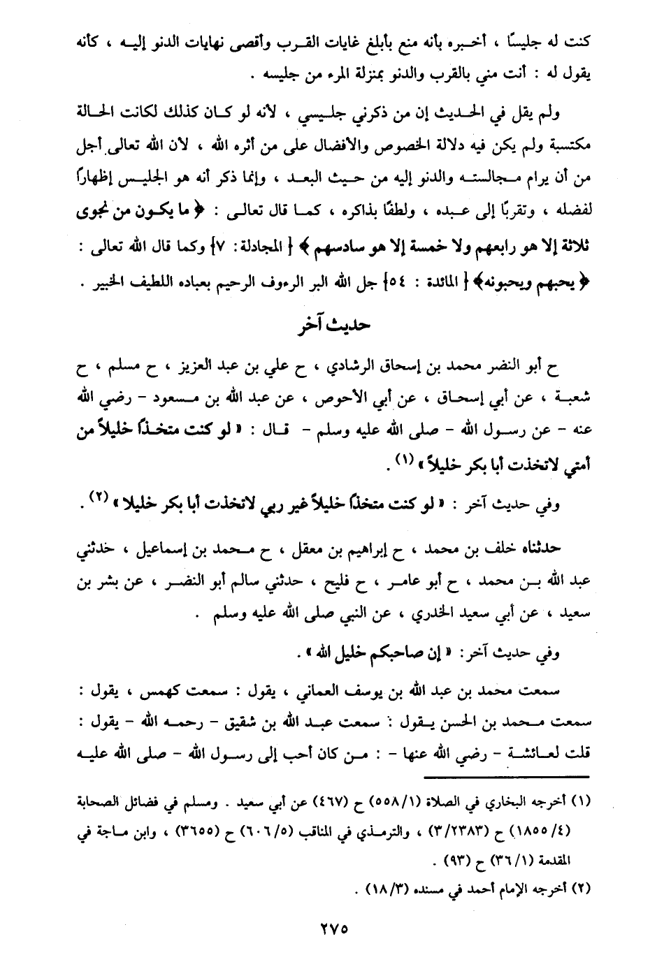 ح أَبُو النَّضْرِ مُحَمَّدُ بْنُ إِسْحَاقَ الرَّشَادِيُّ، ح عَلِيُّ بْنُ عَبْدِ الْعَزِيزِ، ح مُسْلِمٌ، ح شُعْبَةُ، عَنْ أَبِي إِسْحَاقَ، عَنْ أَبِي الْأَحْوَصِ، عَنْ عَبْدِ اللَّهِ بْنِ مَسْعُودٍ، رَضِيَ اللَّهُ عَنْهُ، عَنْ رَسُولِ اللَّهِ صَلَّى اللهُ عَلَيْهِ وَسَلَّمَ قَالَ: §«لَوْ كُنْتُ مُتَّخِذًا خَلِيلًا مِنْ أُمَّتِي لَاتَّخَذْتُ أَبَا بَكْرٍ خَلِيلًا»