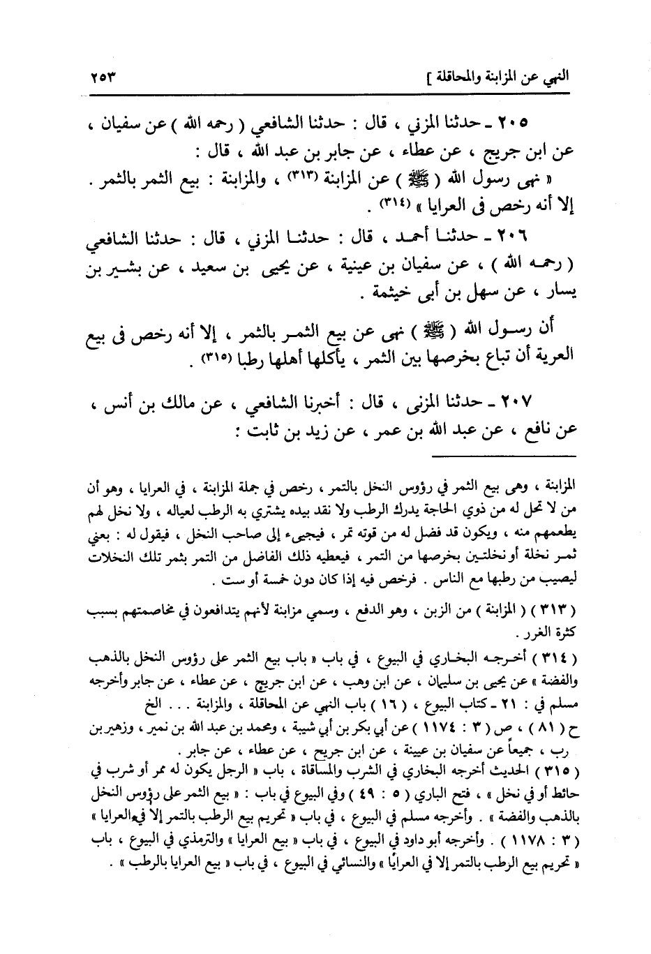 ٢٠٥ - عَنْ سُفْيَانَ بْنِ عُيَيْنَةَ، عَنِ ابْنِ جُرَيْجٍ، عَنْ عَطَاءٍ، عَنْ جَابِرِ بْنِ عَبْدِ اللَّهِ، قَالَ: نَهَى رَسُولُ اللَّهِ صَلَّى اللهُ عَلَيْهِ وَسَلَّمَ عَنِ الْمُزَابَنَةِ، وَالْمُزَابَنَةُ بَيْعُ الثَّمَرِ بِالتَّمْرِ إِلَّا أَنَّهُ رَخَّصَ فِي الْعَرَايَا "