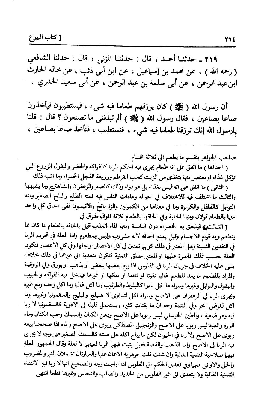 ٢١٩ - عَنْ مُحَمَّدِ بْنِ إِسْمَاعِيلَ، عَنِ ابْنِ أَبِي ذِئْبٍ , عَنْ خَالِهِ الْحَارِثِ بْنِ عَبْدِ الرَّحْمَنِ، عَنْ أَبِي سَلَمَةَ بْنِ عَبْدِ الرَّحْمَنِ عَنْ أَبِي سَعِيدٍ الْخُدْرِيِّ، أَنَّ رَسُولَ اللَّهِ صَلَّى اللهُ عَلَيْهِ وَسَلَّمَ، كَانَ يَرْزُقُهُمْ طَعَامًا فِيهِ شَيْءٌ فَيَسْتَطِيبُونَ فَيَأْخُذُونَ صَاعًا بِصَاعَيْنِ فَقَالَ رَسُولُ اللَّهِ صَلَّى اللهُ عَلَيْهِ وَسَلَّمَ: «أَلَمْ يَبْلُغْنِي مَا تَصْنَعُونَ؟» قَالَ: قُلْنَا: يَا رَسُولَ اللَّهِ، إِنَّكَ تَرْزُقُنَا طَعَامًا فِيهِ شَيْءٌ فَنَسْتَطِيبُ فَنَأْخُذُ صَاعًا بِصَاعَيْنِ ⦗٢٦٥⦘، فَقَالَ رَسُولُ اللَّهِ صَلَّى اللهُ عَلَيْهِ وَسَلَّمَ: «دِينَارٌ بِدِينَارٍ وَدِرْهَمٌ بِدِرْهَمٍ وَصَاعُ تَمْرٍ بِصَاعِ تَمْرٍ وَصَاعُ شَعِيرٍ بِصَاعِ شَعِيرٍ لَا فَضْلَ بَيْنَ شَيْءٍ مِنْ ذَلِكَ»