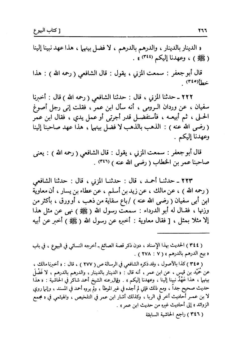 ٢٢٢ - أَنْبَأَنَا سُفْيَانُ، عَنْ وَرْدَانَ الرُّومِيِّ، أَنَّهُ سَأَلَ ابْنَ عُمَرَ فَقَالَ: إِنِّي رَجُلٌ أَصُوغُ الْحُلِيَّ ثُمَّ أَبِيعُهُ فَأَسْتَفْضِلُ قَدْرَ أُجْرَتِي أَوْ عَمَلَ يَدِي فَقَالَ ابْنُ عُمَرَ رَضِيَ اللَّهُ عَنْهُ: الذَّهَبُ بِالذَّهَبِ لَا فَضْلَ بَيْنَهُمَا هَذَا عَهْدُ صَاحِبِنَا إِلَيْنَا وَعَهْدُنَا إِلَيْكُمْ ". حَدَّثَنَا أَحْمَدُ قَالَ: سَمِعْتُ الْمُزَنِيَّ يَقُولُ: قَالَ الشَّافِعِيُّ رَحِمَهُ اللَّهُ: يَعْنِي صَاحِبَنَا عُمَرَ بْنَ الْخَطَّابِ رَضِيَ اللَّهُ عَنْهُ