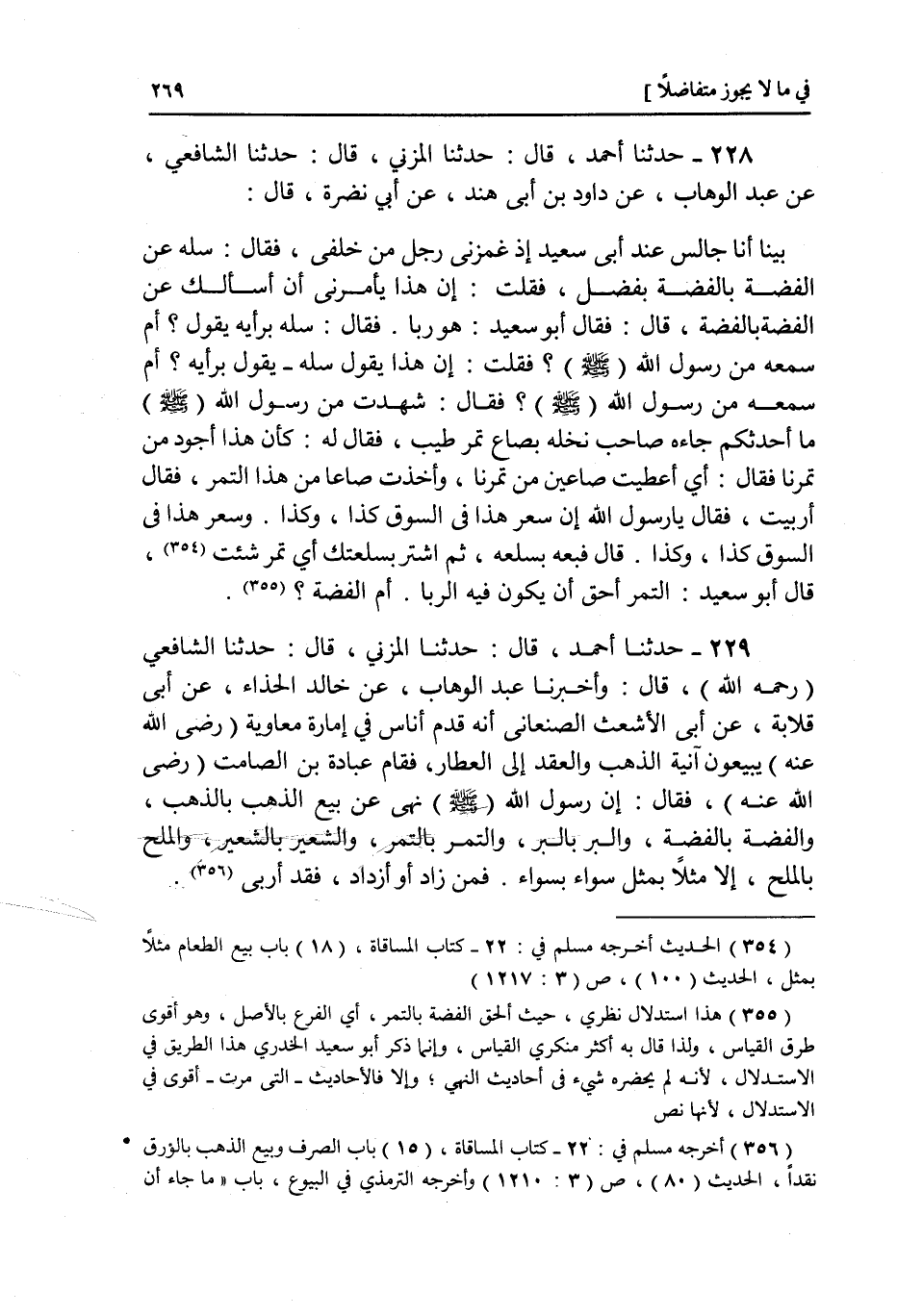 ٢٢٨ - عَنْ عَبْدِ الْوَهَّابِ، عَنْ دَاوُدَ بْنِ أَبِي هِنْدَ، عَنْ أَبِي نَضْرَةَ، قَالَ: بَيْنَا أَنَا جَالِسٌ، عِنْدَ أَبِي سَعِيدٍ الْخُدْرِيِّ إِذْ غَمَزَنِي رَجُلٌ مِنْ خَلْفِي فَقَالَ: سَلْهُ عَنِ الْفِضَّةِ بِالْفِضَّةِ بِفَضْلٍ فَقُلْتُ: إِنَّ هَذَا يَأْمُرُنِي أَنْ أَسْأَلَكَ عَنِ الْفِضَّةِ بِالْفِضَّةِ فَقَالَ أَبُو سَعِيدٍ: هُوَ رِبًا، فَقَالَ: سَلْهُ بِرَأْيِهِ يَقُولُ أَمْ سَمِعَهُ مِنْ رَسُولِ اللَّهِ صَلَّى اللهُ عَلَيْهِ وَسَلَّمَ؟ فَقُلْتُ: إِنَّ هَذَا يَقُولُ: سَلْهُ بِرَأْيِهِ يَقُولُ أَمْ سَمِعَهُ مِنْ رَسُولِ اللَّهِ صَلَّى اللهُ عَلَيْهِ وَسَلَّمَ؟ فَقَالَ: شَهِدْتُ مِنْ رَسُولِ اللَّهِ صَلَّى اللهُ عَلَيْهِ وَسَلَّمَ مَا أُحَدِّثُكُمْ: جَاءَهُ صَاحِبُ نَخْلَةٍ بِصَاعِ تَمْرٍ طَيِّبٍ فَقَالَ لَهُ: «كَأَنَّ هَذَا أَجْوَدُ مِنْ تَمْرِنَا» فَقَالَ: إِنِّي أَعْطَيْتُ صَاعَيْنِ مِنْ تَمْرِنَا وَأَخَذْتُ صَاعًا مِنْ هَذَا التَّمْرِ فَقَالَ: «أَرْبَيْتَ» فَقَالَ: يَا رَسُولَ اللَّهِ إِنَّ سِعْرَ هَذَا فِي السُّوقِ كَذَا وَكَذَا وَسِعْرُ هَذَا فِي السُّوقِ كَذَا وَكَذَا قَالَ: «فَبِعْهُ بِسِلْعَةٍ، ثُمَّ اشْتَرِ بِسِلْعَتِكَ أَيَّ تَمْرٍ شِئْتَ» قَالَ أَبُو سَعِيدٍ: التَّمْرُ أَحَقُّ أَنْ يَكُونَ فِيهِ الرِّبَا أَمِ الْفِضَّةُ