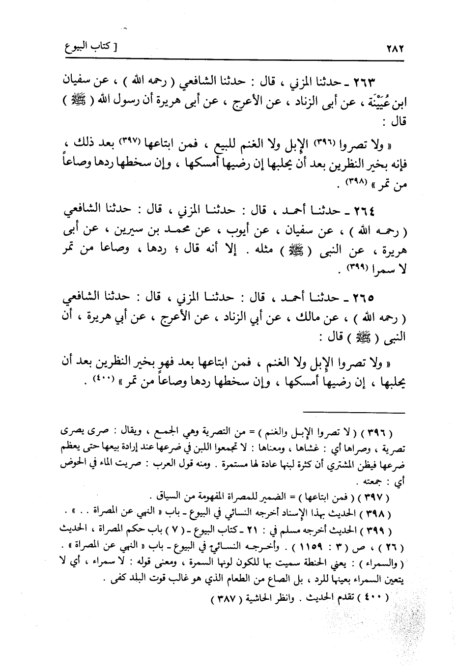 ٢٦٣ - عَنْ سُفْيَانَ، عَنْ أَبِي الزِّنَادِ، عَنِ الْأَعْرَجِ، عَنْ أَبِي هُرَيْرَةَ، أَنَّ رَسُولَ اللَّهِ صَلَّى اللهُ عَلَيْهِ وَسَلَّمَ قَالَ: «وَلَا تُصَرُّوا الْإِبِلَ وَلَا الْغَنَمَ لِلْبَيْعِ فَمَنِ ابْتَاعَهَا بَعْدَ ذَلِكَ فَهُوَ بِخَيْرِ النَّظَرَيْنِ بَعْدَ أَنْ يَحْلِبَهَا إِنْ رَضِيَهَا أَمْسَكَهَا وَإِنْ سَخِطَهَا رَدَّهَا وَصَاعًا مِنْ تَمْرٍ» . عَنْ سُفْيَانَ، عَنْ أَيُّوبَ، عَنْ مُحَمَّدِ بْنِ سِيرِينَ، عَنْ أَبِي هُرَيْرَةَ، عَنِ النَّبِيِّ صَلَّى اللهُ عَلَيْهِ وَسَلَّمَ مِثْلَهُ إِلَّا أَنَّهُ قَالَ: «رَدَّهَا وَصَاعًا مِنْ تَمْرٍ لَا سَمْرَاءَ»