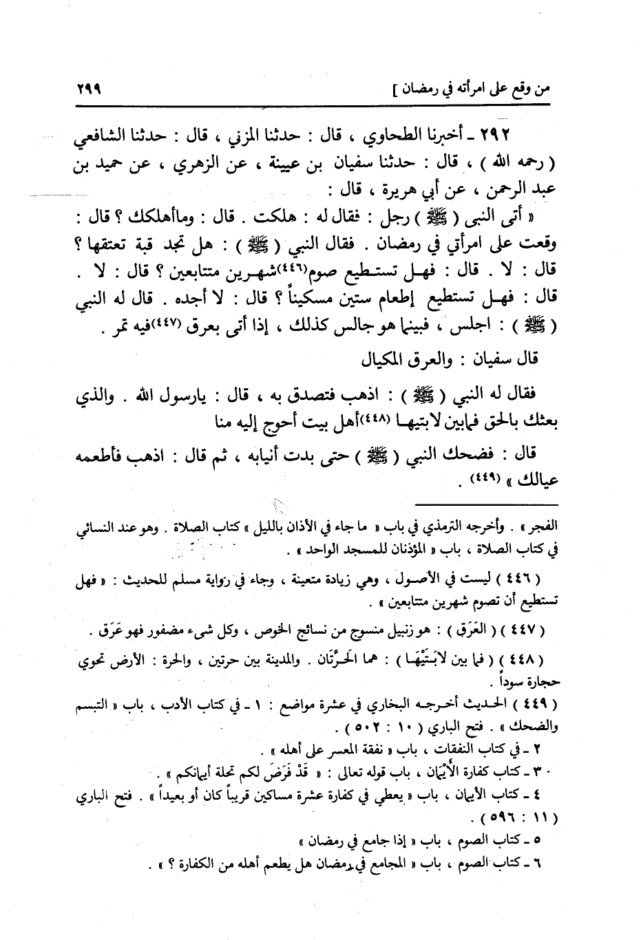 ٢٩٢ - حَدَّثَنَا سُفْيَانُ بْنُ عُيَيْنَةَ، عَنِ الزُّهْرِيِّ، عَنْ حُمَيْدِ بْنِ عَبْدِ الرَّحْمَنِ، عَنْ أَبِي هُرَيْرَةَ، قَالَ: أَتَى النَّبِيَّ صَلَّى اللهُ عَلَيْهِ وَسَلَّمَ رَجُلٌ فَقَالَ لَهُ: هَلَكْتُ قَالَ: «وَمَا أَهْلَكَكَ؟» قَالَ: وَقَعْتُ عَلَى امْرَأَتِي فِي رَمَضَانَ فَقَالَ النَّبِيُّ صَلَّى اللهُ عَلَيْهِ وَسَلَّمَ: «هَلْ تَجِدُ رَقَبَةً تُعْتِقُهَا؟» قَالَ: لَا قَالَ: «فَهَلْ تَسْتَطِيعُ صَوْمَ شَهْرَيْنِ مُتَتَابِعَيْنِ؟» قَالَ: لَا قَالَ: «فَهَلْ تَسْتَطِيعُ إِطْعَامَ سِتِّينَ مِسْكِينًا؟» قَالَ: لَا أَجِدُهُ قَالَ لَهُ النَّبِيُّ صَلَّى اللهُ عَلَيْهِ وَسَلَّمَ: «اجْلِسْ» فَبَيْنَمَا هُوَ جَالِسٌ كَذَلِكَ إِذْ أُتِيَ بِعَرَقٍ فِيهِ تَمْرٌ، قَالَ سُفْيَانُ: وَالْعَرَقُ الْمِكْيَالُ، فَقَالَ لَهُ النَّبِيُّ صَلَّى اللهُ عَلَيْهِ وَسَلَّمَ: «اذْهَبْ فَتَصَدَّقْ بِهِ» قَالَ: يَا رَسُولَ اللَّهِ وَالَّذِي بَعَثَكَ بِالْحَقِّ فَمَا بَيْنَ لَابَتَيْهَا أَهْلُ بَيْتٍ أَحْوَجُ إِلَيْهِ مِنَّا قَالَ: فَضَحِكَ النَّبِيُّ صَلَّى اللهُ عَلَيْهِ وَسَلَّمَ حَتَّى بَدَتْ أَنْيَابُهُ ثُمَّ قَالَ: «اذْهَبْ فَأَطْعِمْهُ عِيَالَكَ»