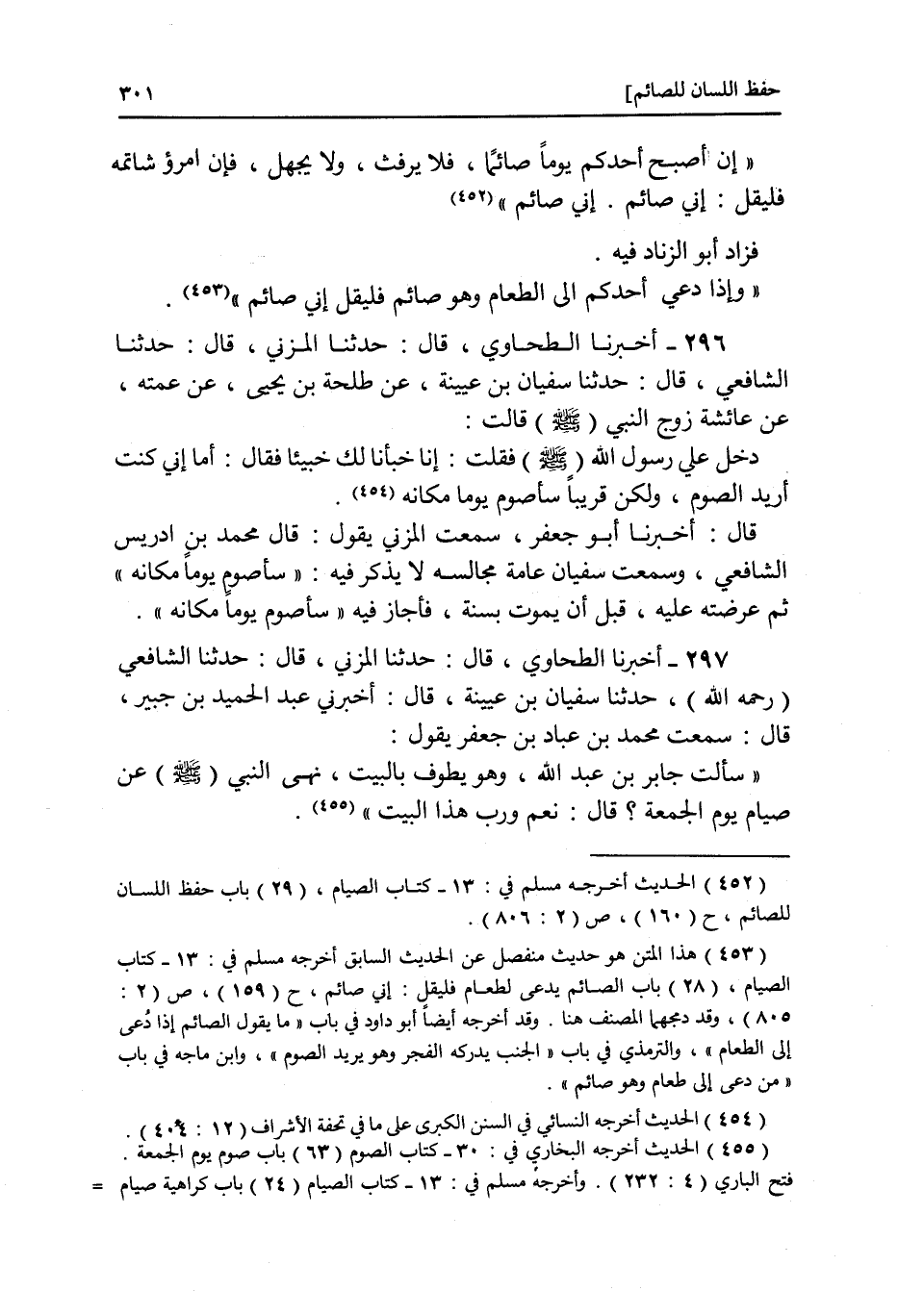 ٢٩٦ - حَدَّثَنَا سُفْيَانُ بْنُ عُيَيْنَةَ، عَنْ طَلْحَةَ بْنِ يَحْيَى، عَنْ عَمَّتِهِ، عَنْ عَائِشَةَ، زَوْجِ النَّبِيِّ صَلَّى اللهُ عَلَيْهِ وَسَلَّمَ قَالَتْ: دَخَلَ عَلَيَّ رَسُولُ اللَّهِ صَلَّى اللهُ عَلَيْهِ وَسَلَّمَ فَقُلْتُ: إِنَّا خَبَأْنَا لَكَ حَيْسًا فَقَالَ: «أَمَا إِنِّي كُنْتُ أُرِيدُ الصَّوْمَ وَلَكِنْ قَرِّبِيهِ سَأَصُومُ يَوْمًا مَكَانَهُ» . قَالَ لَنَا أَبُو جَعْفَرٍ: سَمِعْتُ الْمُزَنِيَّ يَقُولُ: قَالَ مُحَمَّدُ بْنُ إِدْرِيسَ الشَّافِعِيُّ رَحِمَهُ اللَّهُ: وَسَمِعْتُ سُفْيَانَ عَامَّةَ مُجَالَسَتِهِ لَا يَذْكُرُ فِيهِ «سَأَصُومُ يَوْمًا مَكَانَهُ» ، ثُمَّ عَرَضْتُهُ عَلَيْهِ قَبْلَ أَنْ يَمُوتَ بِسَنَةٍ فَأَجَازَ فِيهِ «سَأَصُومُ يَوْمًا مَكَانَهُ»