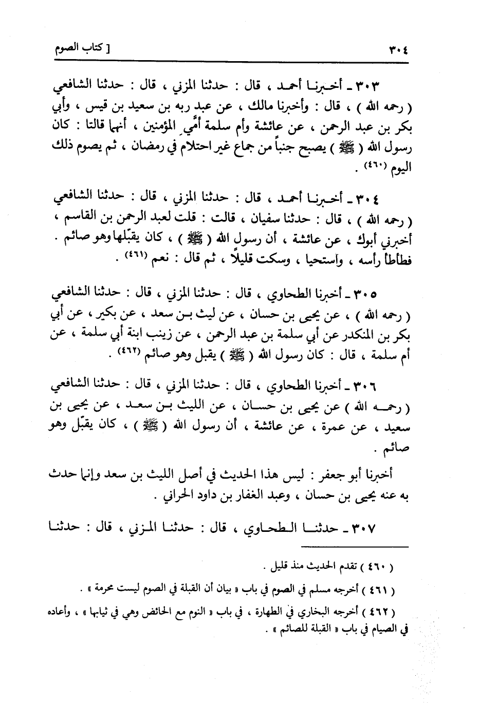 ٣٠٥ - عَنْ يَحْيَى بْنِ حَسَّانَ، عَنْ لَيْثِ بْنِ سَعْدٍ، عَنْ بُكَيْرٍ، عَنْ أَبِي بَكْرِ بْنِ الْمُنْكَدِرِ، عَنْ أَبِي سَلَمَةَ بْنِ عَبْدِ الرَّحْمَنِ , عَنْ زَيْنَبَ بِنْتِ أَبِي سَلَمَةَ , عَنْ أُمِّ سَلَمَةَ، قَالَ: كَانَ رَسُولُ اللَّهِ صَلَّى اللهُ عَلَيْهِ وَسَلَّمَ يُقَبِّلُ وَهُوَ صَائِمٌ "