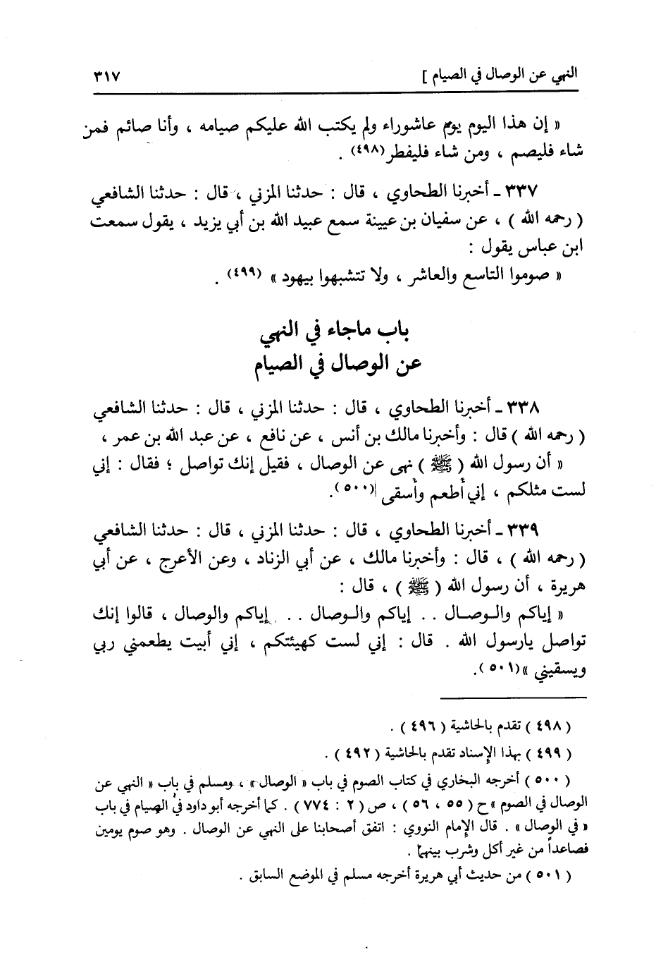 ٣٣٩ - وَأَخْبَرَنَا مَالِكٌ، عَنْ أَبِي الزِّنَادِ، وَعَنِ الْأَعْرَجِ، عَنْ أَبِي هُرَيْرَةَ، أَنَّ رَسُولَ اللَّهِ صَلَّى اللهُ عَلَيْهِ وَسَلَّمَ قَالَ: «إِيَّاكُمْ وَالْوِصَالَ، إِيَّاكُمْ وَالْوِصَالَ، إِيَّاكُمْ وَالْوِصَالَ» قَالُوا: إِنَّكَ تُوَاصِلُ يَا رَسُولَ اللَّهِ؟ قَالَ: " إِنِّي لَسْتُ كَهَيْئَتِكُمْ: إِنِّي أَبِيتُ يُطْعِمُنِي رَبِّي وَيَسْقِينِي "
