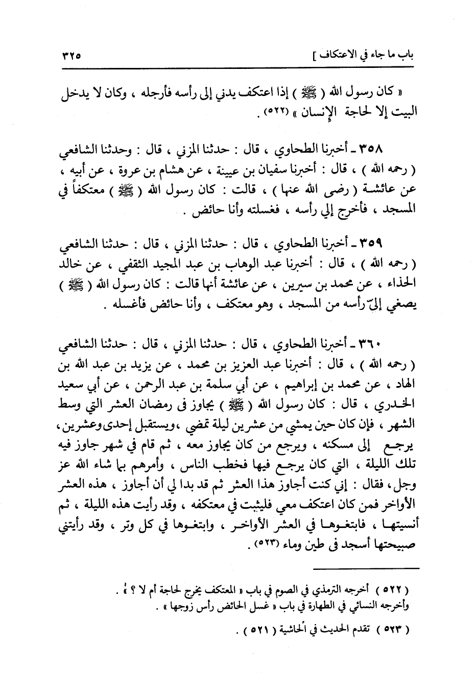 أَنْبَأَنَا سُفْيَانُ بْنُ عُيَيْنَةَ، عَنْ هِشَامِ بْنِ عُرْوَةَ، عَنْ أَبِيهِ، عَنْ عَائِشَةَ، رَضِيَ اللَّهُ عَنْهَا قَالَتْ: كَانَ رَسُولُ اللَّهِ صَلَّى اللهُ عَلَيْهِ وَسَلَّمَ مُعْتَكِفًا فِي الْمَسْجِدِ فَأَخْرَجَ إِلَيَّ رَأْسَهُ فَغَسَلْتُهُ وَأَنَا حَائِضٌ "
