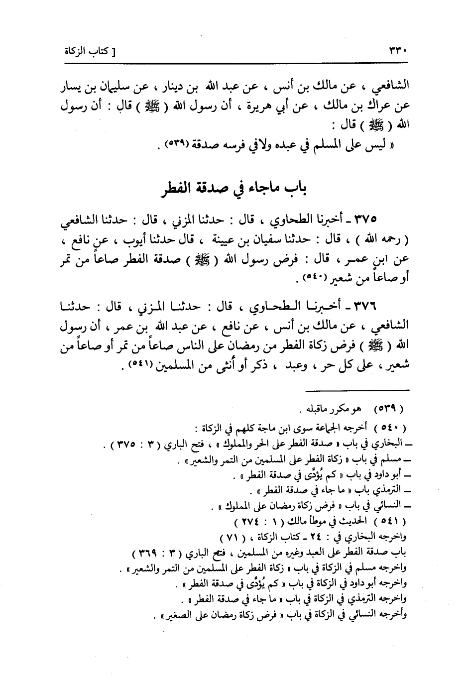 عَنْ مَالِكِ بْنِ أَنَسٍ، عَنْ نَافِعٍ، عَنْ عَبْدِ اللَّهِ بْنِ عُمَرَ، أَنَّ رَسُولَ اللَّهِ صَلَّى اللهُ عَلَيْهِ وَسَلَّمَ فَرَضَ زَكَاةَ الْفِطْرِ مِنْ رَمَضَانَ عَلَى النَّاسِ صَاعًا مِنْ تَمْرٍ أَوْ صَاعًا مِنْ شَعِيرٍ عَلَى كُلِّ حُرٍّ وَعَبْدٍ ذَكَرٍ أَوْ أُنْثَى مِنَ الْمُسْلِمِينَ