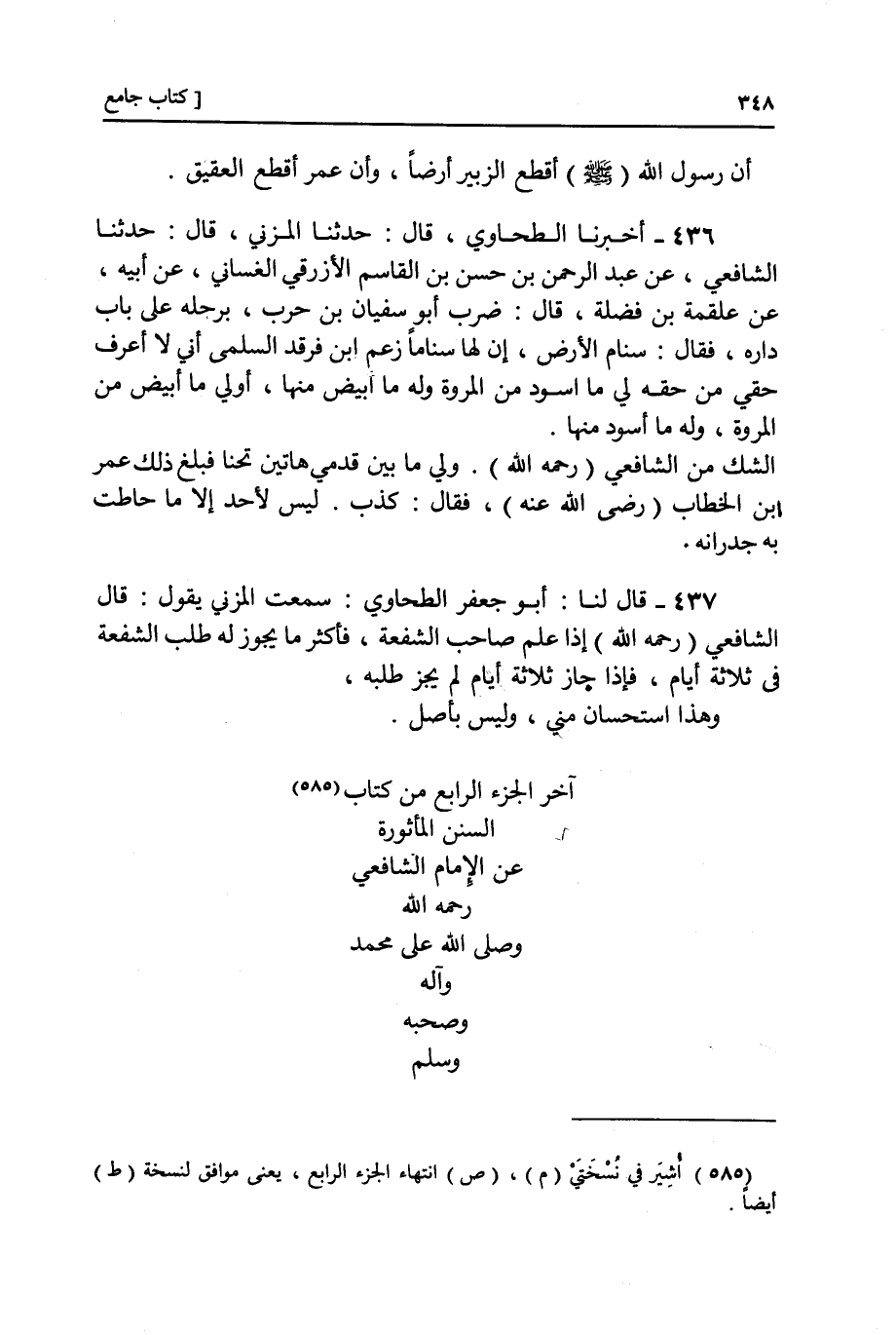 ٤٣٧ - قَالَ لَنَا أَبُو جَعْفَرٍ الطَّحَاوِيُّ: سَمِعْتُ الْمُزَنِيَّ يَقُولُ: قَالَ الشَّافِعِيُّ رَحِمَهُ اللَّهُ: إِذَا عَلِمَ صَاحِبَ الشُّفْعَةِ فَأَكْثَرُ مَا يَجُوزُ لَهُ طَلَبُ الشُّفْعَةِ فِي ثَلَاثَةِ أَيَّامٍ فَإِذَا جَاوَزَ ثَلَاثَةَ أَيَّامٍ لَمْ يَجُزْ طَلَبُهُ، وَهَذَا اسْتِحْسَانٌ مِنِّي وَلَيْسَ بِأَصْلٍ