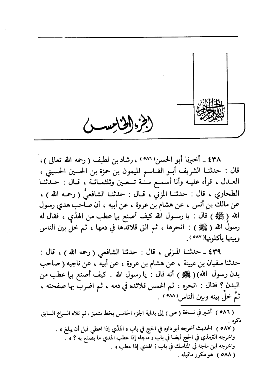 ٤٣٩ - عَنْ سُفْيَانَ بْنِ عُيَيْنَةَ، عَنْ هِشَامِ بْنِ عُرْوَةَ، عَنْ أَبِيهِ، عَنْ نَاجِيَةَ، صَاحِبِ بُدْنِ رَسُولِ اللَّهِ صَلَّى اللهُ عَلَيْهِ وَسَلَّمَ أَنَّهُ قَالَ: يَا رَسُولَ اللَّهِ كَيْفَ أَصْنَعُ بِمَا عَطِبَ مِنَ الْبُدْنِ؟ فَقَالَ: «انْحَرْهُ ثُمَّ اغْمِسْ قَلَائِدَهُ فِي دَمِهِ ثُمَّ اضْرِبْ بِهَا صَفْحَتَهُ ثُمَّ خَلِّ بَيْنَهُ وَبَيْنَ النَّاسِ»
