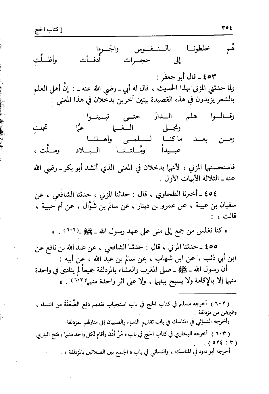 ٤٥٤ - حَدَّثَنَا سُفْيَانُ بْنُ عُيَيْنَةَ، عَنْ عَمْرِو بْنِ دِينَارٍ، عَنْ سَالِمِ بْنِ شَوَّالٍ، عَنْ أُمِّ حَبِيبَةَ، قَالَتْ: كُنَّا نُغَلِّسُ مِنْ جَمْعٍ إِلَى مِنًى عَلَى عَهْدِ رَسُولِ اللَّهِ صَلَّى اللهُ عَلَيْهِ وَسَلَّمَ "