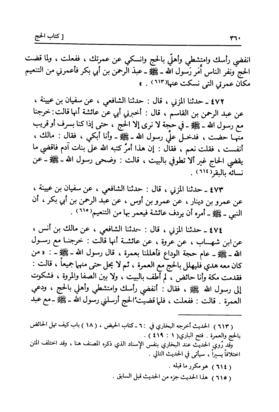 ٤٧٤ - عَنْ سُفْيَانَ بْنِ عُيَيْنَةَ، عَنْ عَبْدِ الرَّحْمَنِ بْنِ الْقَاسِمِ، قَالَ: أَخْبَرَنِي أَبِي، عَنْ عَائِشَةَ، أَنَّهَا قَالَتْ: خَرَجْنَا مَعَ رَسُولِ اللَّهِ صَلَّى اللهُ عَلَيْهِ وَسَلَّمَ فِي حَجَّتِهِ لَا نَرَى إِلَّا الْحَجَّ حَتَّى إِذَا كُنَّا بِسَرِفٍ أَوْ قَرِيبٍ مِنْهَا حِضْتُ فَدَخَلَ عَلَيَّ رَسُولُ اللَّهِ صَلَّى اللهُ عَلَيْهِ وَسَلَّمَ وَأَنَا أَبْكِي فَقَالَ: «مَا لَكَ أَنَفِسْتِ؟» فَقُلْتُ: نَعَمْ فَقَالَ: «إِنَّ هَذَا أَمْرٌ كَتَبَهُ اللَّهُ عَلَى بَنَاتِ آدَمَ فَاقْضِي مَا يَقْضِي الْحَاجُّ غَيْرَ أَلَّا تَطُوفِي بِالْبَيْتِ» قَالَتْ: وَضَحَّى رَسُولُ اللَّهِ صَلَّى اللهُ عَلَيْهِ وَسَلَّمَ عَنْ نِسَائِهِ بِالْبَقَرِ