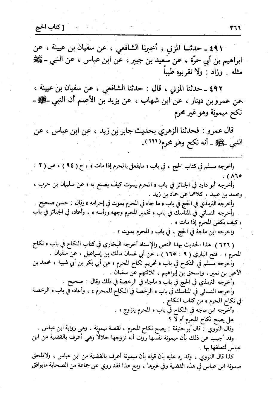 ٤٩٢ - عَنْ سُفْيَانَ بْنِ عُيَيْنَةَ، عَنْ عَمْرِو بْنِ دِينَارٍ، عَنِ ابْنِ شِهَابٍ، عَنْ يَزِيدَ بْنِ الْأَصَمِّ، «أَنَّ النَّبِيَّ صَلَّى اللهُ عَلَيْهِ وَسَلَّمَ» نَكَحَ مَيْمُونَةَ وَهِيَ خَالَتُهُ وَهُوَ غَيْرُ مُحْرِمٍ ". قَالَ عَمْرٌو: فَحَدَّثْتُ الزُّهْرِيَّ بِحَدِيثِ جَابِرِ بْنِ زَيْدٍ عَنِ ابْنِ عَبَّاسٍ عَنِ النَّبِيِّ صَلَّى اللهُ عَلَيْهِ وَسَلَّمَ أَنَّهُ نَكَحَ وَهُوَ مُحْرِمٌ ⦗٣٦٧⦘ فَقَالَ: حَدَّثَنِي يَزِيدُ بْنُ الْأَصَمِّ أَنَّ النَّبِيَّ صَلَّى اللهُ عَلَيْهِ وَسَلَّمَ نَكَحَ وَهُوَ غَيْرُ مُحْرِمٍ. قَالَ عَمْرٌو: فَقُلْتُ: وَمَا يَدْرِي يَزِيدَ وَهُوَ أَعْرَابِيٌّ بَوَّالٌ؟ أَتَجْعَلَهُ إِلَى ابْنِ عَبَّاسٍ؟