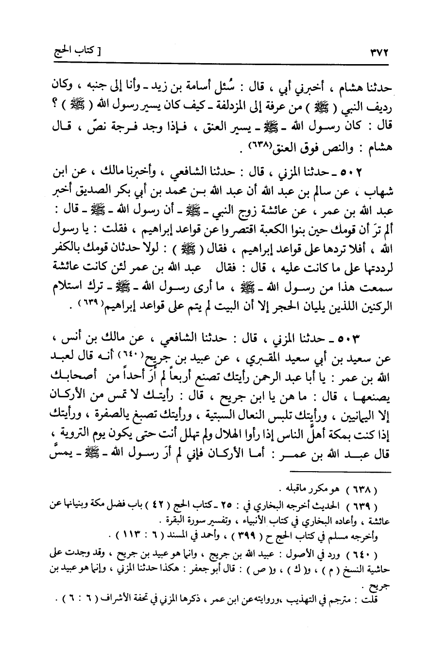 ٥٠٢ - أَنْبَأَنَا مَالِكُ بْنُ أَنَسٍ، عَنِ ابْنِ شِهَابٍ، عَنْ سَالِمِ بْنِ عَبْدِ اللَّهِ، أَنَّ عَبْدَ اللَّهِ بْنَ مُحَمَّدِ بْنِ أَبِي بَكْرٍ الصِّدِّيقِ، رَضِيَ اللَّهُ عَنْهُ أَخْبَرَ عَبْدَ اللَّهِ بْنَ عُمَرَ، عَنْ عَائِشَةَ، رَضِيَ اللَّهُ عَنْهَا زَوْجِ النَّبِيِّ صَلَّى اللهُ عَلَيْهِ وَسَلَّمَ أَنَّ رَسُولَ اللَّهِ صَلَّى اللهُ عَلَيْهِ وَسَلَّمَ قَالَ: «أَلَمْ تَرَيْ أَنَّ قَوْمَكِ حِينَ بَنَوَا الْكَعْبَةَ اقْتَصَرُوا عَنْ قَوَاعِدِ إِبْرَاهِيمَ عَلَيْهِ السَّلَامُ؟» فَقُلْتُ: يَا رَسُولَ اللَّهِ أَفَلَا تَرُدُّهَا عَلَى قَوَاعِدِ إِبْرَاهِيمَ؟ فَقَالَ صَلَّى اللهُ عَلَيْهِ وَسَلَّمَ: «لَوْلَا حِدْثَانُ قَوْمِكِ بِالْكُفْرِ لَرَدَدْتُهَا عَلَى مَا كَانَتْ عَلَيْهِ» قَالَ: فَقَالَ عَبْدُ اللَّهِ بْنُ عُمَرَ: لَئِنْ كَانَتْ عَائِشَةُ سَمِعَتْ هَذَا مِنْ رَسُولِ اللَّهِ صَلَّى اللهُ عَلَيْهِ وَسَلَّمَ مَا أَرَى رَسُولَ اللَّهِ صَلَّى اللهُ عَلَيْهِ وَسَلَّمَ تَرَكَ اسْتِلَامَ الرُّكْنَيْنِ اللَّذَيْنِ يَلِيَانِ الْحَجَرَ إِلَّا أَنَّ الْبَيْتَ لَمْ يُتَمَّمْ عَلَى قَوَاعِدِ إِبْرَاهِيمَ عَلَيْهِ السَّلَامُ
