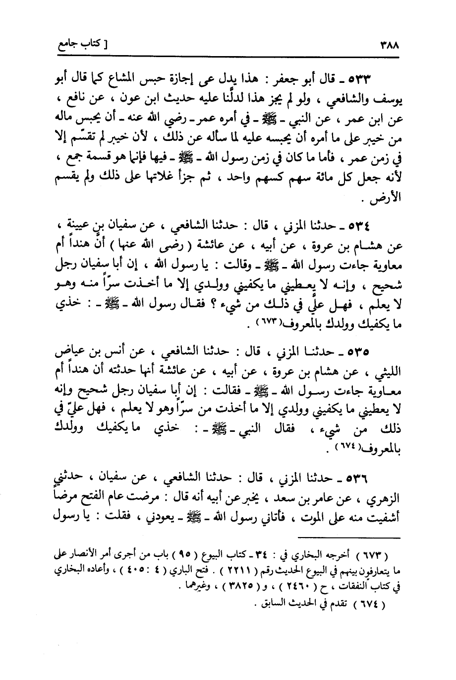٥٣٤ - عَنْ سُفْيَانَ بْنِ عُيَيْنَةَ، عَنْ هِشَامِ بْنِ عُرْوَةَ، عَنْ أَبِيهِ، عَنْ عَائِشَةَ، رَضِيَ اللَّهُ عَنْهَا أَنَّ هِنْدًا، أُمَّ مُعَاوِيَةَ قَالَتْ: يَا رَسُولَ اللَّهِ، إِنَّ أَبَا سُفْيَانَ رَجُلٌ شَحِيحٌ، وَلَيْسَ لِي مِنْهُ إِلَّا مَا أَدْخَلَ عَلَيَّ، فَقَالَ لَهَا رَسُولُ اللَّهِ صَلَّى اللهُ عَلَيْهِ وَسَلَّمَ: «خُذِي مَا يَكْفِيكِ وَوَلَدَكِ بِالْمَعْرُوفِ»