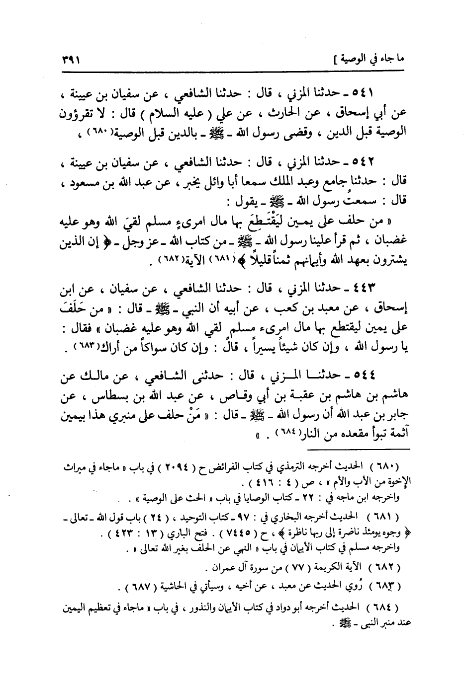 ٥٤٢ - عَنْ سُفْيَانَ بْنِ عُيَيْنَةَ، حَدَّثَنَا جَامِعٌ، وَعَبْدُ الْمَلِكِ، سَمِعَا أَبَا وَائِلٍ، يُخْبِرُ عَنْ عَبْدِ اللَّهِ بْنِ مَسْعُودٍ، قَالَ: سَمِعْتُ رَسُولَ اللَّهِ صَلَّى اللهُ عَلَيْهِ وَسَلَّمَ يَقُولُ: «مَنْ حَلَفَ عَلَى يَمِينٍ لِيَقْتَطِعَ بِهَا مَالَ امْرِئٍ مُسْلِمٍ لَقِيَ اللَّهَ وَهُوَ عَلَيْهِ غَضْبَانُ» ثُمَّ قَرَأَ عَلَيْنَا رَسُولُ اللَّهِ صَلَّى اللهُ عَلَيْهِ وَسَلَّمَ مِنْ كِتَابِ اللَّهِ {إِنَّ الَّذِينَ يَشْتَرُونَ بِعَهْدِ اللَّهِ وَأَيْمَانِهِمْ ثَمَنًا قَلِيلًا} [آل عمرَان: ٧٧] الْآيَةَ "