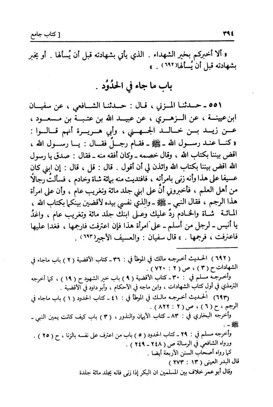 ٥٥١ - عَنْ سُفْيَانَ بْنِ عُيَيْنَةَ، عَنِ الزُّهْرِيِّ، عَنْ عُبَيْدِ اللَّهِ بْنِ عَبْدِ اللَّهِ بْنِ عُتْبَةَ بْنِ مَسْعُودٍ، عَنْ زَيْدِ بْنِ خَالِدٍ الْجُهَنِيِّ، وَأَبِي هُرَيْرَةَ وَشِبْلٍ أَنَّهُمْ كَانُوا عِنْدَ رَسُولِ اللَّهِ صَلَّى اللهُ عَلَيْهِ وَسَلَّمَ فَقَامَ رَجُلٌ فَقَالَ: يَا رَسُولَ اللَّهِ اقْضِ بَيْنَنَا بِكِتَابِ اللَّهِ، وَقَالَ خَصْمُهُ: وَكَانَ أفْقَهَ مِنْهُ صَدَقَ يَا رَسُولَ اللَّهِ اقْضِ بَيْنَنَا بِكِتَابِ اللَّهِ وَأْذَنْ لِي أَنْ أَقُولَ، قَالَ: «قُلْ» قَالَ: إِنَّ ابْنِيَ كَانَ عَسِيفًا عَلَى هَذَا وَإِنَّهُ زَنَى بِامْرَأَتِهِ فَافْتَدَيْتُ مِنْهُ بِمِائَةِ شَاةٍ وَخَادِمٍ فَسَأَلْتُ رِجَالًا مِنْ أَهْلِ الْعِلْمِ فَأَخْبَرُونِي أَنَّ عَلَى ابْنِي جَلْدَ مِائَةٍ وَتَغْرِيبَ عَامٍ وَأَنَّ عَلَى امْرَأَةِ هَذَا الرَّجْمَ فَقَالَ النَّبِيُّ صَلَّى اللهُ عَلَيْهِ وَسَلَّمَ: " وَالَّذِي نَفْسِي بِيَدِهِ لَأَقْضِيَنَّ بَيْنَكُمَا بِكِتَابِ اللَّهِ: الْمِائَةُ الشَّاةِ وَالْخَادِمُ رَدٌّ عَلَيْكَ وَعَلَى ابْنِكَ جَلْدُ مِائَةٍ وَتَغْرِيبُ عَامٍ وَاغْدُ يَا أُنَيْسُ لِرَجُلٍ مِنْ أَسْلَمَ عَلَى امْرَأَةِ هَذَا فَإِنِ اعْتَرَفَتْ فَارْجُمْهَا " فَغَدَا عَلَيْهَا فَاعْتَرَفَتْ فَرَجَمَهَا. قَالَ سُفْيَانُ: وَالْعَسِيفُ: الْأَجِيرُ