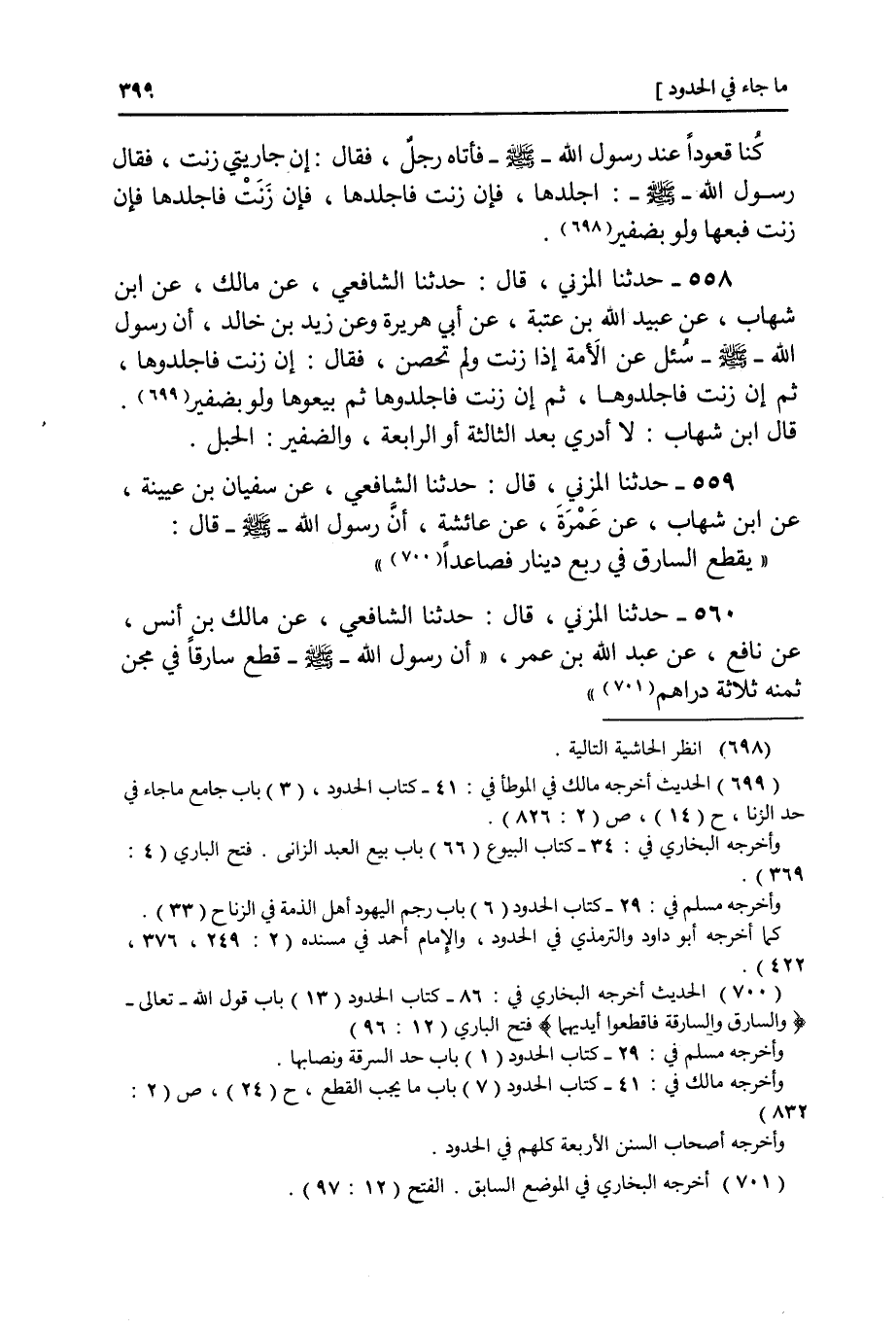 ٥٥٨ - عَنْ مَالِكٍ، عَنِ ابْنِ شِهَابٍ، عَنْ عُبَيْدِ اللَّهِ بْنِ عَبْدِ اللَّهِ بْنِ عُتْبَةَ، عَنْ أَبِي هُرَيْرَةَ، وَعَنْ زَيْدِ بْنِ خَالِدٍ، أَنَّ رَسُولَ اللَّهِ صَلَّى اللهُ عَلَيْهِ وَسَلَّمَ سُئِلَ عَنِ الْأَمَةِ إِذَا زَنَتْ وَلَمْ تُحْصَنْ فَقَالَ: «إِنْ زَنَتْ فَاجْلِدُوهَا ثُمَّ إِنْ زَنَتْ فَاجْلِدُوهَا ثُمَّ إِنْ زَنَتْ فَاجْلِدُوهَا ثُمَّ إِنْ زَنَتْ فَاجْلِدُوهَا ثُمَّ بِيعُوهَا وَلَوْ بِضَفِيرٍ» . قَالَ ابْنُ شِهَابٍ: لَا أَدْرِي بَعْدَ الثَّالِثَةِ أَوِ الرَّابِعَةِ، وَالضَّفِيرُ: الْحَبْلُ
