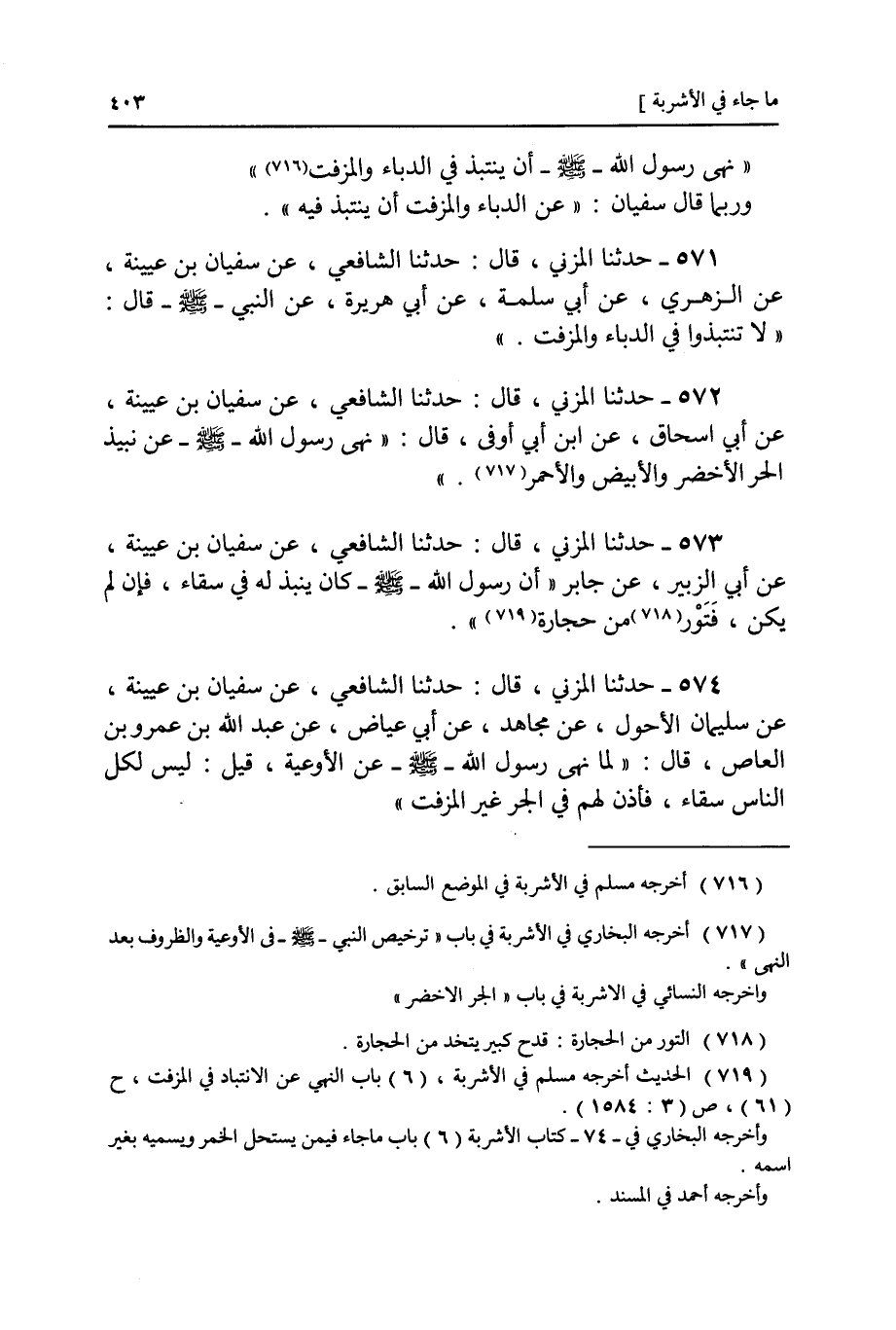٥٧١ - عَنْ سُفْيَانَ بْنِ عُيَيْنَةَ، عَنِ الزُّهْرِيِّ، عَنْ أَبِي سَلَمَةَ، عَنْ أَبِي هُرَيْرَةَ، عَنِ النَّبِيِّ صَلَّى اللهُ عَلَيْهِ وَسَلَّمَ قَالَ: «لَا تَنْتَبِذُوا فِي الدُّبَّاءِ وَالْمُزَفَّتِ»